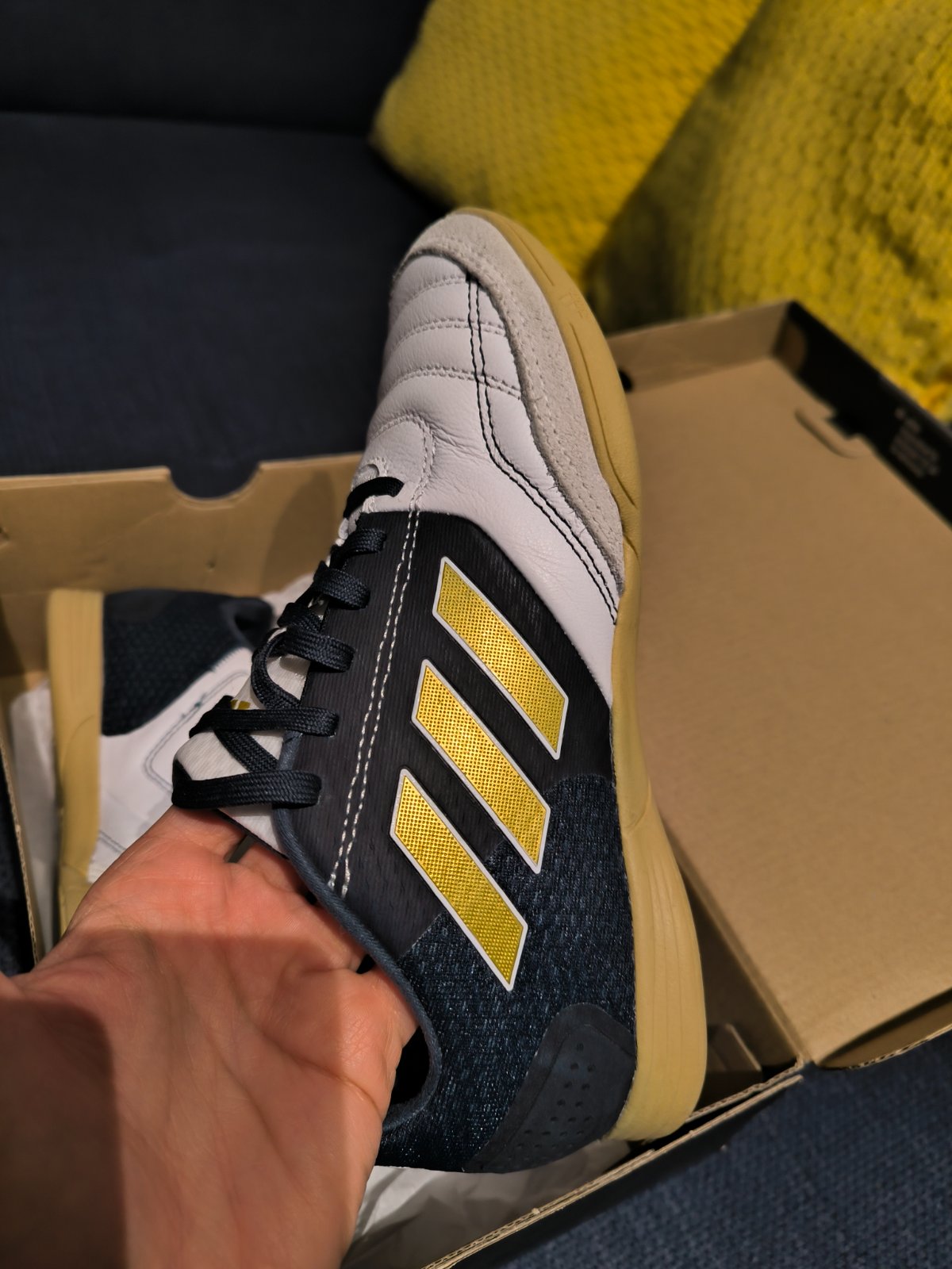 Predam parkrat obute kozene halovky vhodne pre dievca i chlapca. Kombinacia farieb bielej a tmavomodrej so zlatymi adidas ciarami. Velkost to je 36 2/3.