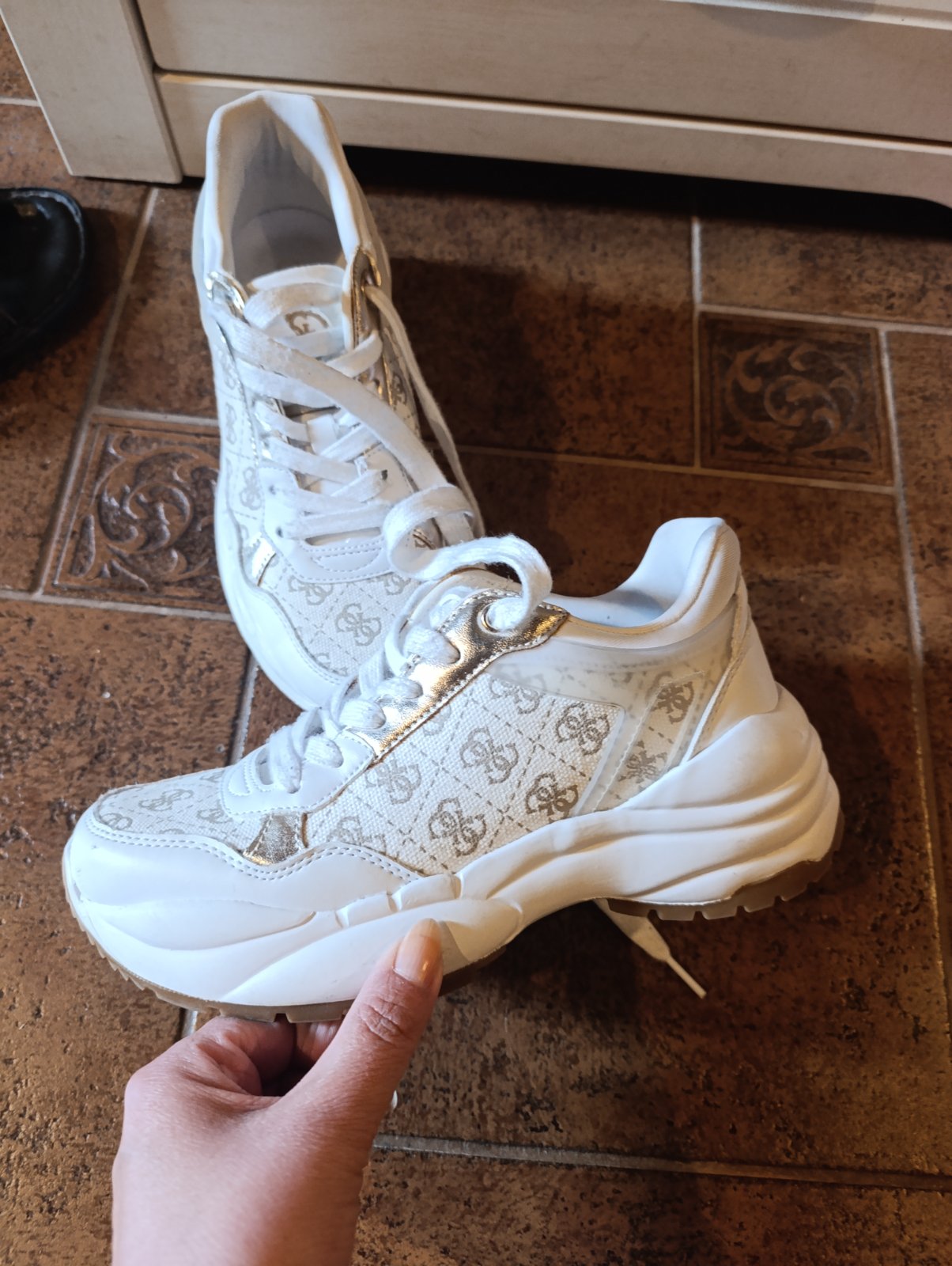 Dokonalé tenisky Guess, urobia super výšku 👌🏼. Malo nosené, viď fotky. Jediná chybička krásy na pravej fliacik, netuším od čoho, no presne ho zakrýva šnúrka. Šnúrky som vymenila, lepšie sa mi k nim ...