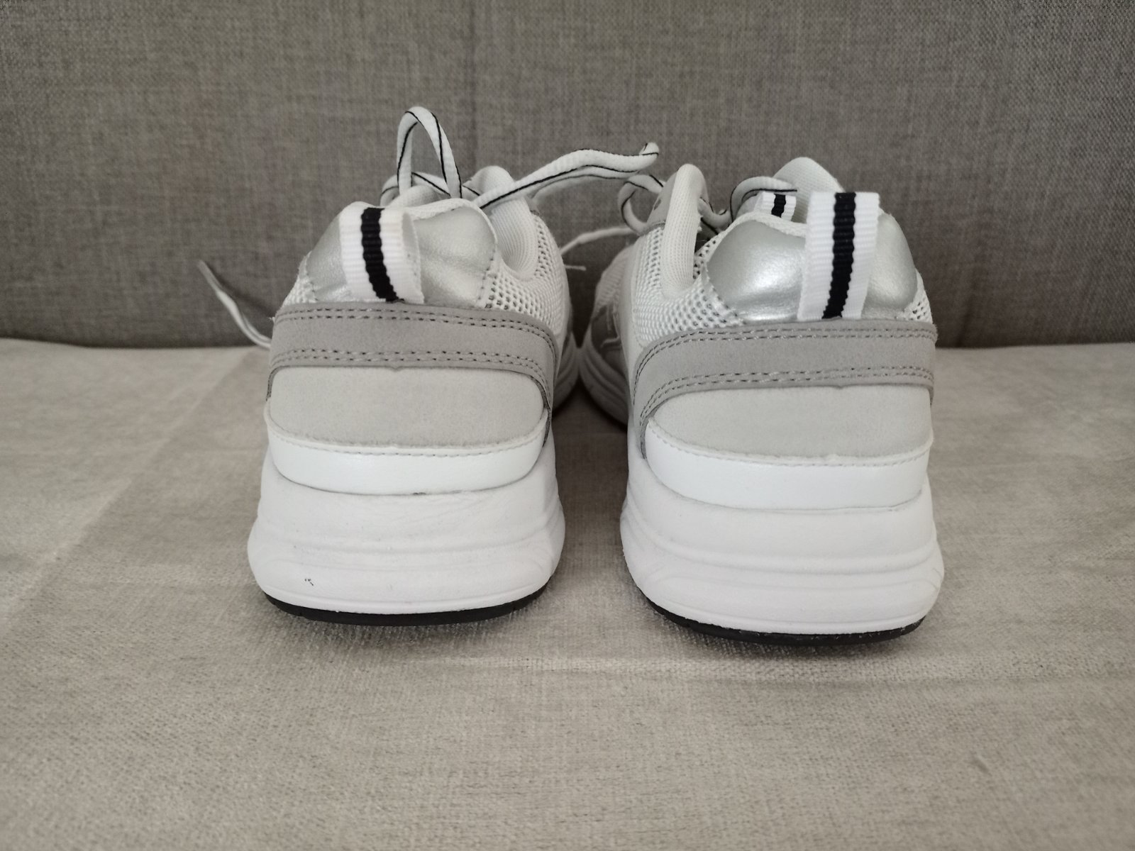 Biele tenisky - botasky s hrubou podrážkou - platformou. Strieborné detaily. maličké šuchnutie na jednej vpredu a ozdobný strieborný pásik dookola podrážky je na jednej úplne odlepený a chýba a na ...