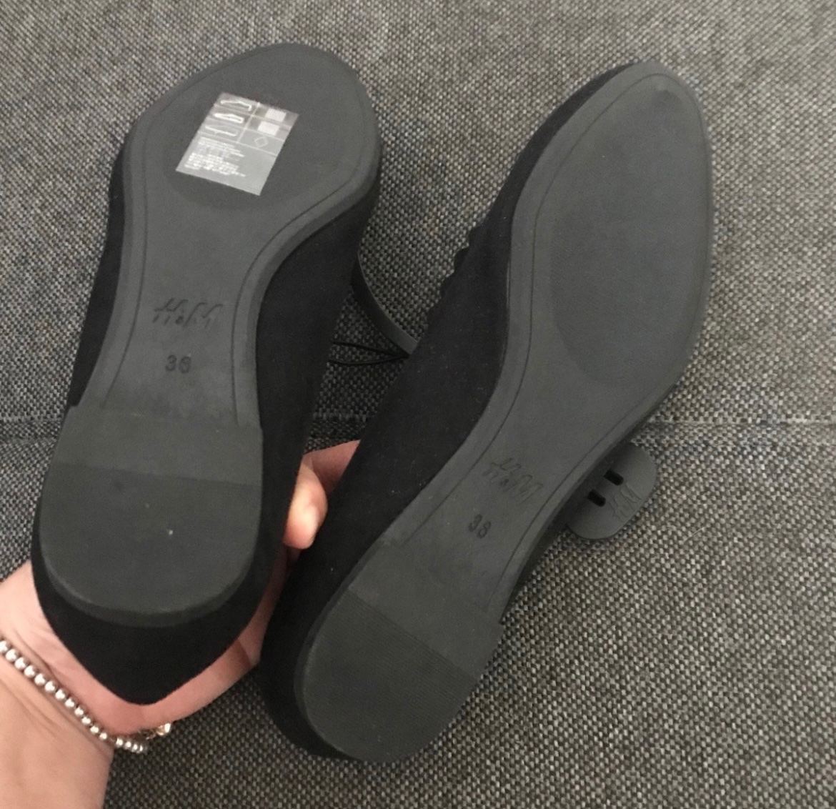 Čierne semišové baleriny, jednoduché, elegantné. Znacka H&M. Nosené, trošičku ošúchané špičky, no vidno to ozaj len z blízka. Viď detaily na fotkách. Inak v super stave. Ak máte nejaké otázky, ...