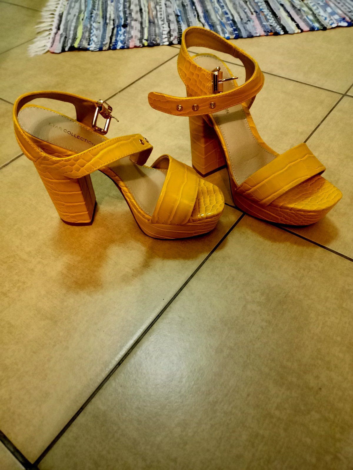 Predám dámske žlté sandále na podpätku, sú nové nenosené len raz vyskúšané. Veľkosť 37