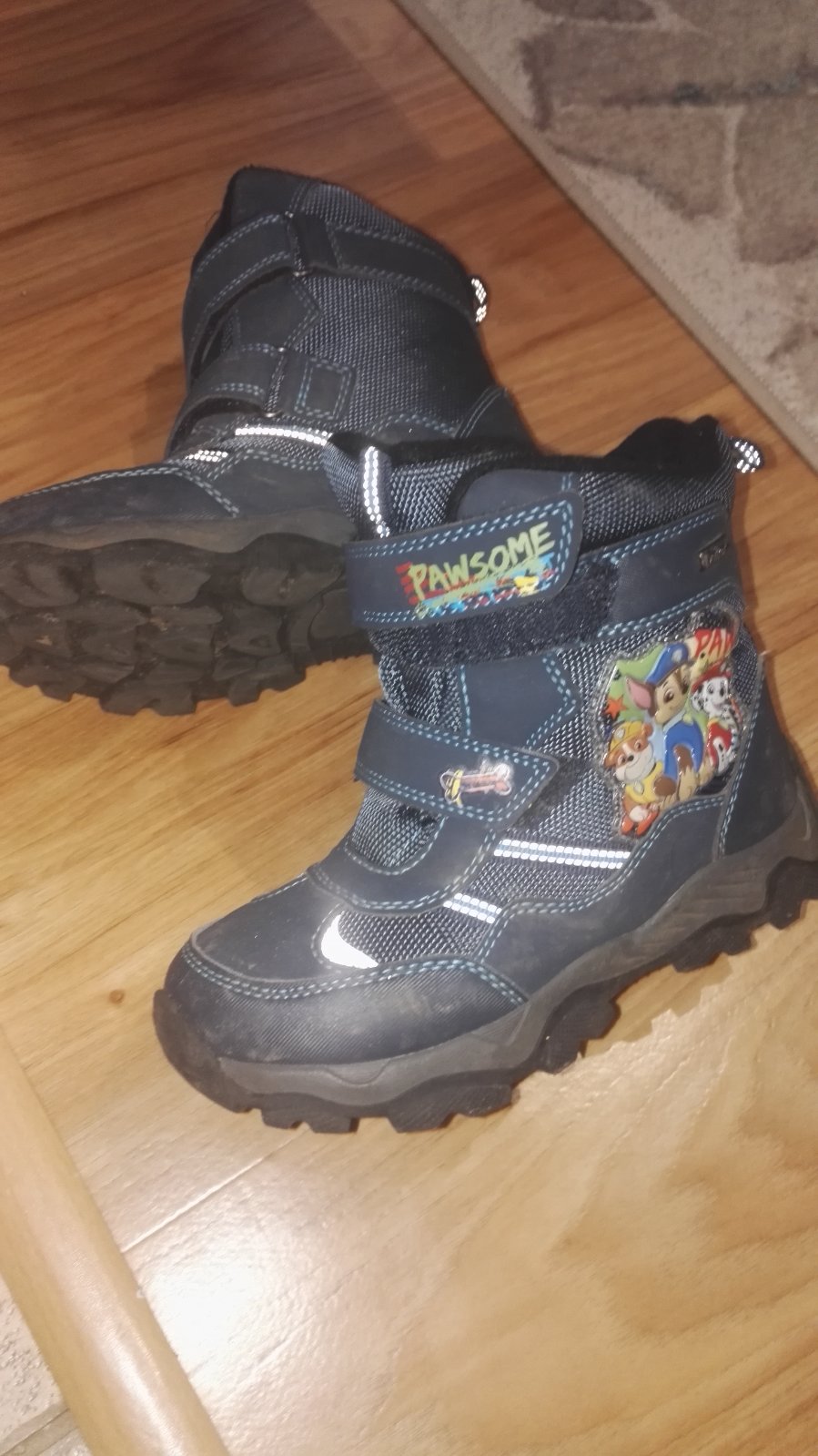 Zimné zateplené čižmičky, farba modrá/čierna, zapínanie na suchý zips, veľ. 30. Oškreté špice, inak funkčné.