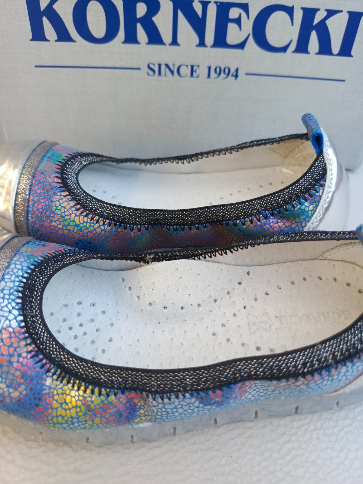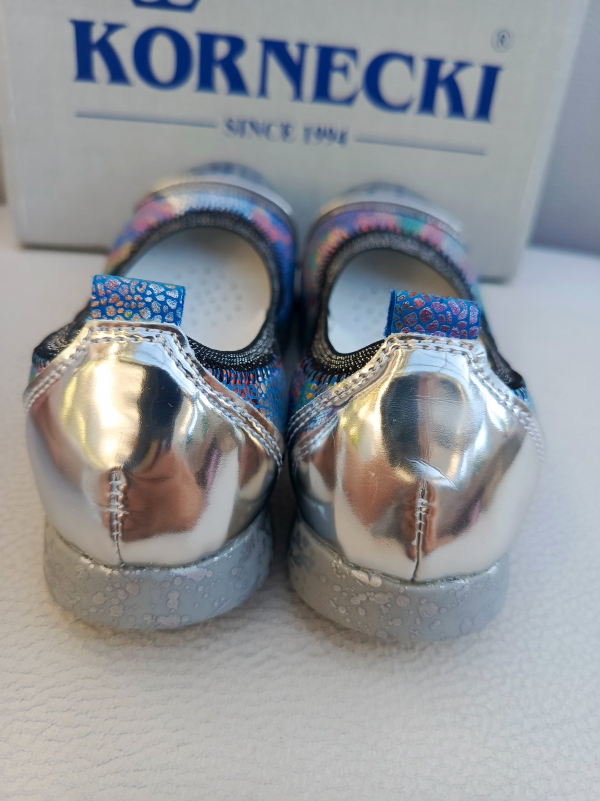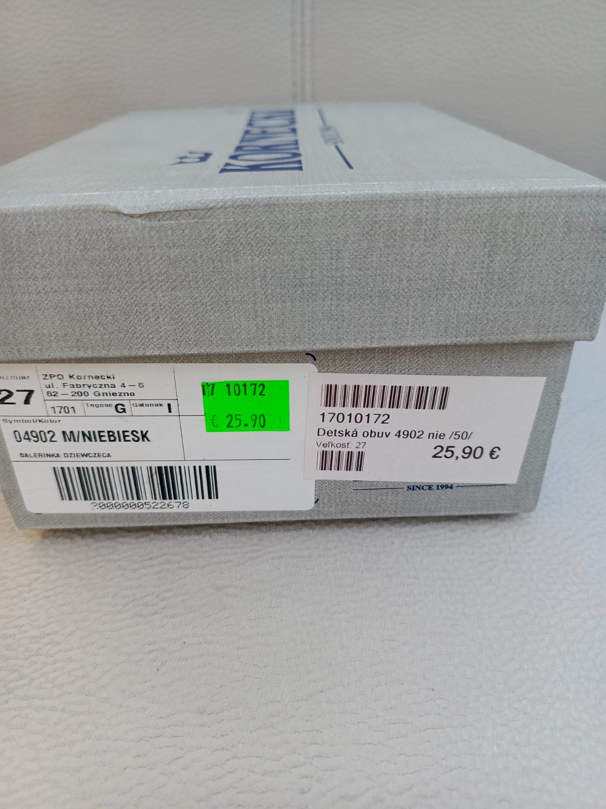 Dievčenské balerínky kvalitnej a obľúbenej značky Kornecki. Vnútro je kožené, čo dieťaťu zaručí prispôsobenie sa nohe a pohodlie pri nosení. Balerínky so všitou gumou po obvode krásne držia nohu. ...