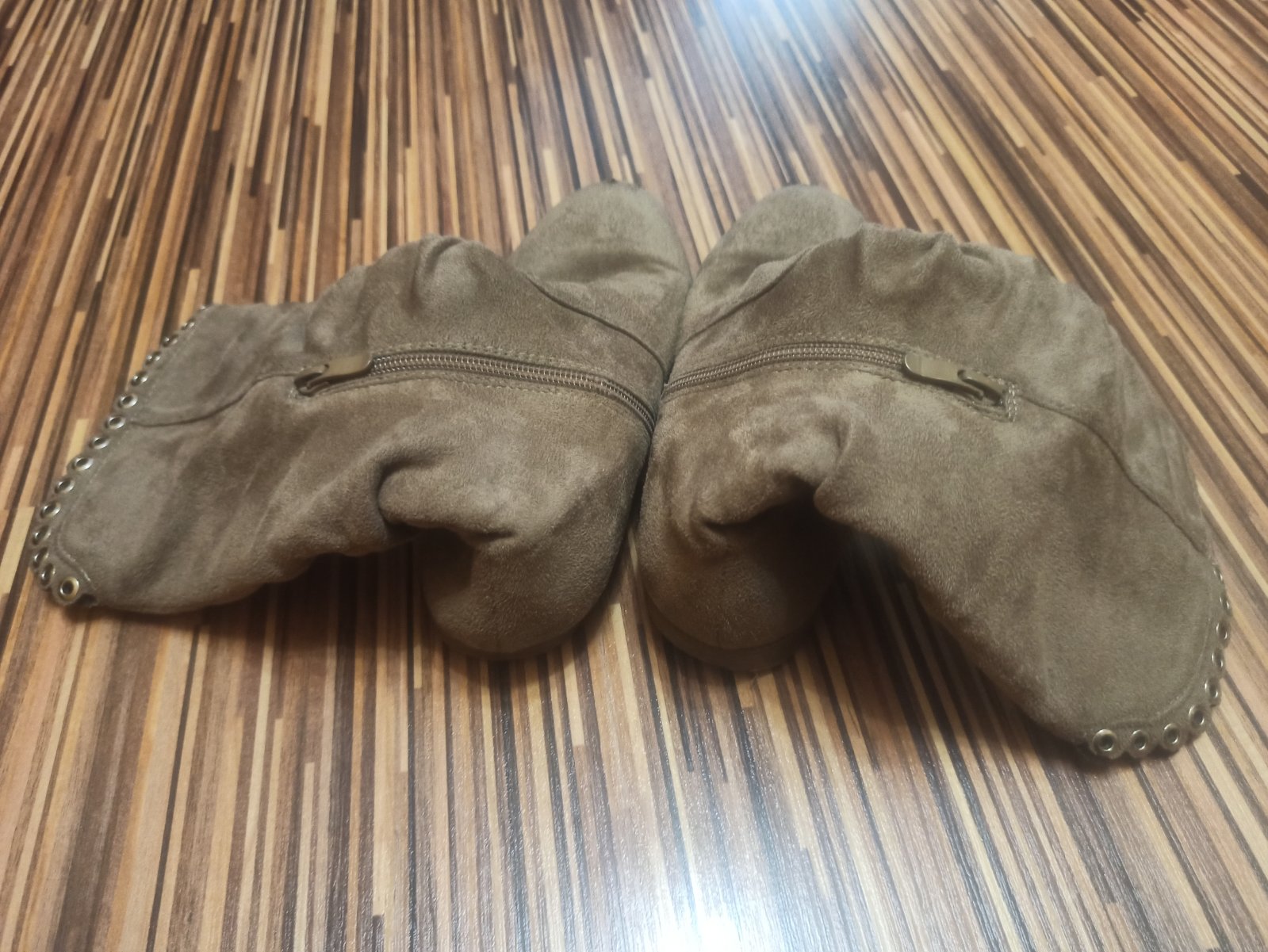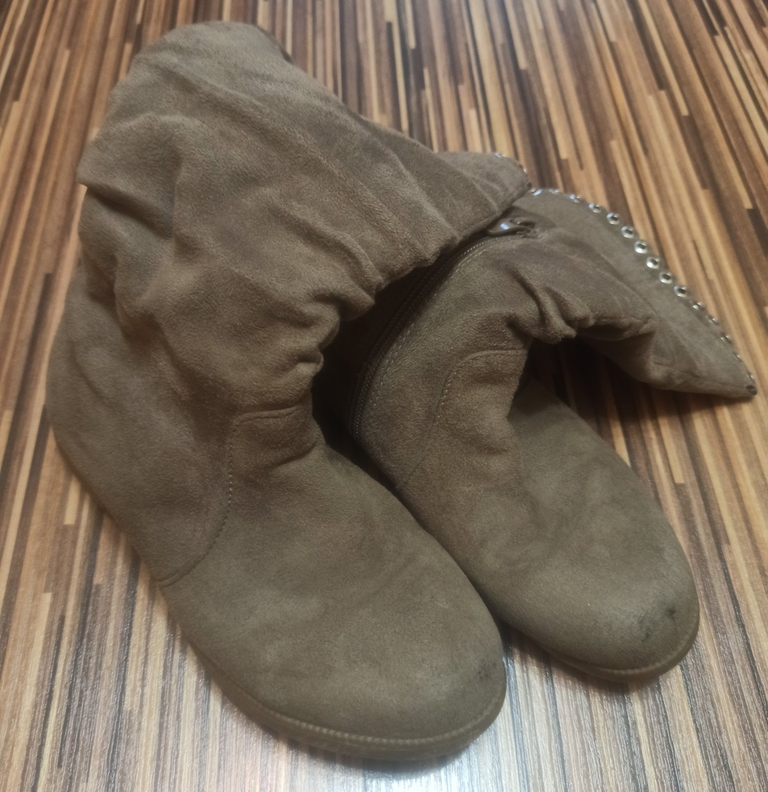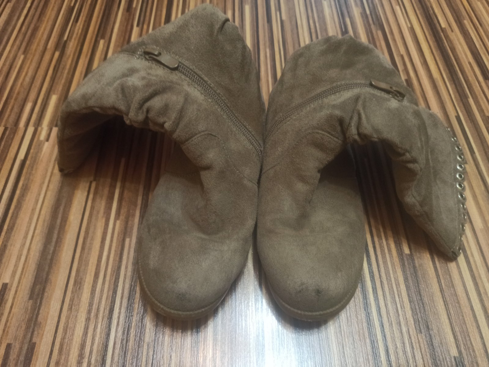 Textilne cizmicky,pekny noseny stav. Drobne suchnutie na lavej spicke.