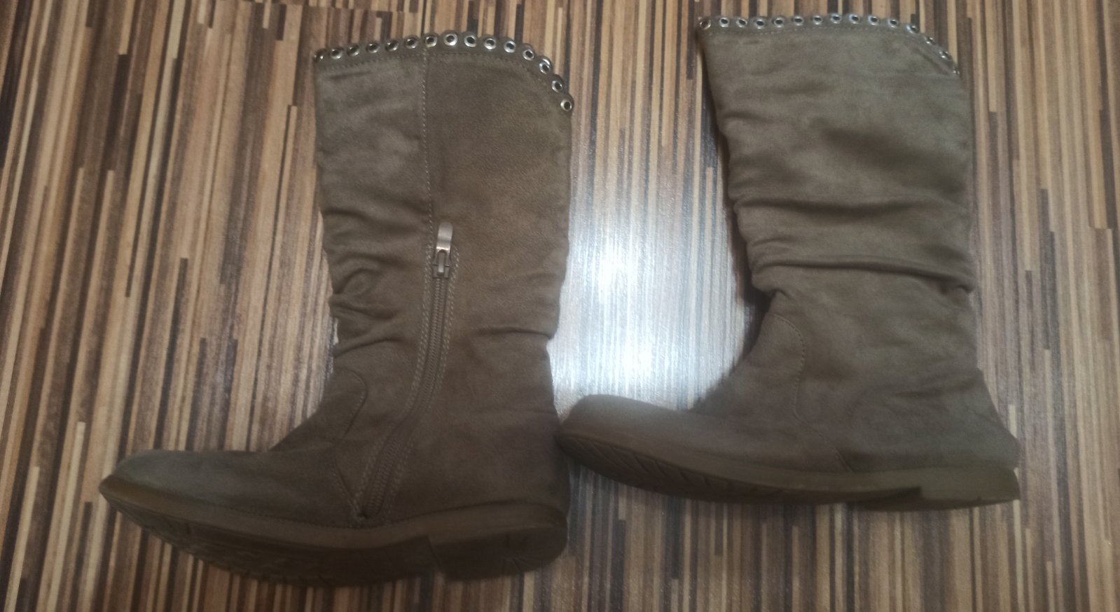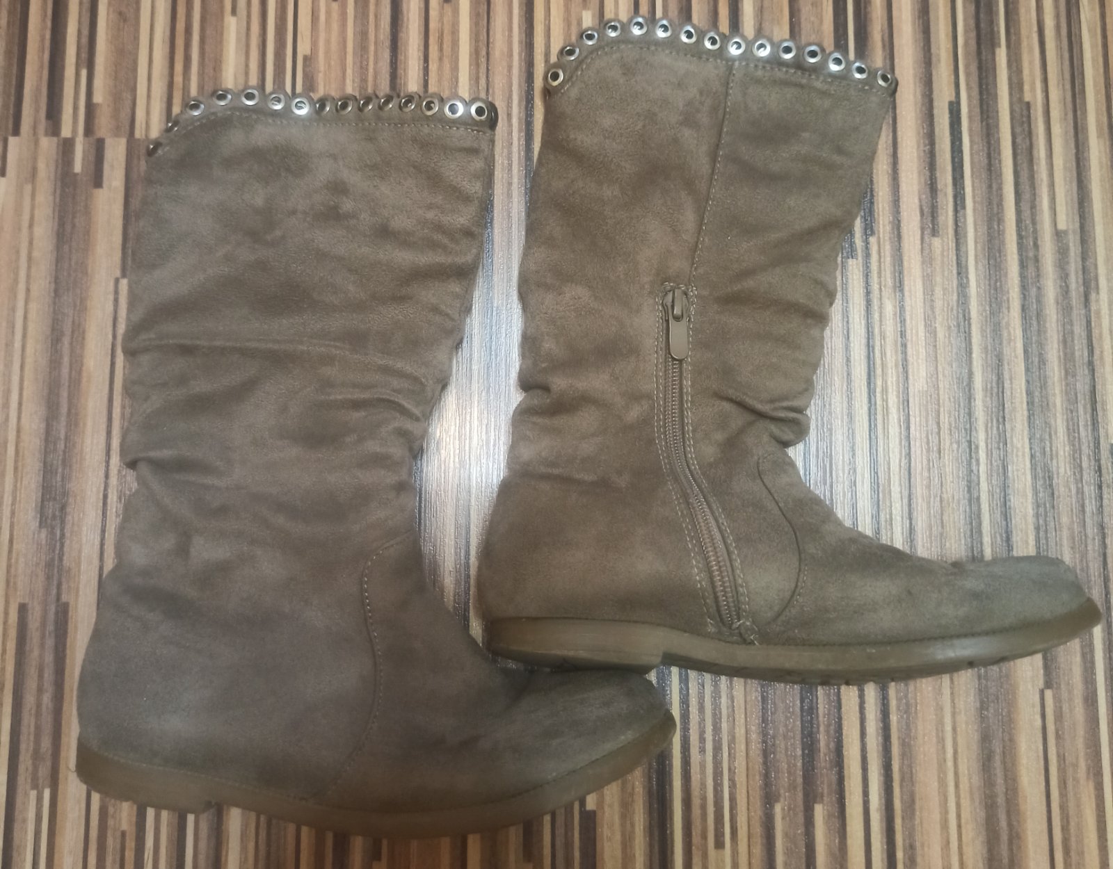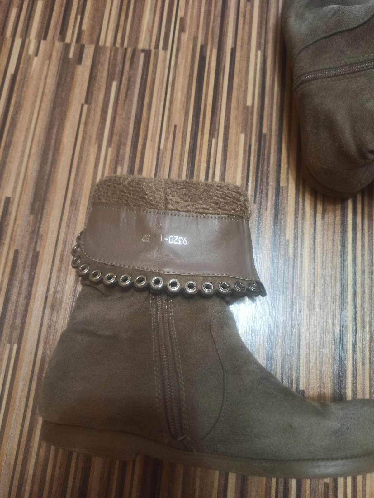 Textilne cizmicky,pekny noseny stav. Drobne suchnutie na lavej spicke.