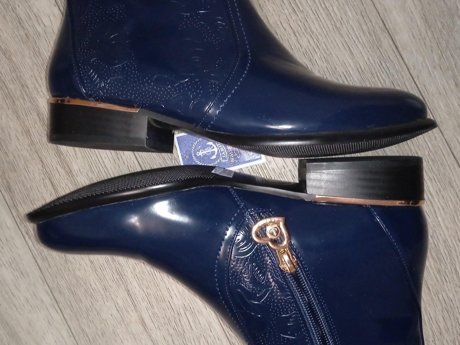 Ešte s visačkou a krabicou. Nepoškodené, nepoužívané lakované čižmy. Sú tmavomodré, až sa môžu javiť ako čierne.
