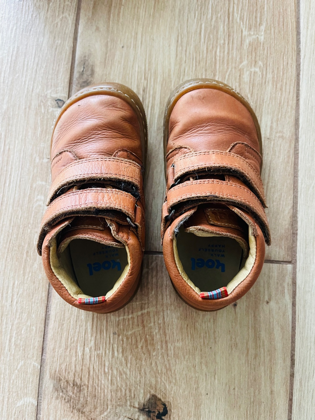 Celoročne kožené barefoot členkove boty. Nosené dvoma deťmi, sem tam šuchnutá koža, podrážky sú v poriadku. Pravidelne čistene a impregnované voskom na kožu. Dĺžka vložky 15,5 x 6,2 , meradlom vnutro vyšlo 15,3cm.