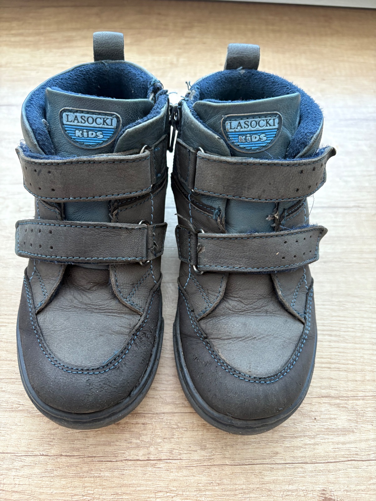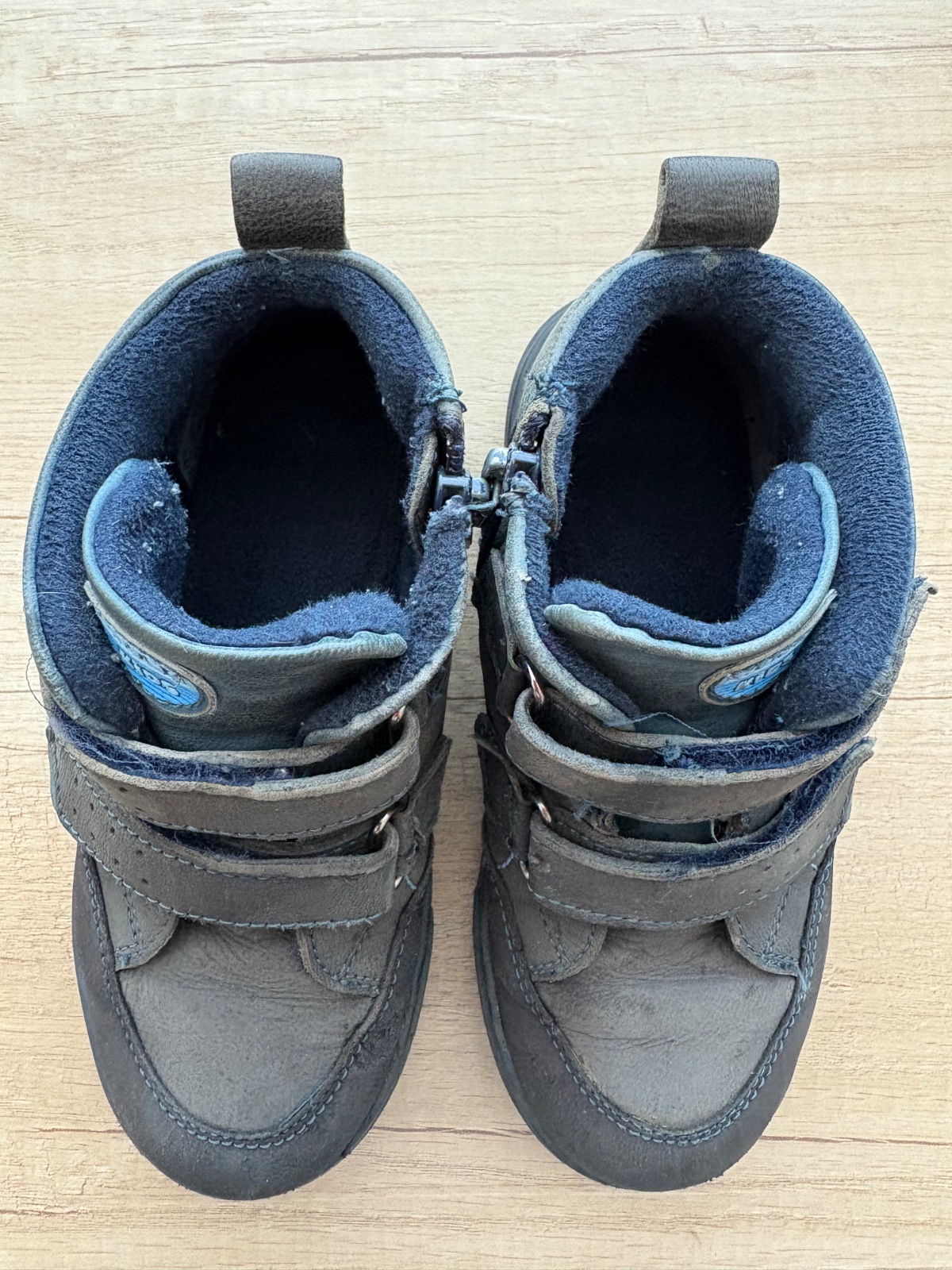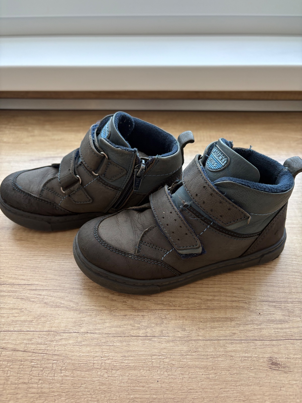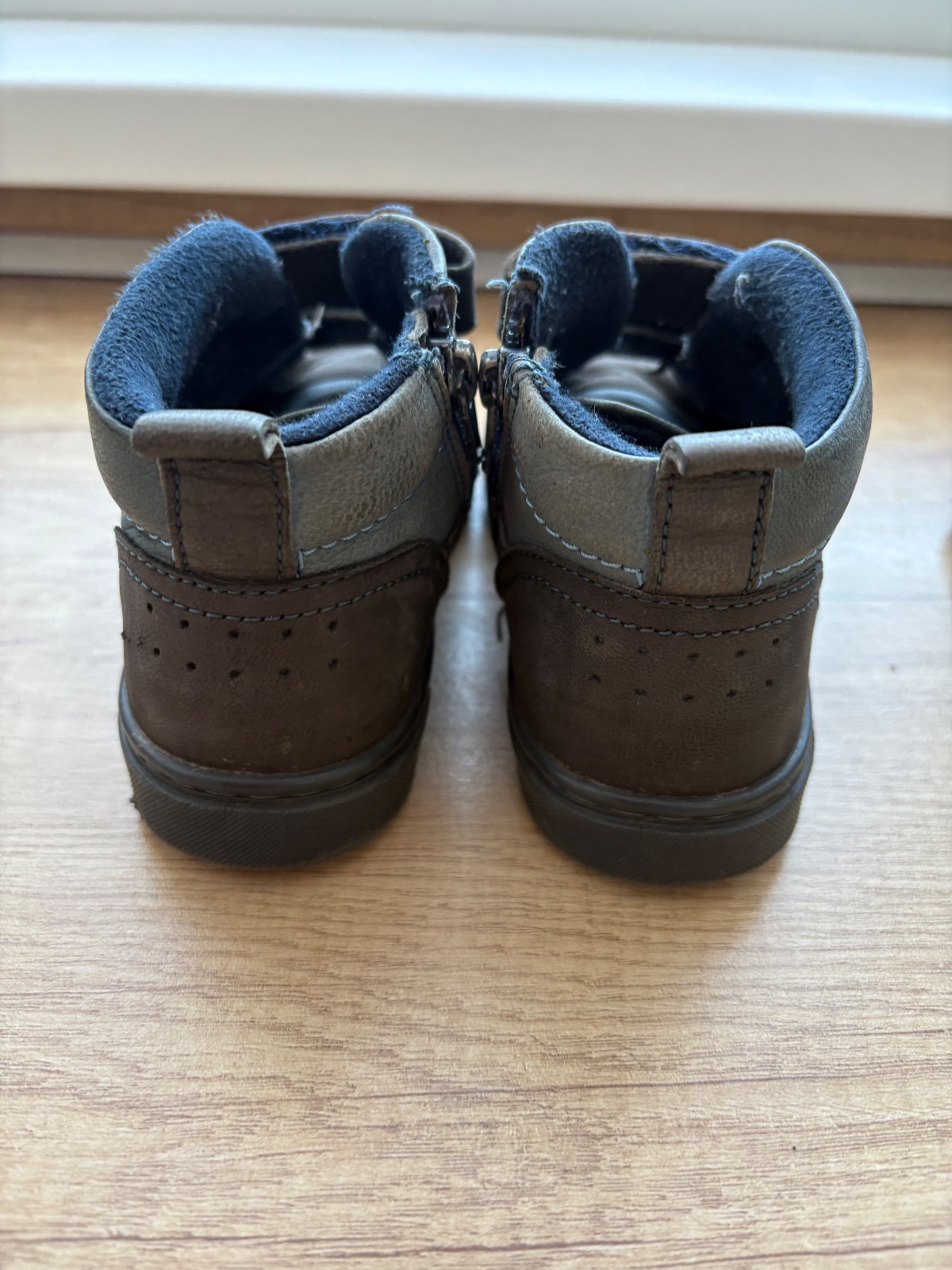 Predám chlapčenské jarné/jesenné vyššie topánočky. Kožené, veľmi pohodlné, farebne univerzálne - modro hnedé. Zapínanie na suchý zips, zipsy parádne držia. Bežne nosené, bez poškodení, známky bežné...