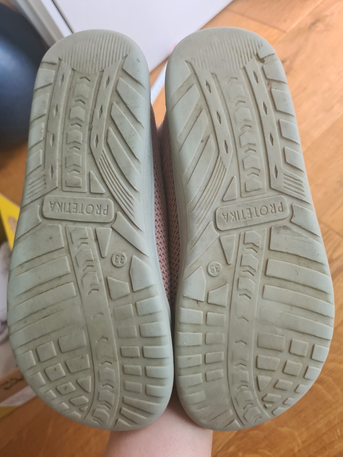 Textilné tenisky Protetika nosené len na telesnú. Na pravej topánke na vonkajšom okraji v ohybe a na ľavej topanke na vnútornom okraji v ohybe je podrážka jemne odlepená (vidno na fotkach). Iné poškodenie nemajú. Nosené boli bez vnútorných stielok, takže sú pekné čisté aj zvnútra.