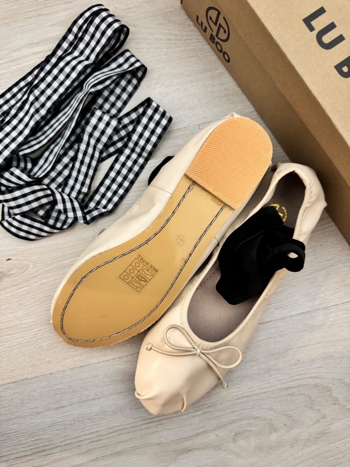 Jemné a ženské baleríny z Lu Boo. Topánky sú vyrobené z ekologickej kože. Tapingová stíha okolo hornej časti zabezpečí prispôsobenie sa nohe. Jedna stuha cierna ,druha kockovana . Stuha sa dá dať aj dole