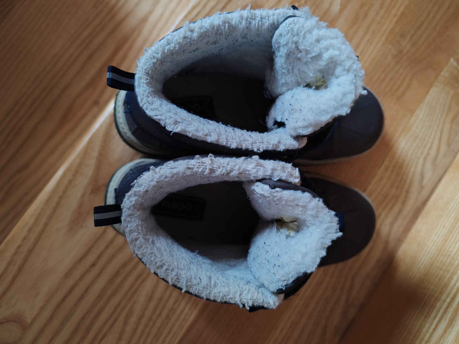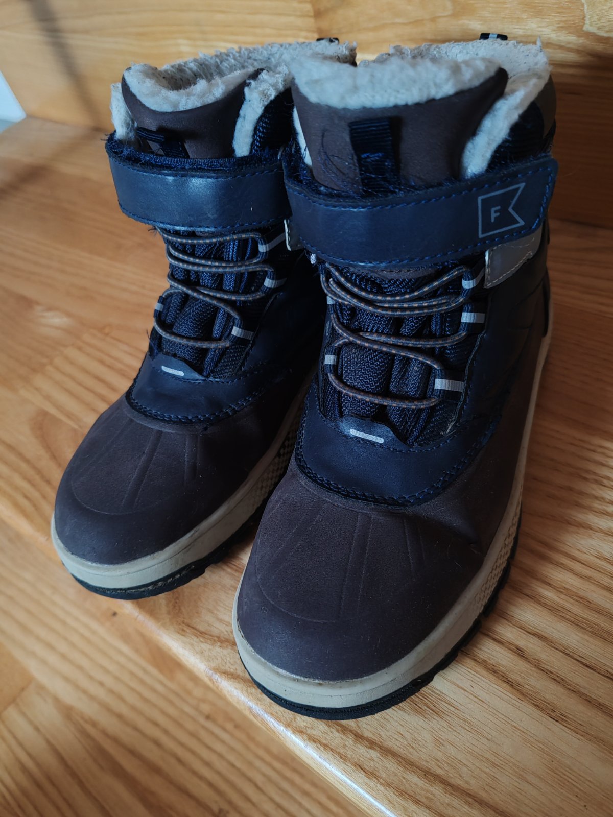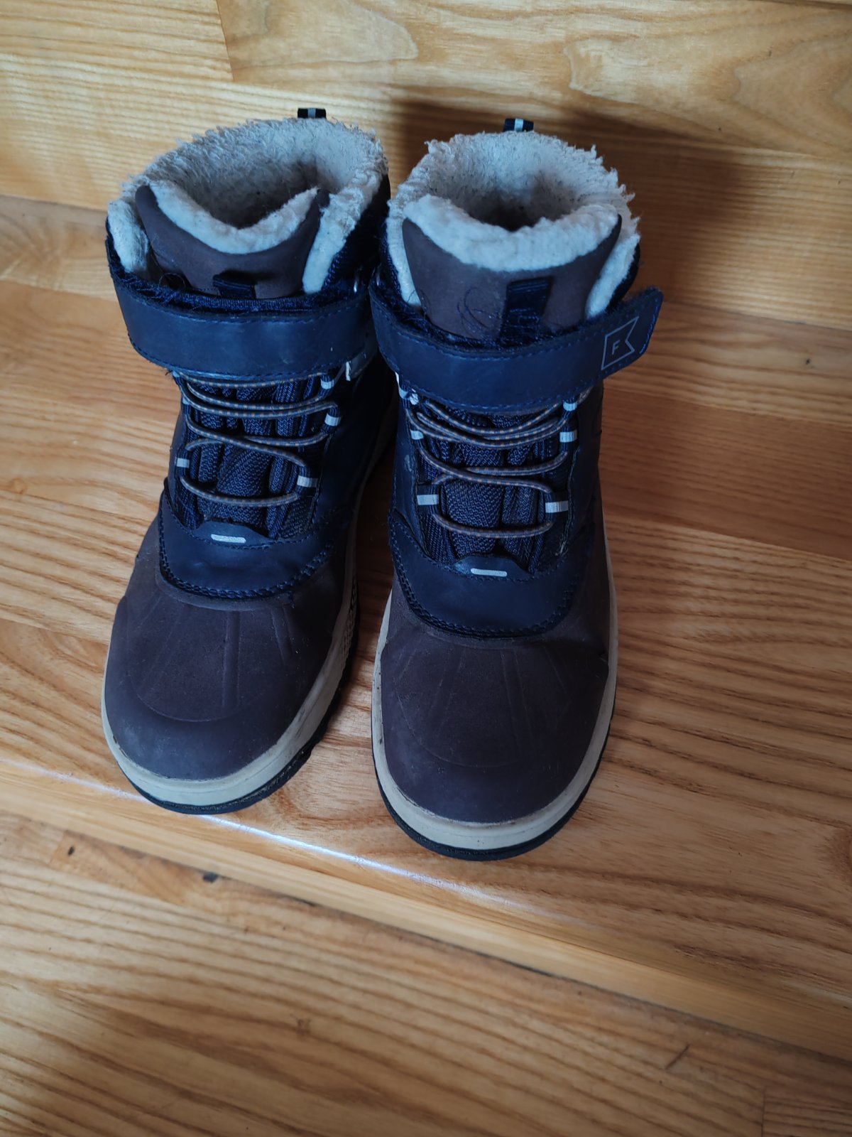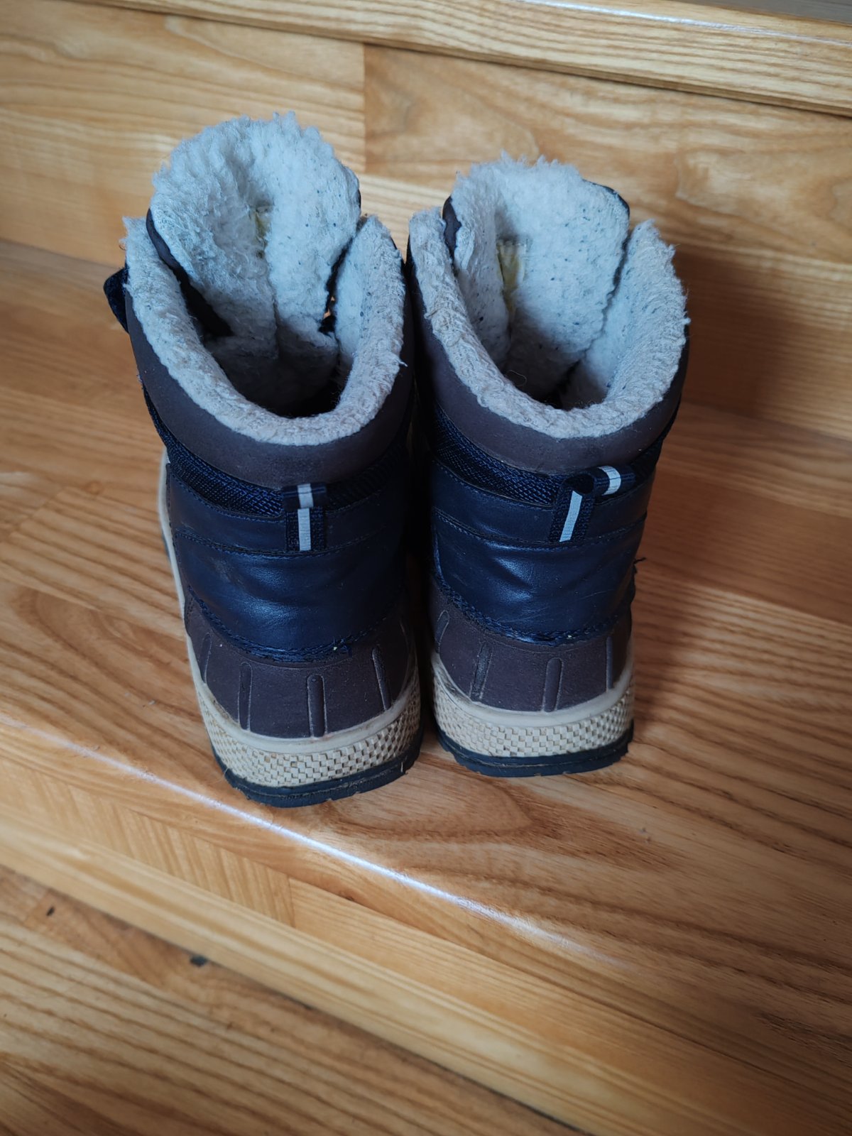 Tmavomodré gumáky vo veľkosti 33. Gumáky neboli vôbec nosené,nakoľko v lete dorástla noha a nepotrebovali sme ich obuť. Visačka bola odstrihnutá ale čižmy ostali nepoužité v skrini.