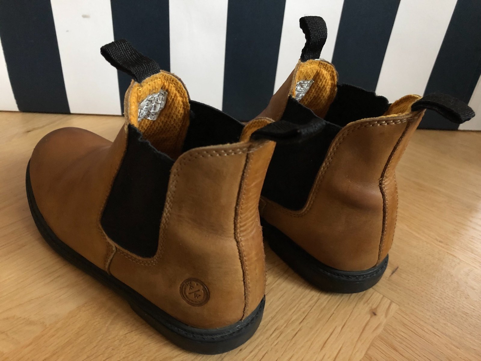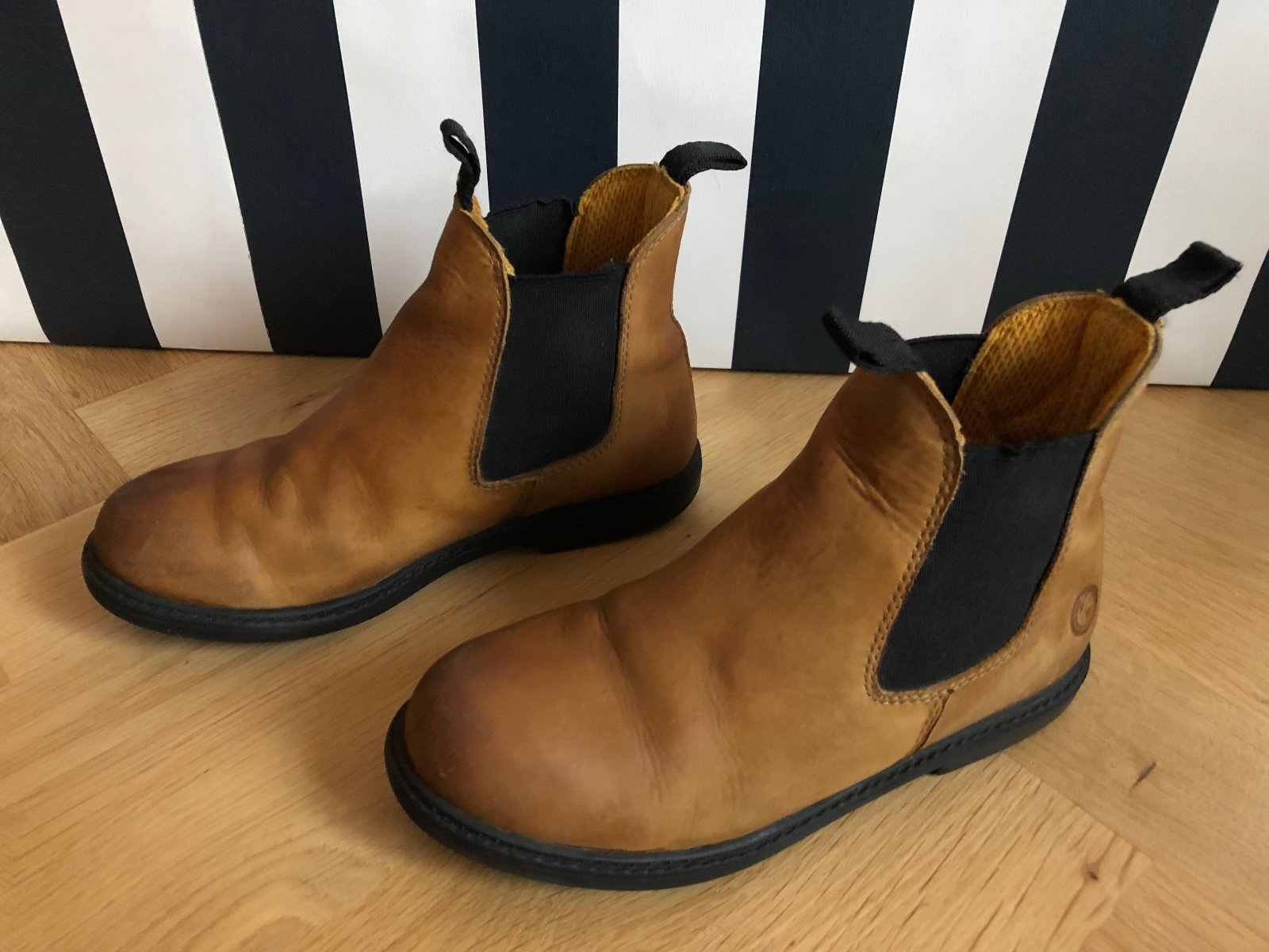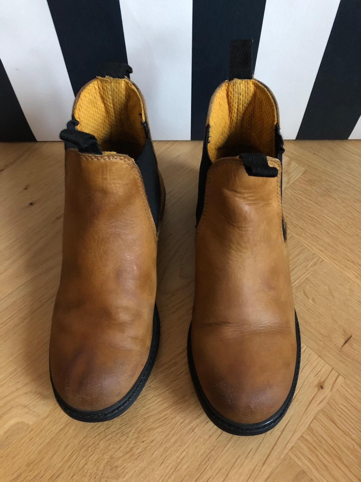 Kožené topánky, s pružnými gumenými podrážkami. Známky použitia sú najviac viditeľné na pätách, inak v slušnom nositeľnom stave.