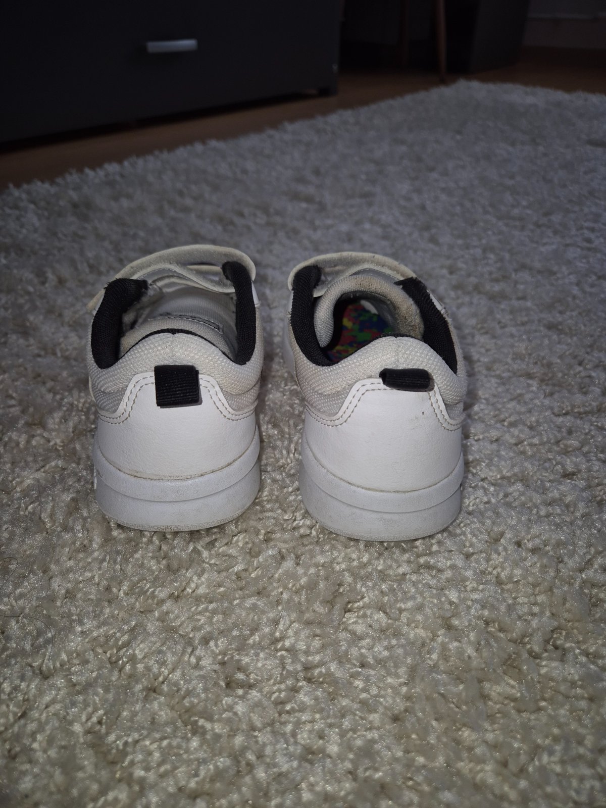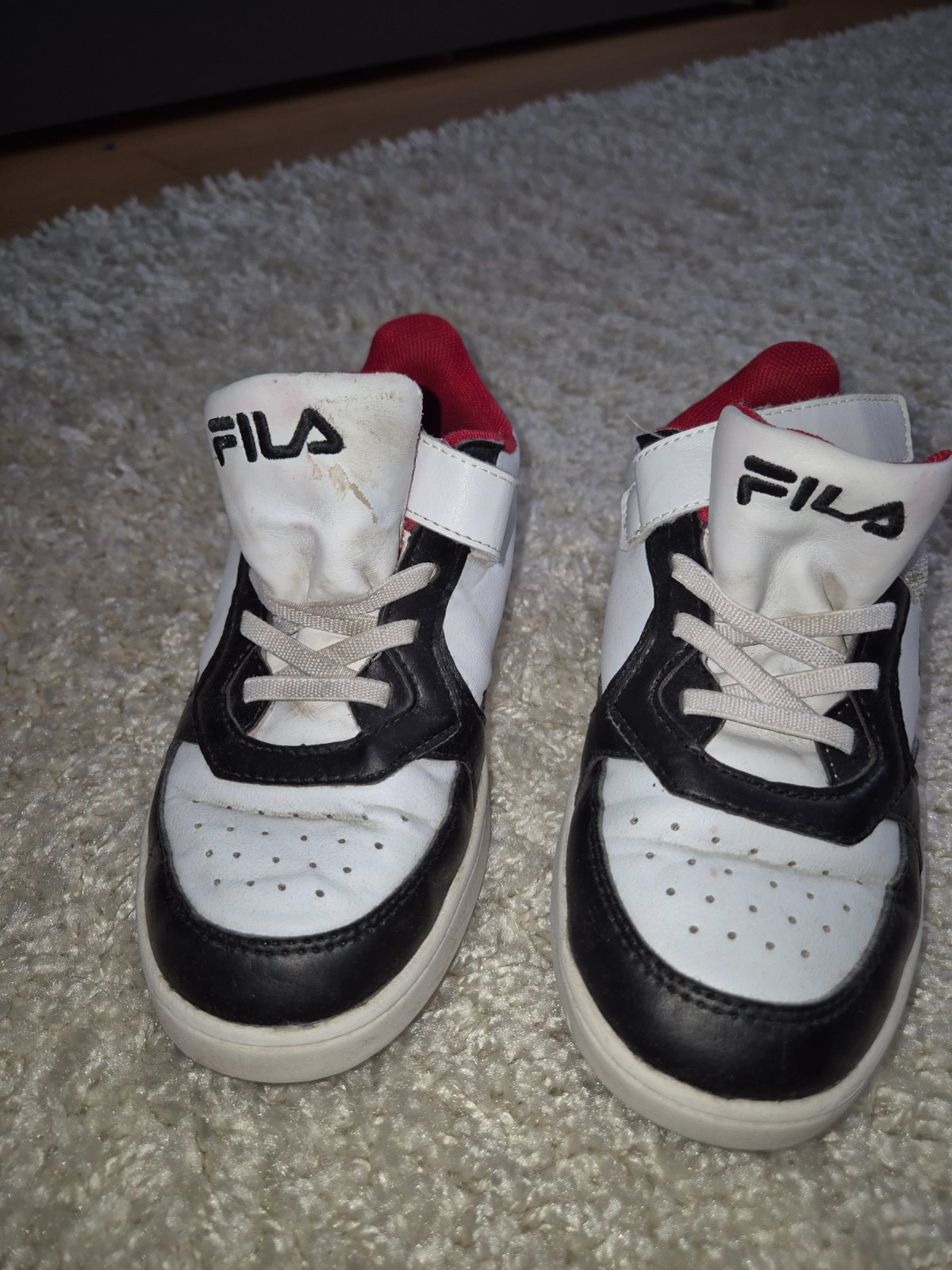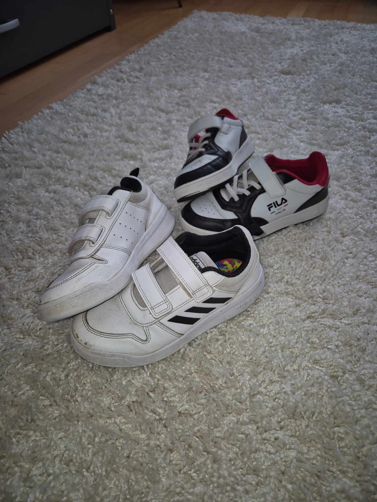 Adidas sú trochu šuchnute vpredu, su v nich ortopedicke vlozky, dĺžka 21cm. Fily majú jazyk prasknutý malinko, pri nosení nevidiet. Vložka sa nedá vybrať, vnútro cca 21,5cm. Myslim že môžu byť aj do školy alebo len tak po vonku.