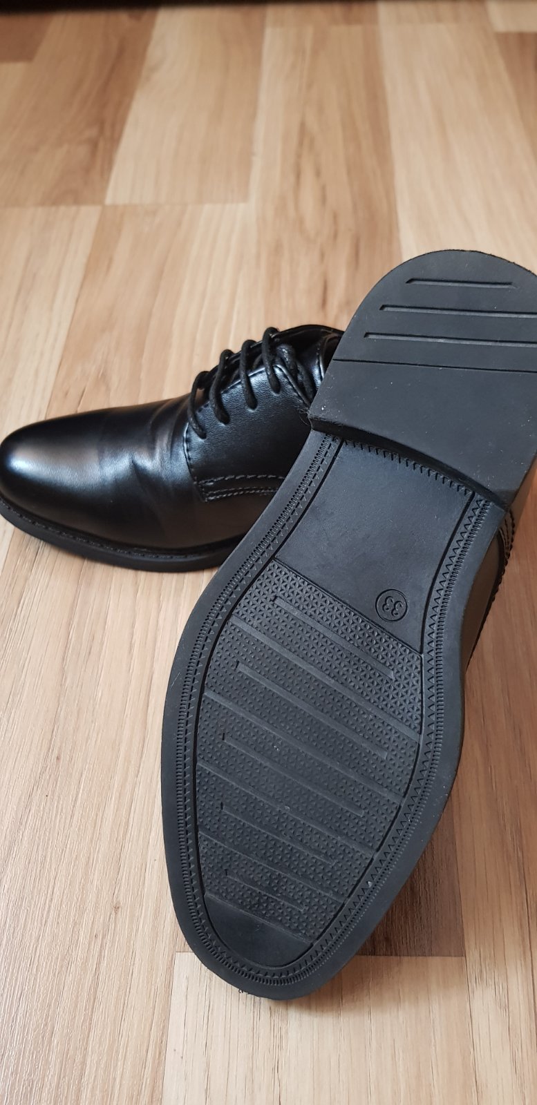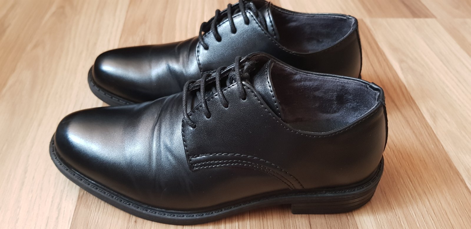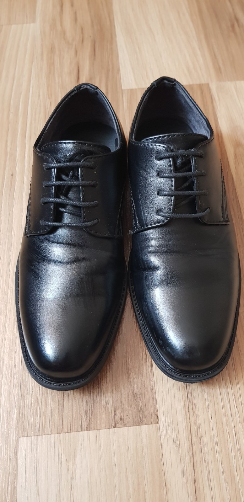 Predám raz obuté spoločenské topánky. Syn ich mal iba raz na prve sväté prijímanie. Nie sú okopané len už sa vpredu zohol materiál keď klačal v kostole (viť foto). Pôvodna cena 11,50.