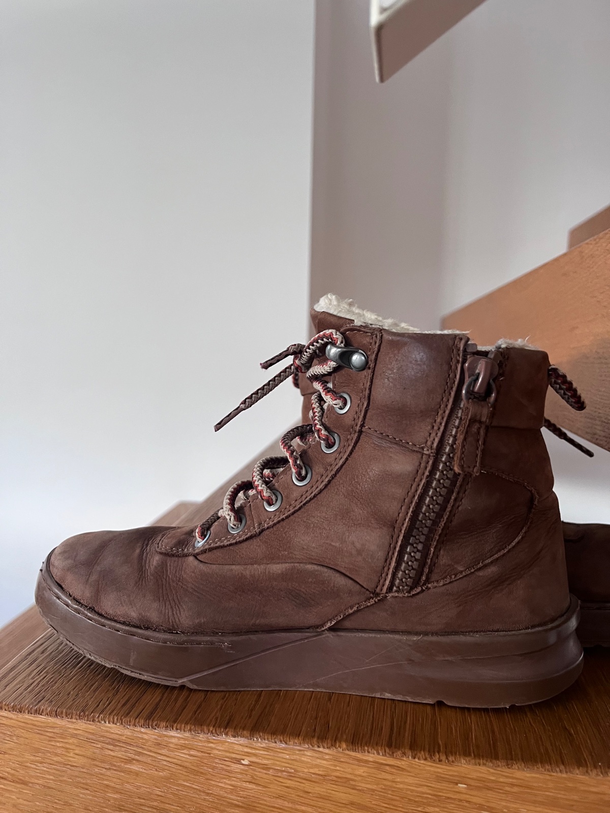 cizmicky su zavovne obute par krat. vo vnutri maju teplu kozusinku. vpedu sa upravuju snurkou, z boku maju zips. bez poskodenia ako nove. Vnutorna dlzka 21 cm