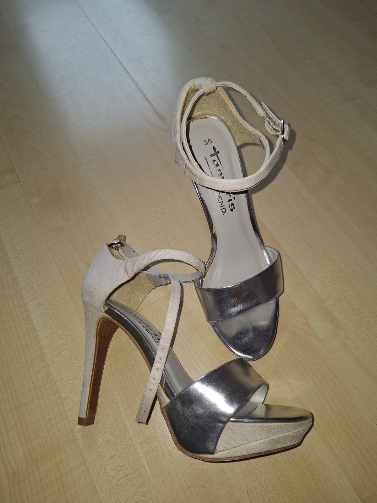 Vysoké sandalky , značka Tamaris, veľkosť 36. Obuté 2 x na svadbe na cca 4- -hod.a potom už len v skrini. Zlomila som si členok a už vyššie nemôžem, tak posúvam. Nakoľko maju vysokú i prednú časť su pohodlné. Cena 14, 90€