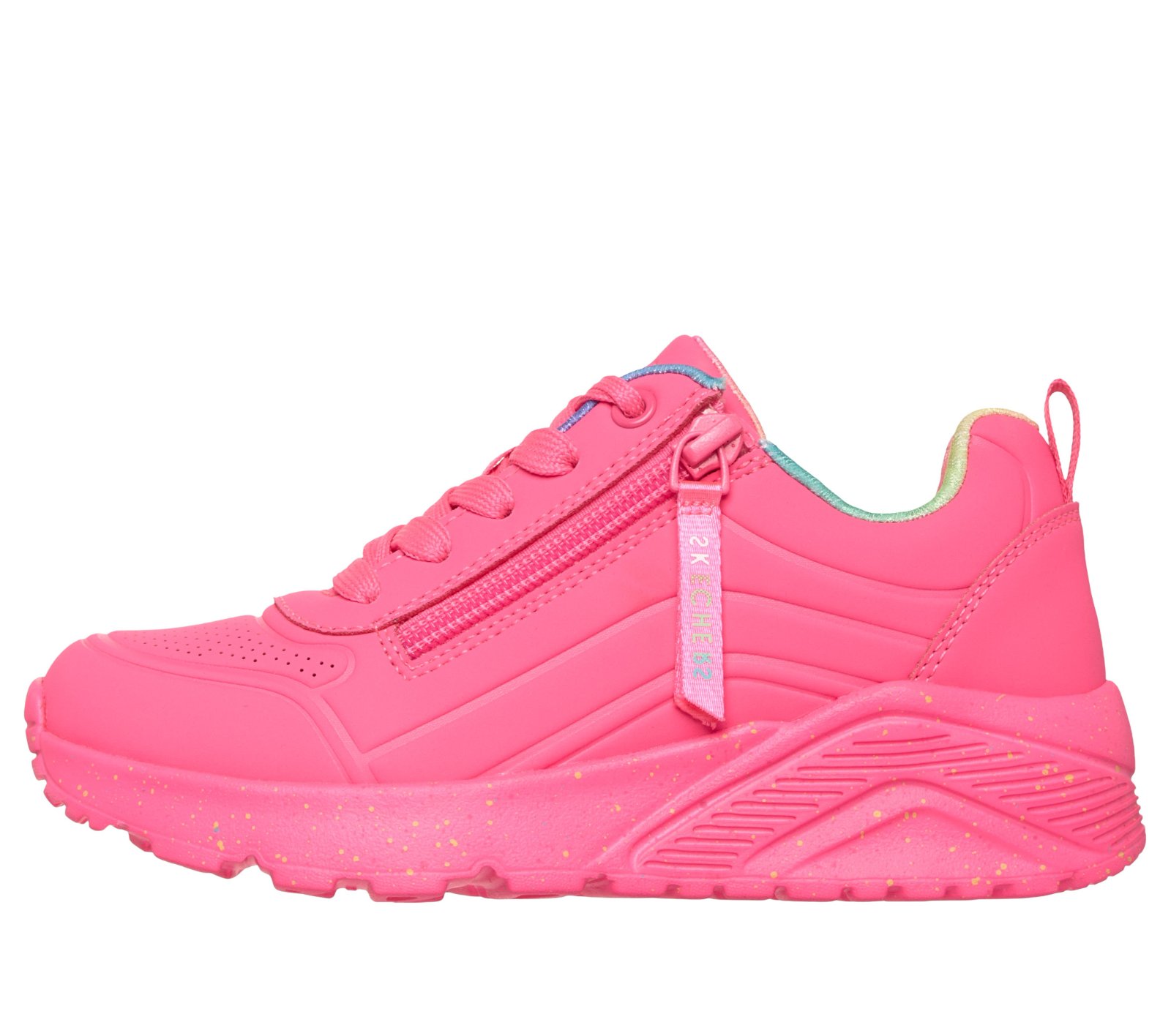 Detské tenisky Skechers 310370L v žiarivej ružovej farbe sú ideálnou voľbou pre aktívne deti, ktoré chcú štýl aj pohodlie. Moderný dizajn dopĺňa praktický bočný zips pre jednoduché obúvanie a športová podrážka s jemným „splash“ efektom. Tenisky sú vhodné na každodenné nosenie do školy aj na voľný čas.