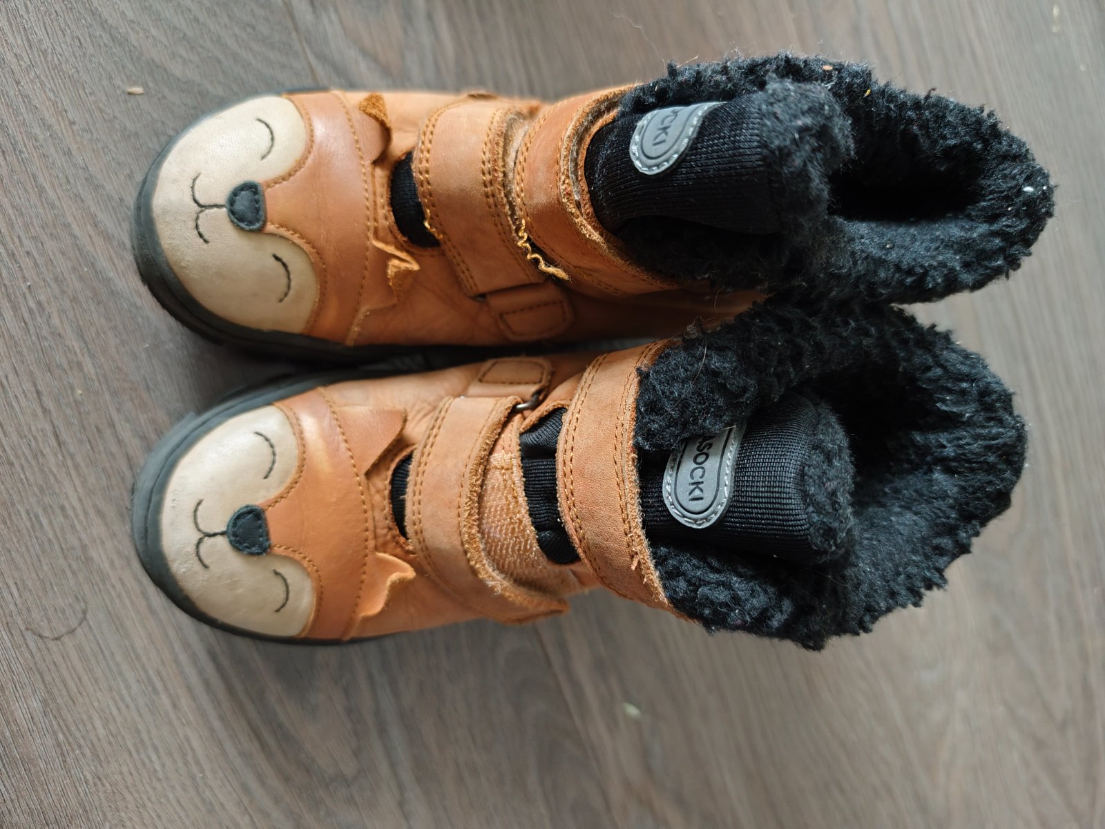 Kožené zateplené topánočky na slabšiu zimu, poškodenia vidieť na fotkách, vnútorná dĺžka 19cm