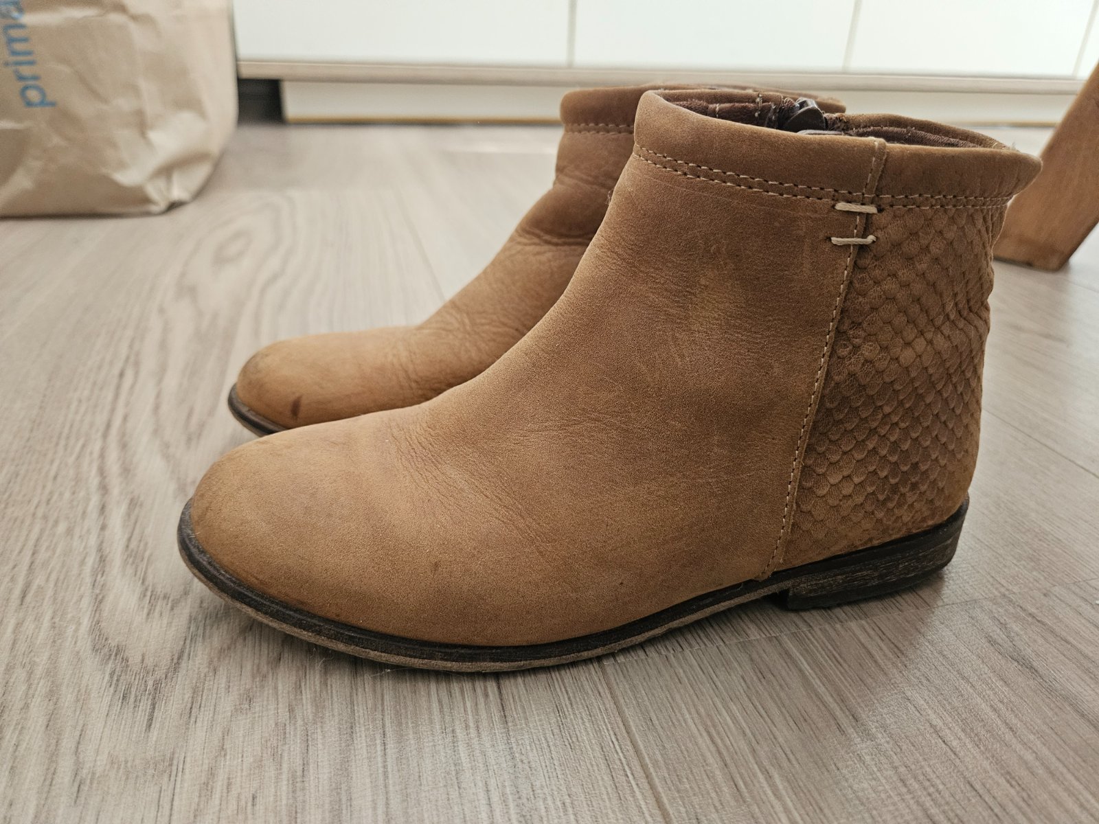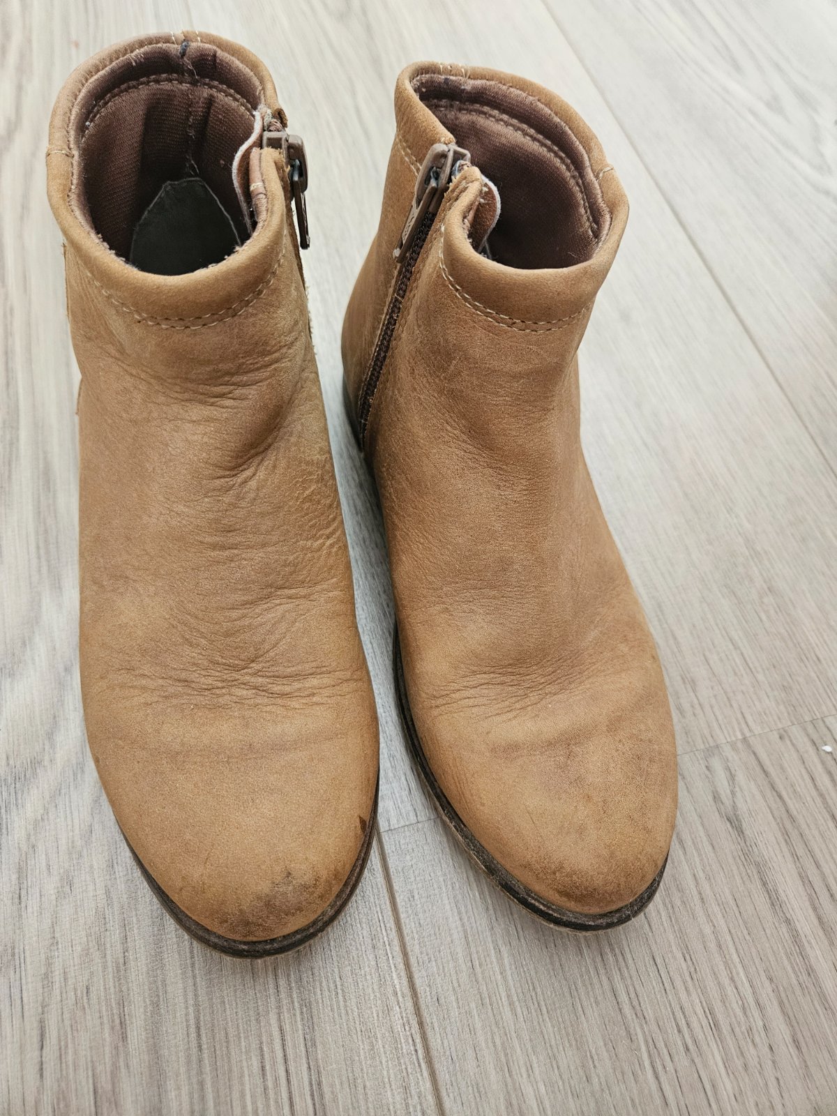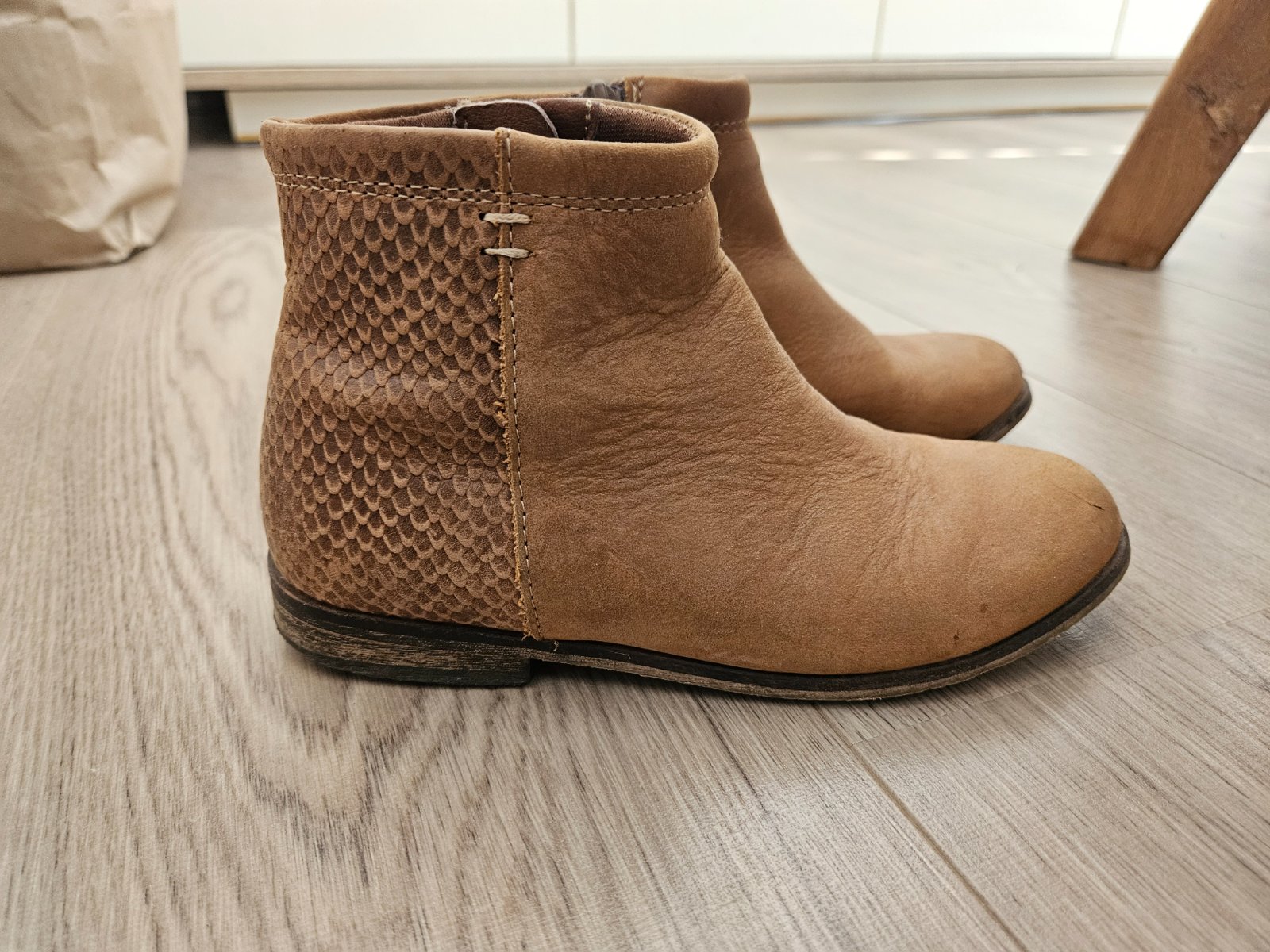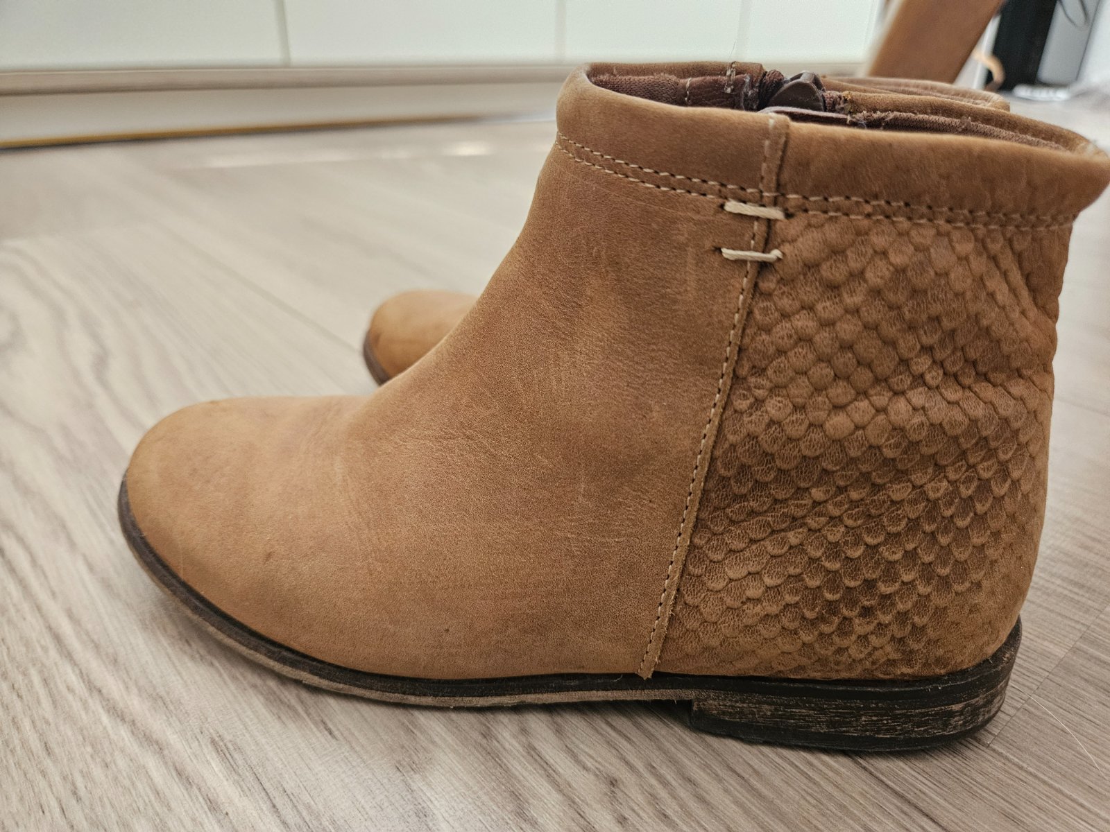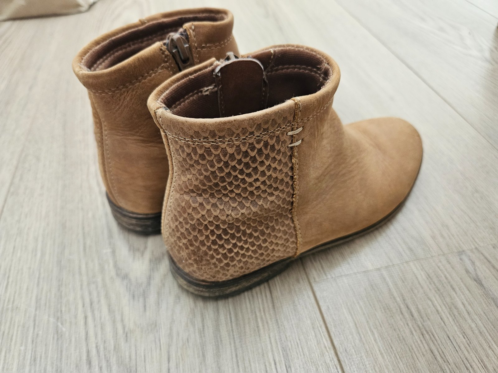Celoročné členkové topánky. Farba mliečnej kávy. Vrchný materiál brúsená koža. Zaväzovanie na šnúrky. Obuv má bežné známky nosenia. Je naimpregnovaná. Bezchybný stav. Veľkosť 30. Dĺžka stielky 200mm.