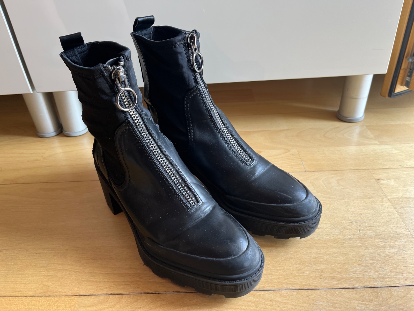Predam damske cierne cizmicky, velkost 39 (vnutorna dlzka 25,5 cm), znacka Zara. Je to synteticka koza + elasticky material okolo členka, vpredu na zips. Su skor na uzku nohu, jemne špicaté, jemne vlasocnice-osuchy z nosenia, ziadne vyrazne poškodenie. Symbolicka cena. BA - Ruzinov.