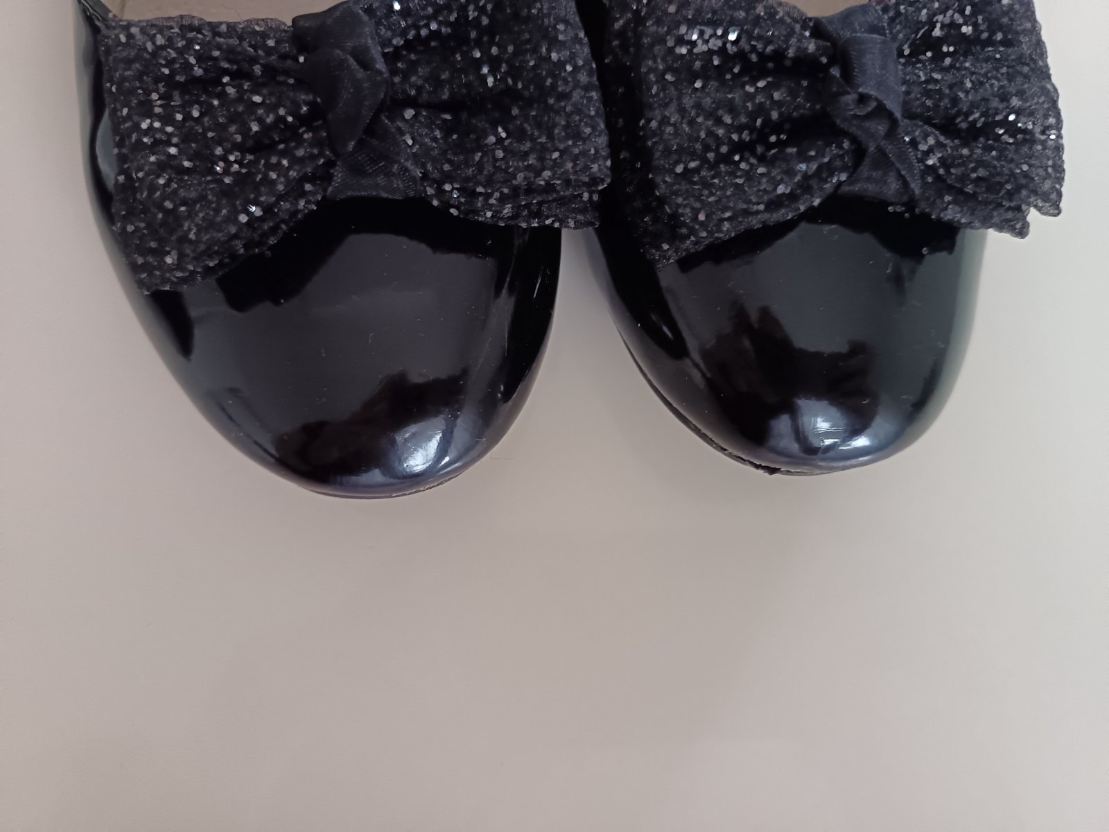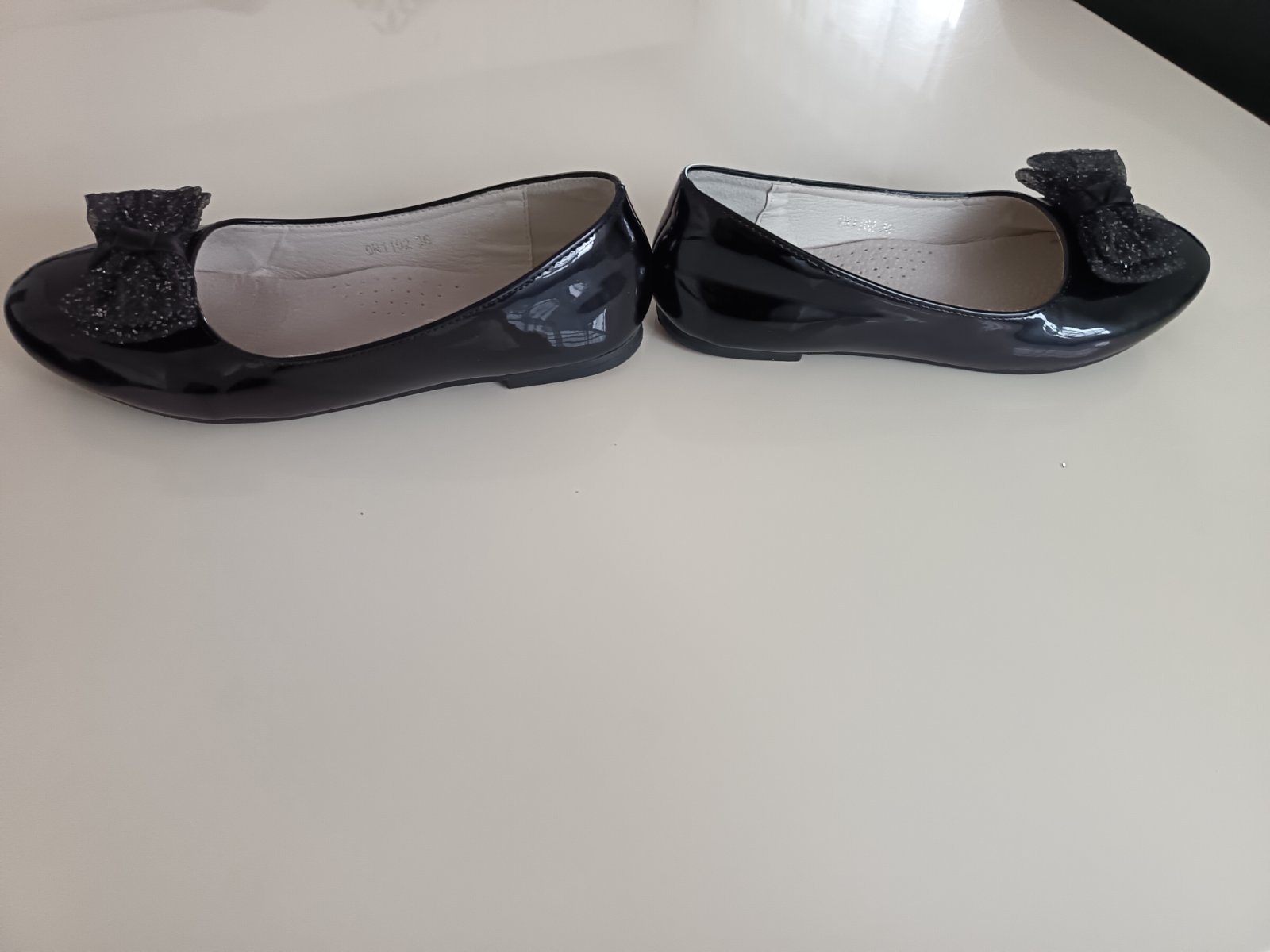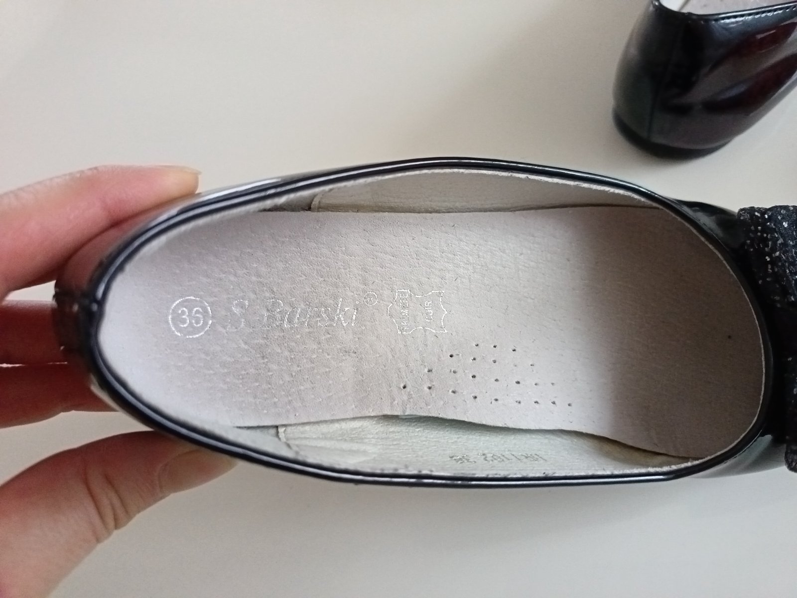 Čierne lesklé balerinky, s mašličkou, kožená tielka,zn. S. Barski, špičky neokopane, z boku jemné škrabance, takmer ich nevidno(viď foto), inak bez poškodenia. VN. Dĺžka 22,5cm