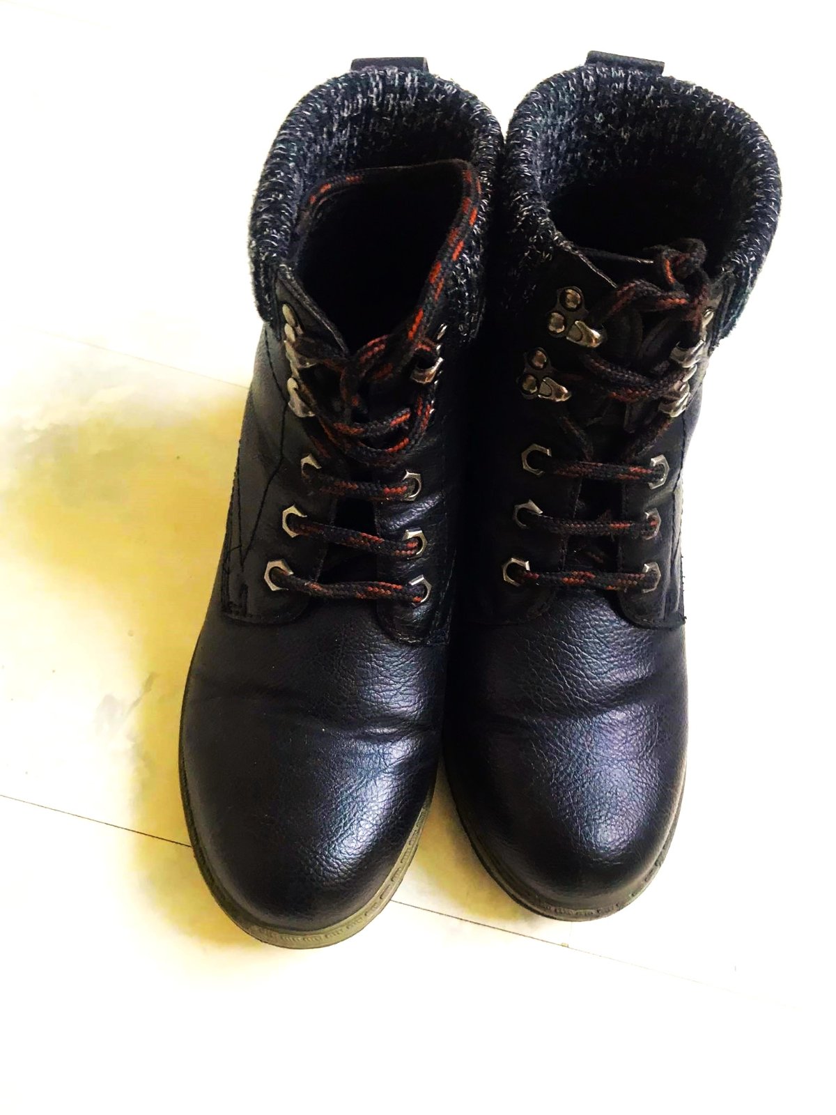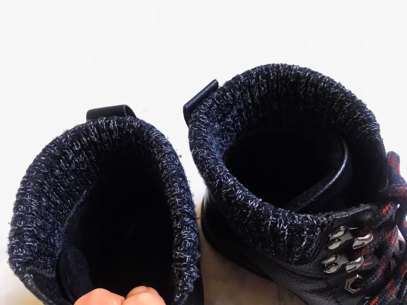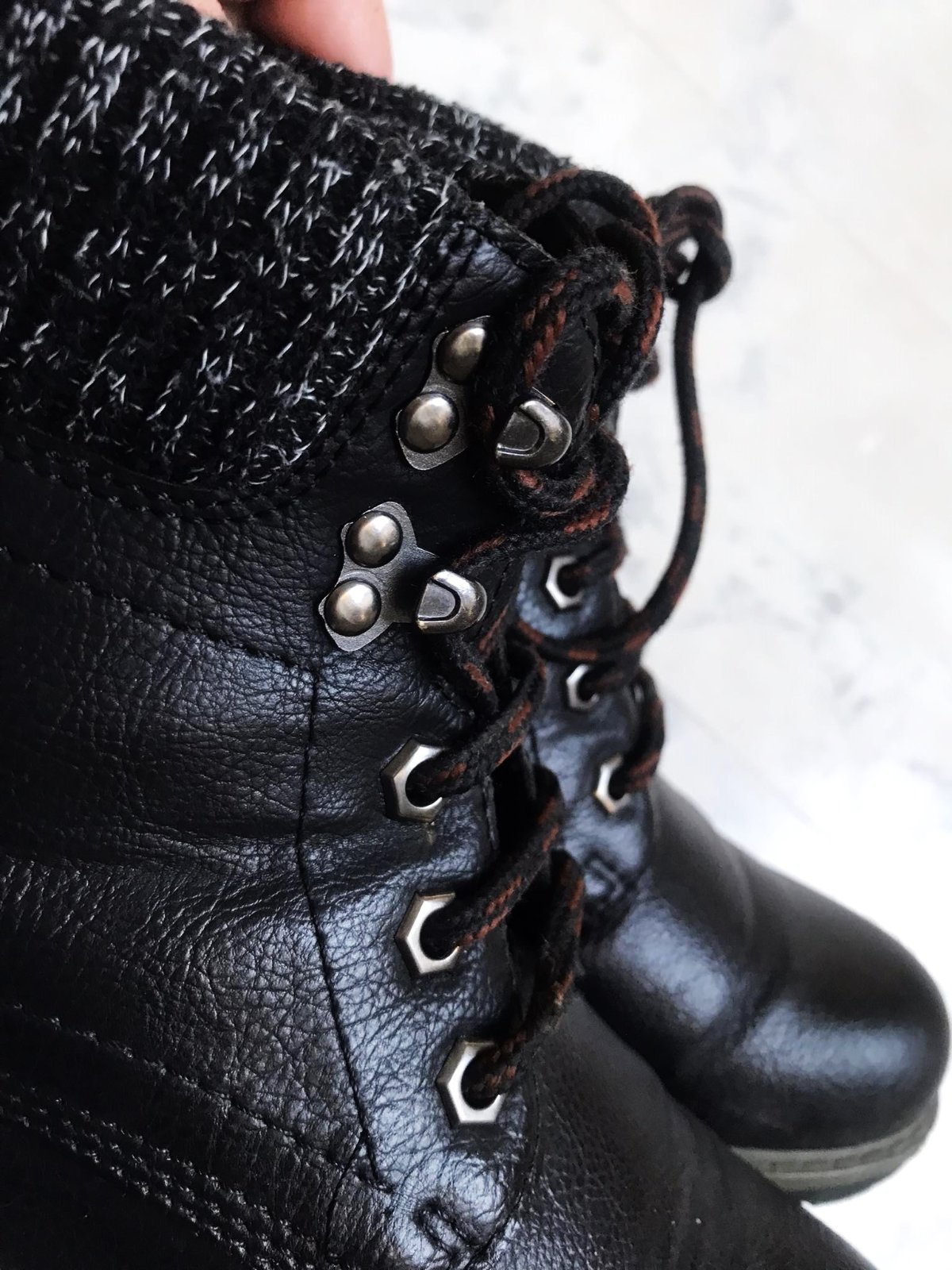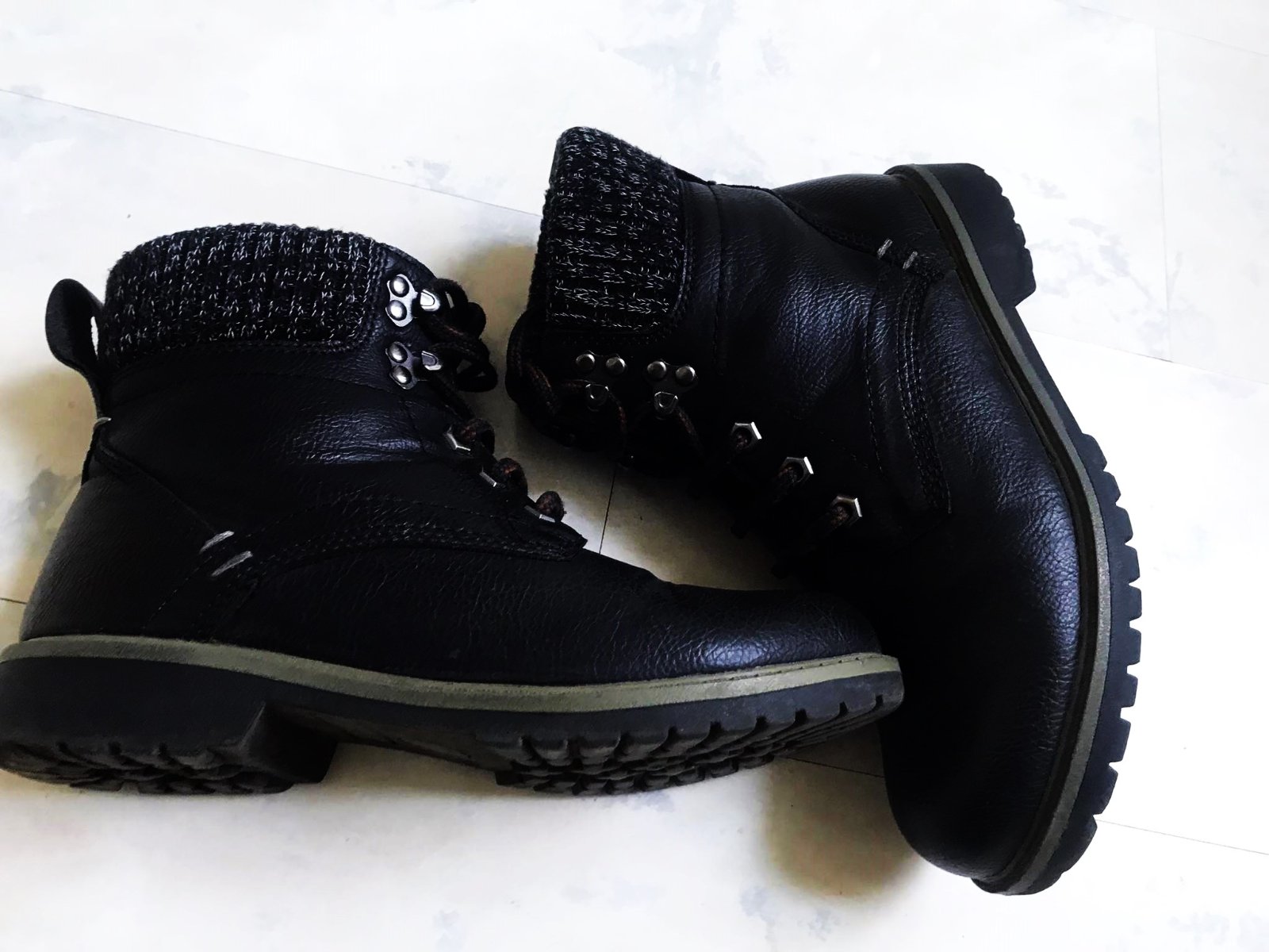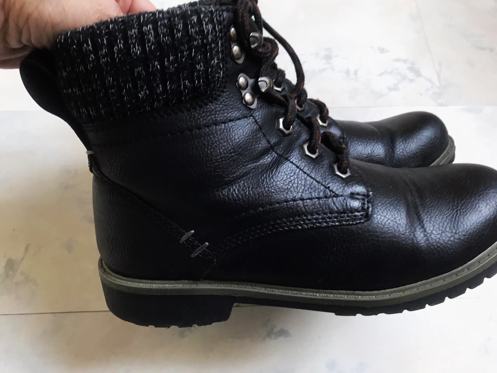 pekne sediace zimné členkové topánky s úpletovou rumbou,dnu jemne zateplené flisom,materiál - vyfotený,nie je to koža,ale syntetika s úpravou a štruktúrou imitujúcou kožu,sú neznosené,v top stave