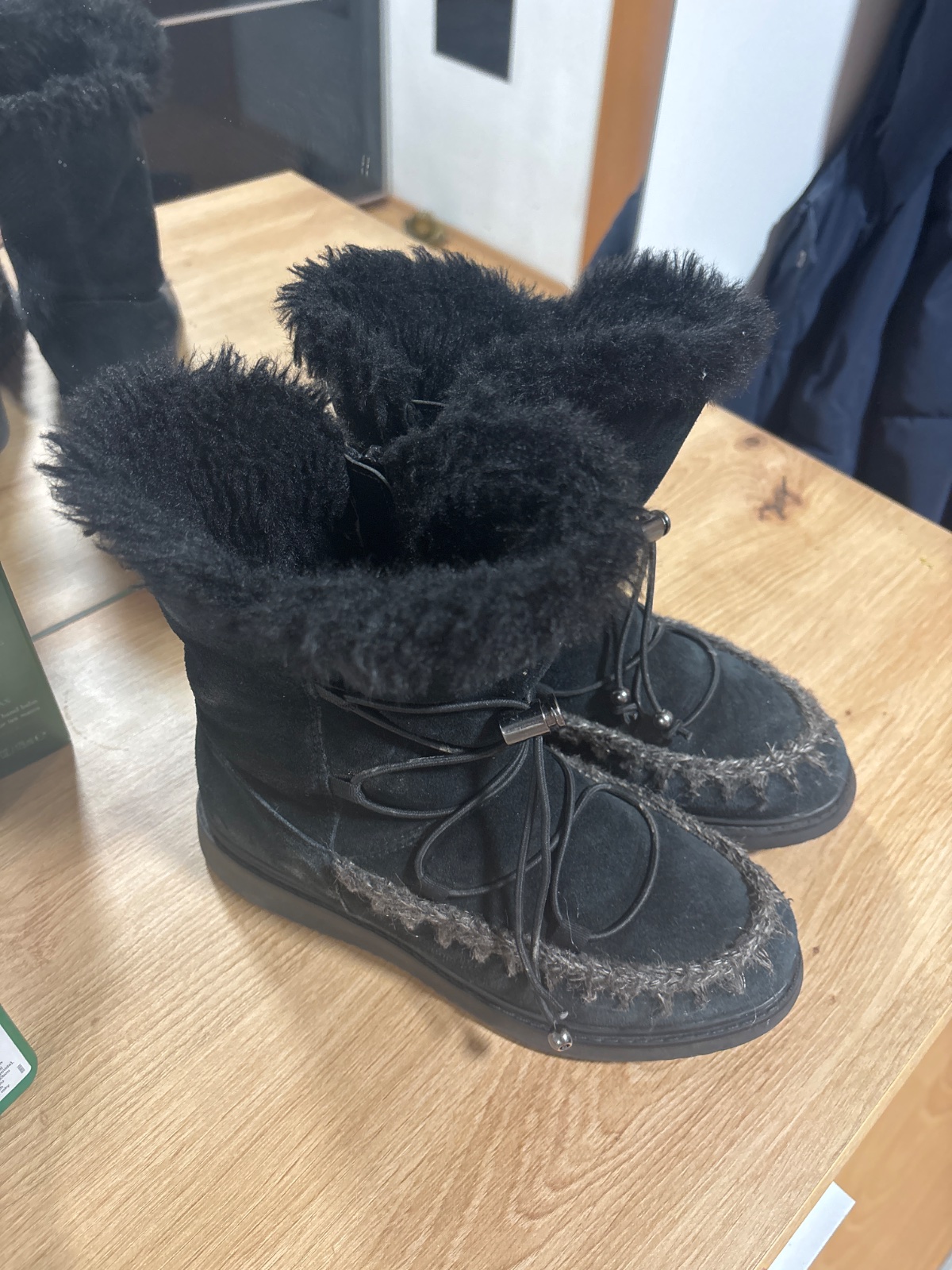 Pekné čierne čižmy, nosené boli máličko, trošičku šuchnutá pravá čižma, no je to vidiet minimálne - zohľadnené v cene. Vnútri nie je kožušina, ale je to taký funkčný materiál a pod ňou tenká pena,...