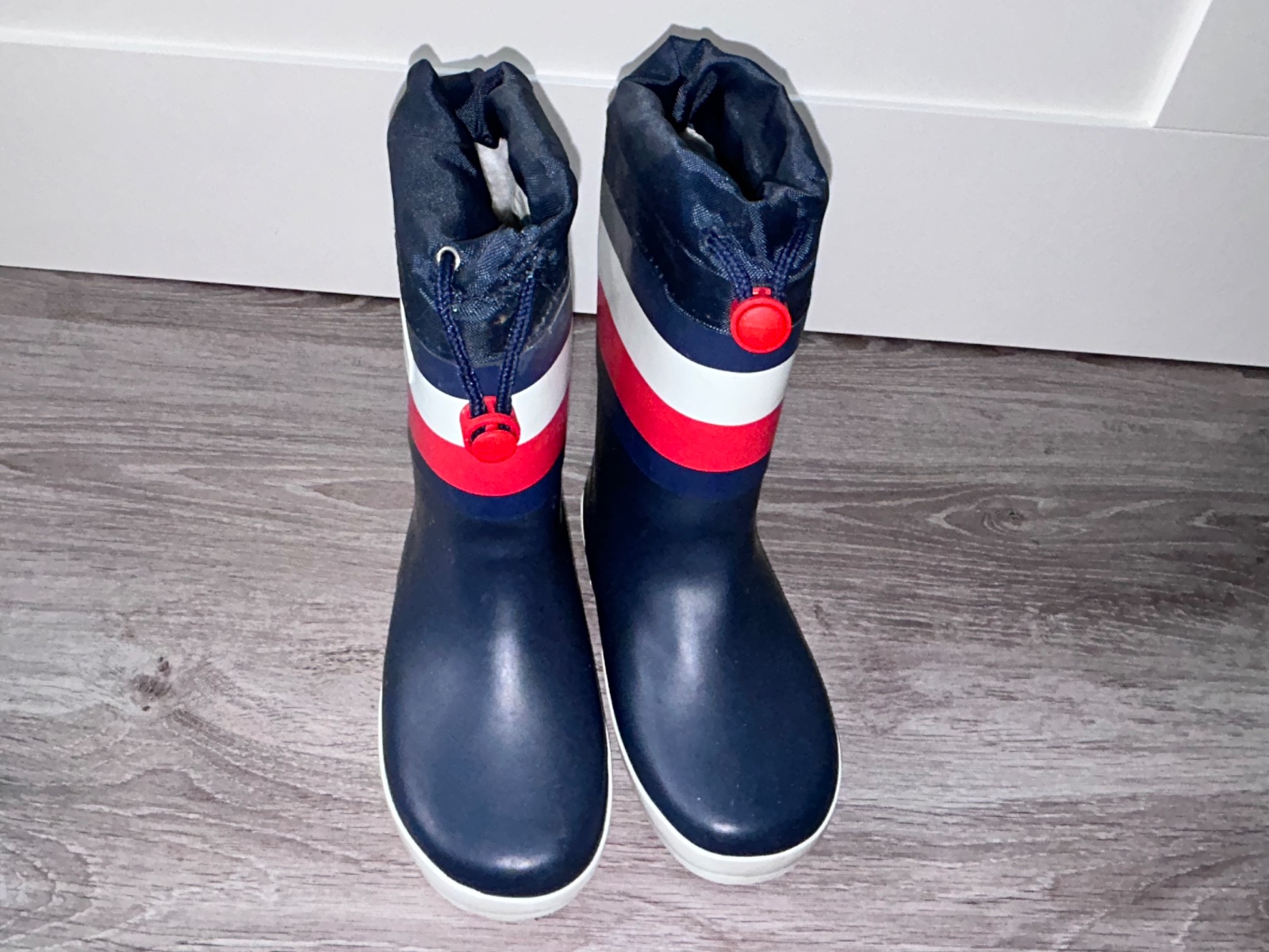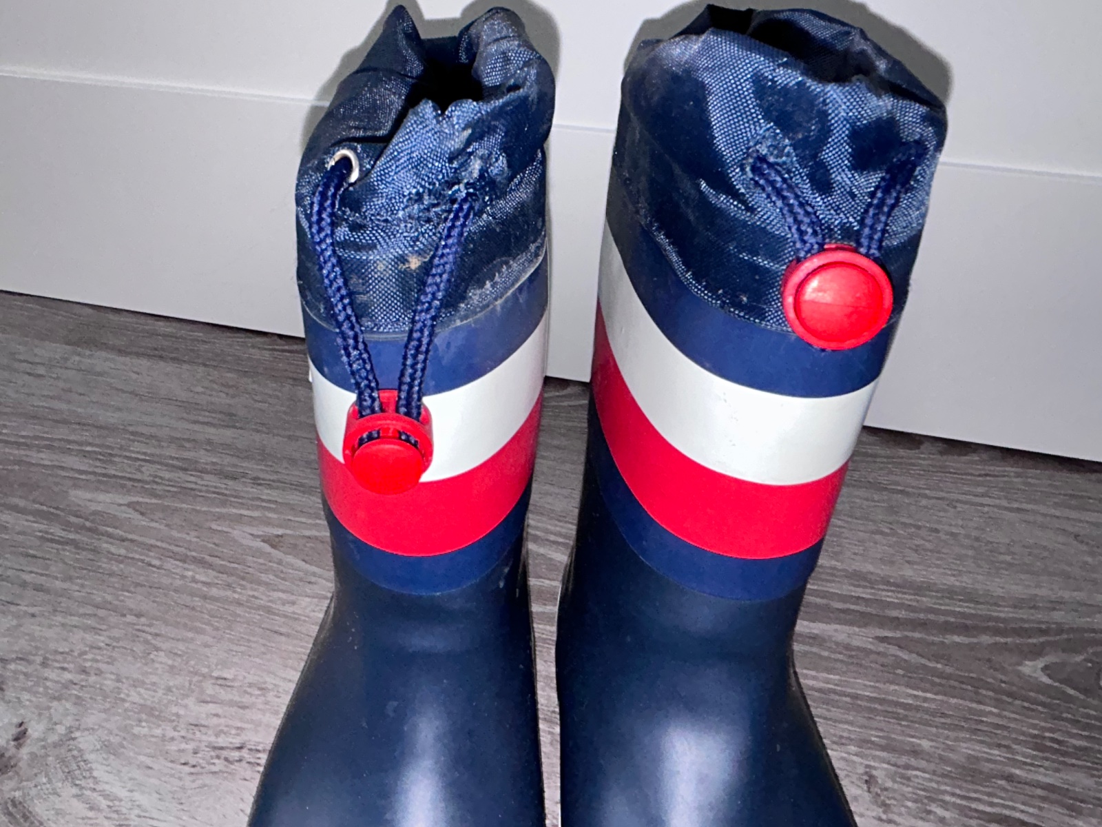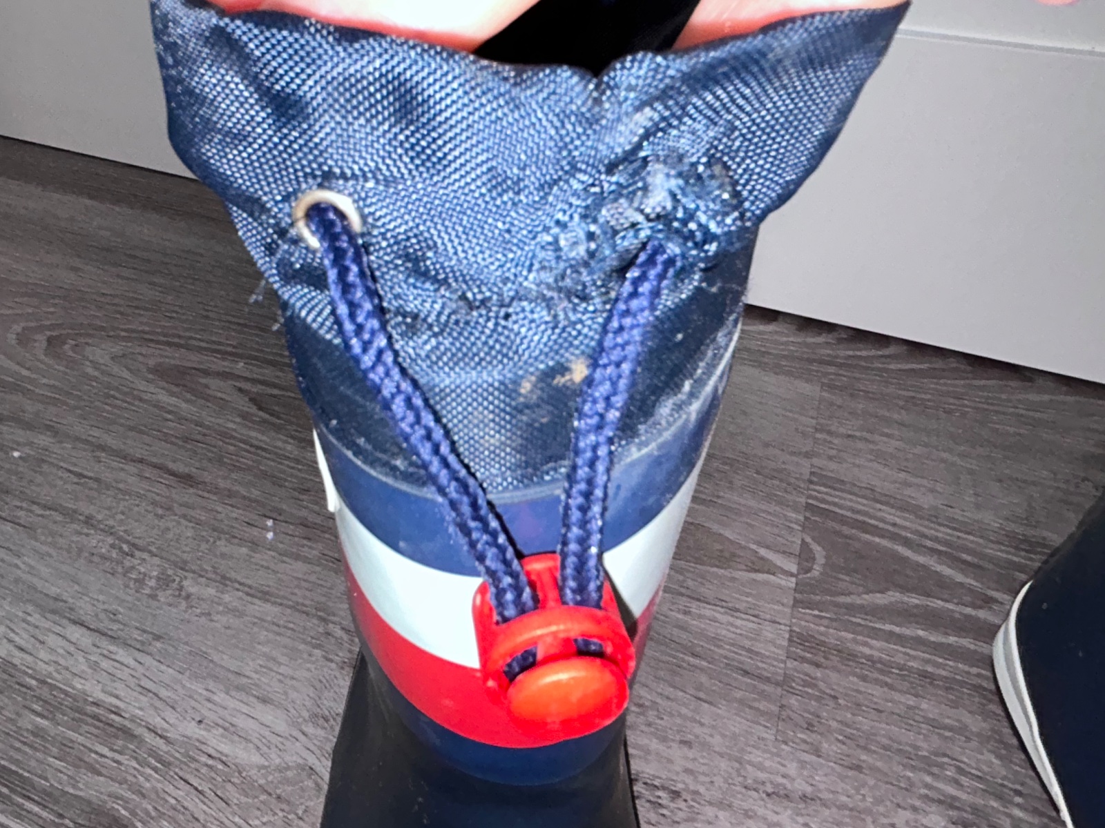 Kupovane nove v humanicu, na jednej je nadpis a na druhej nie, vid foto, tak sme ich uz kupili, nosene do skolky jesen/zima/jar, boli super nohy vzdy v teplucku a suche, cast kde sa zatahuju bola poskodena a mnou zasita, vsetko je nafotene a zohladnene na cene