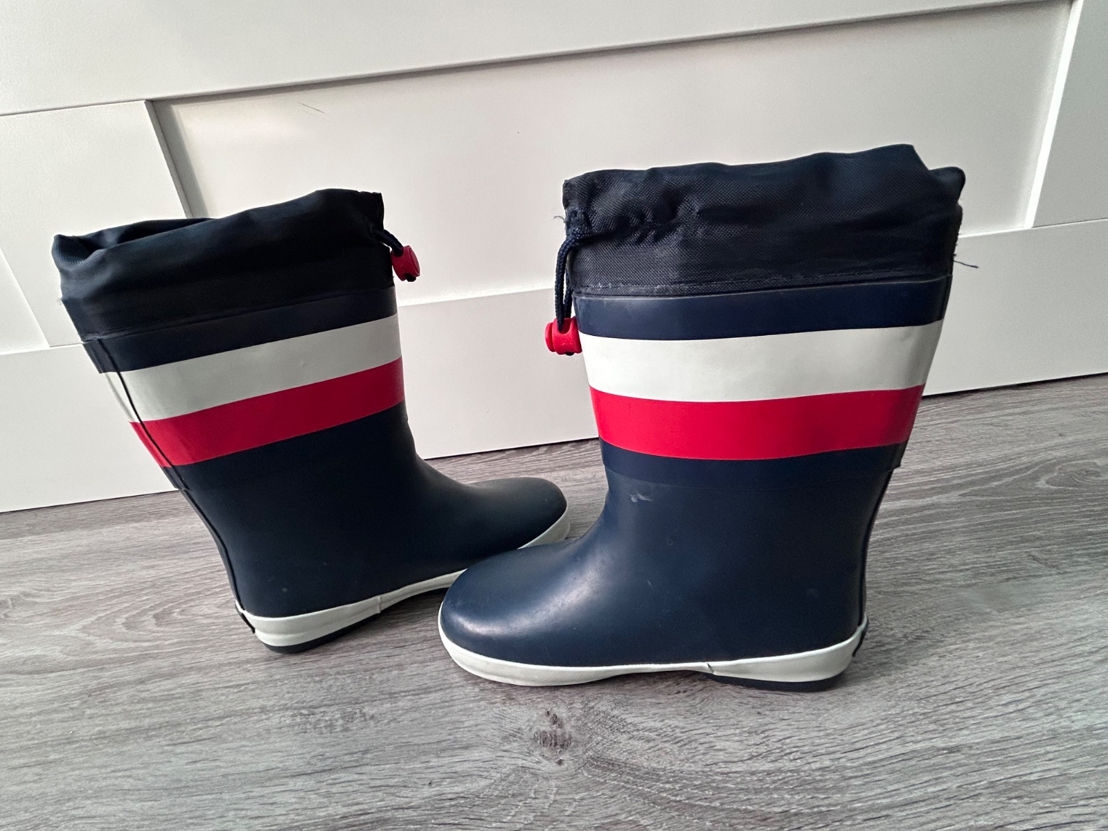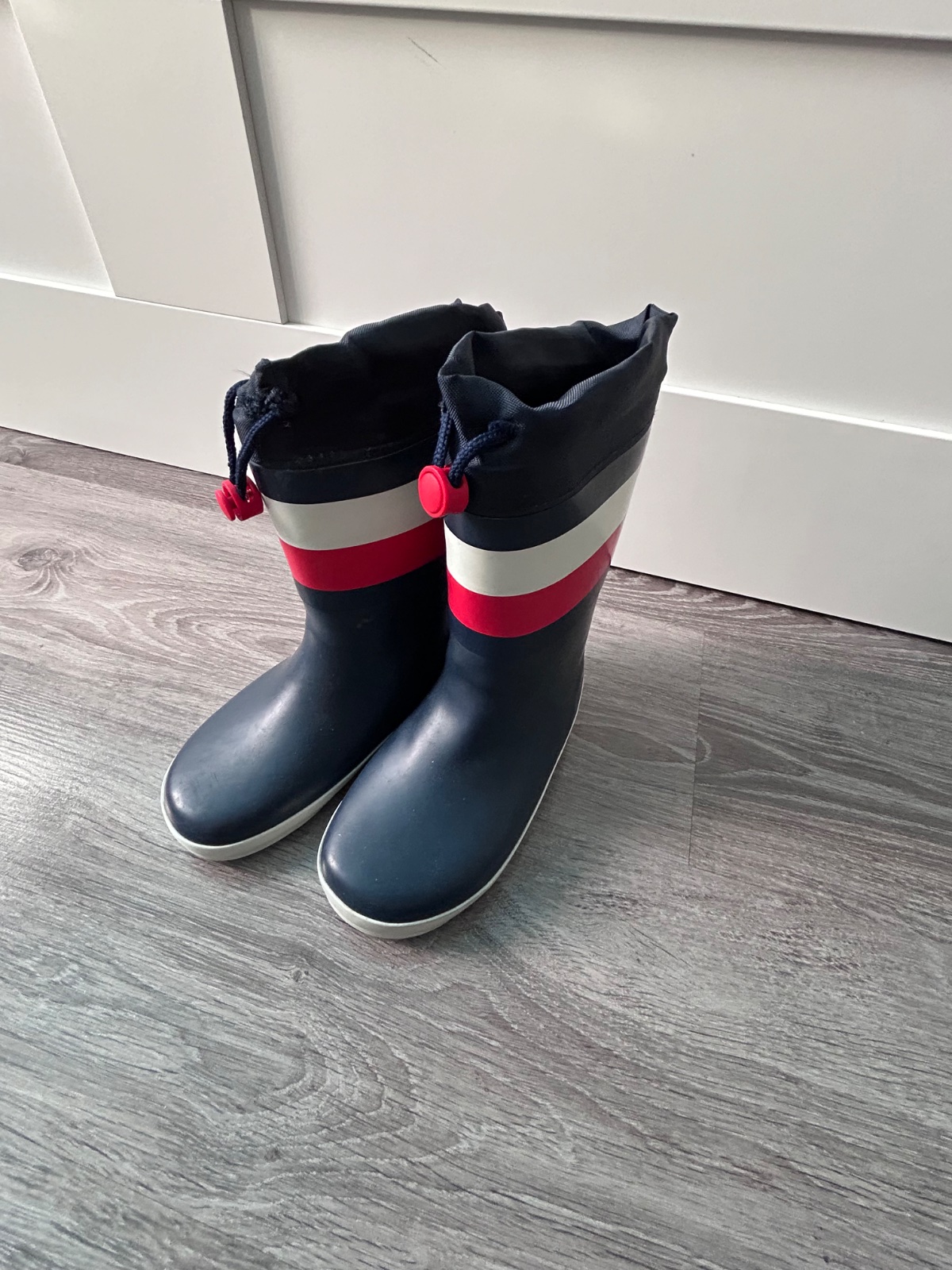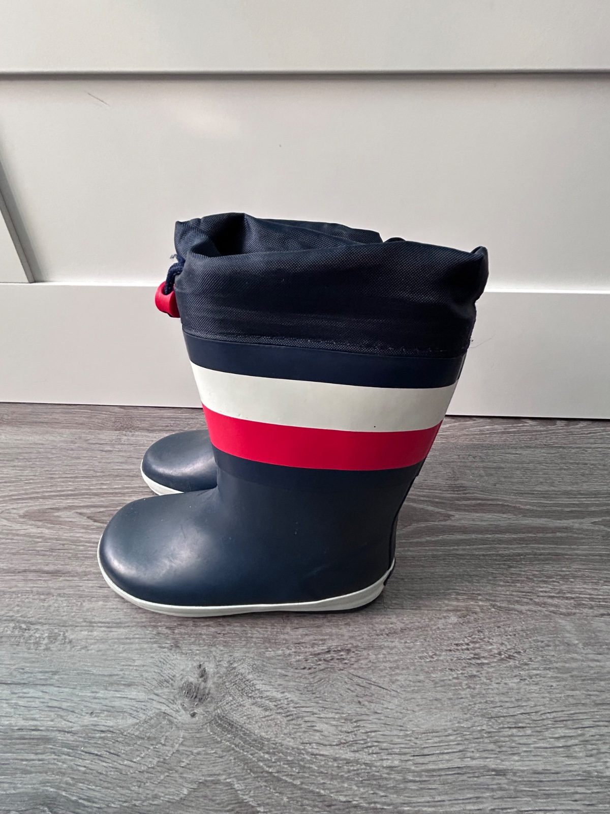 Kupovane nove v humanicu, na jednej je nadpis a na druhej nie, vid foto, tak sme ich uz kupili, nosene do skolky jesen/zima/jar, boli super nohy vzdy v teplucku a suche, cast kde sa zatahuju bola poskodena a mnou zasita, vsetko je nafotene a zohladnene na cene