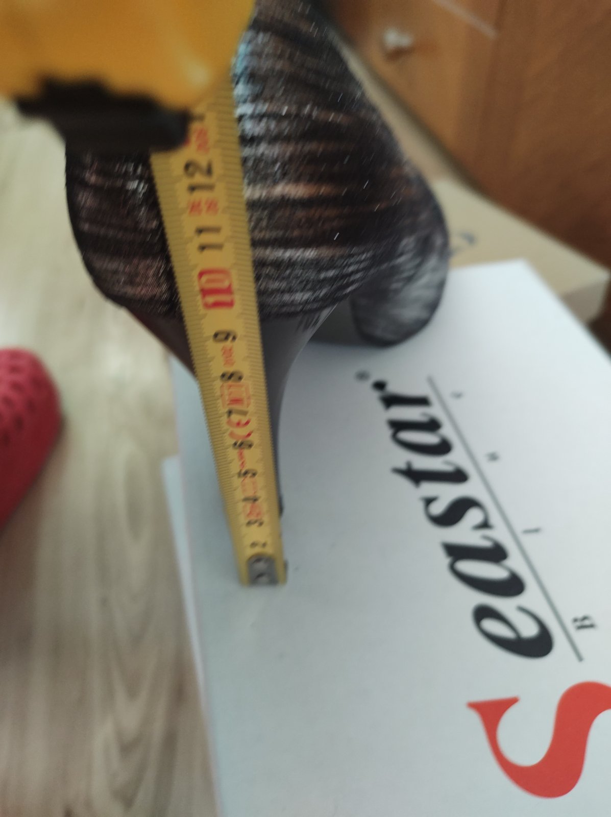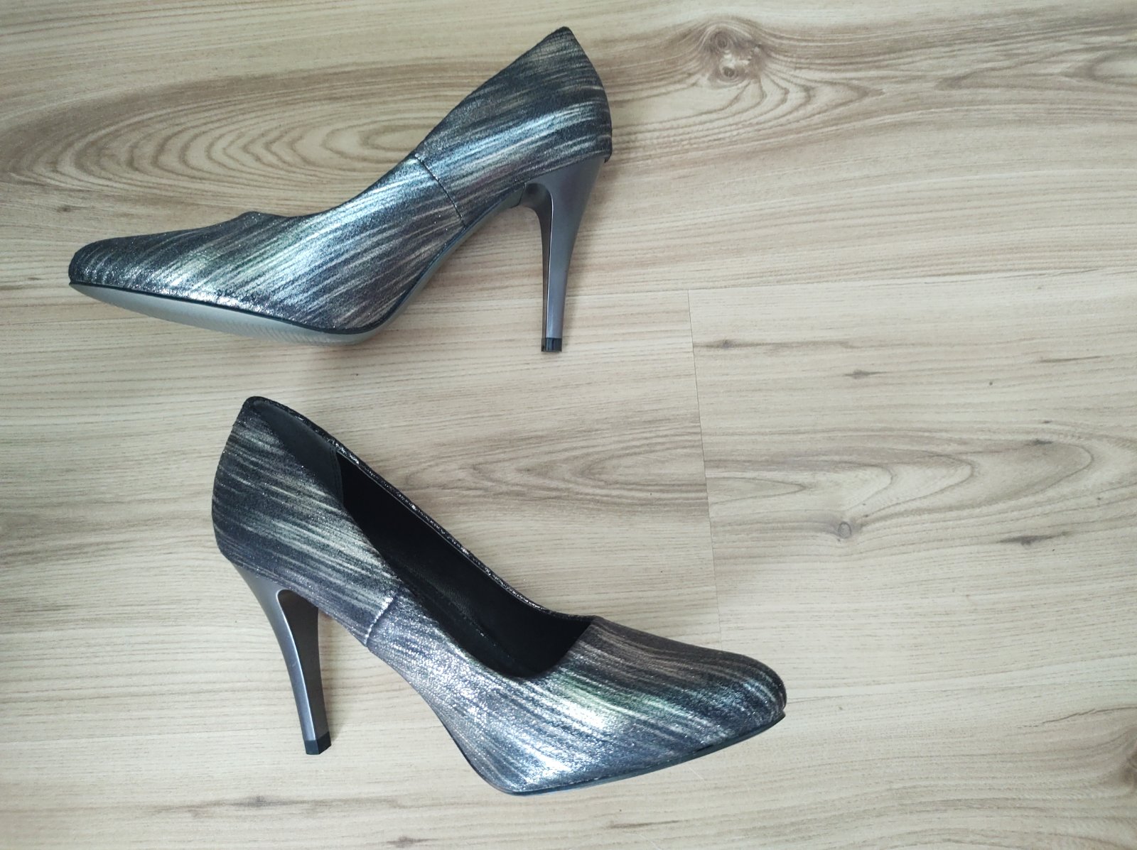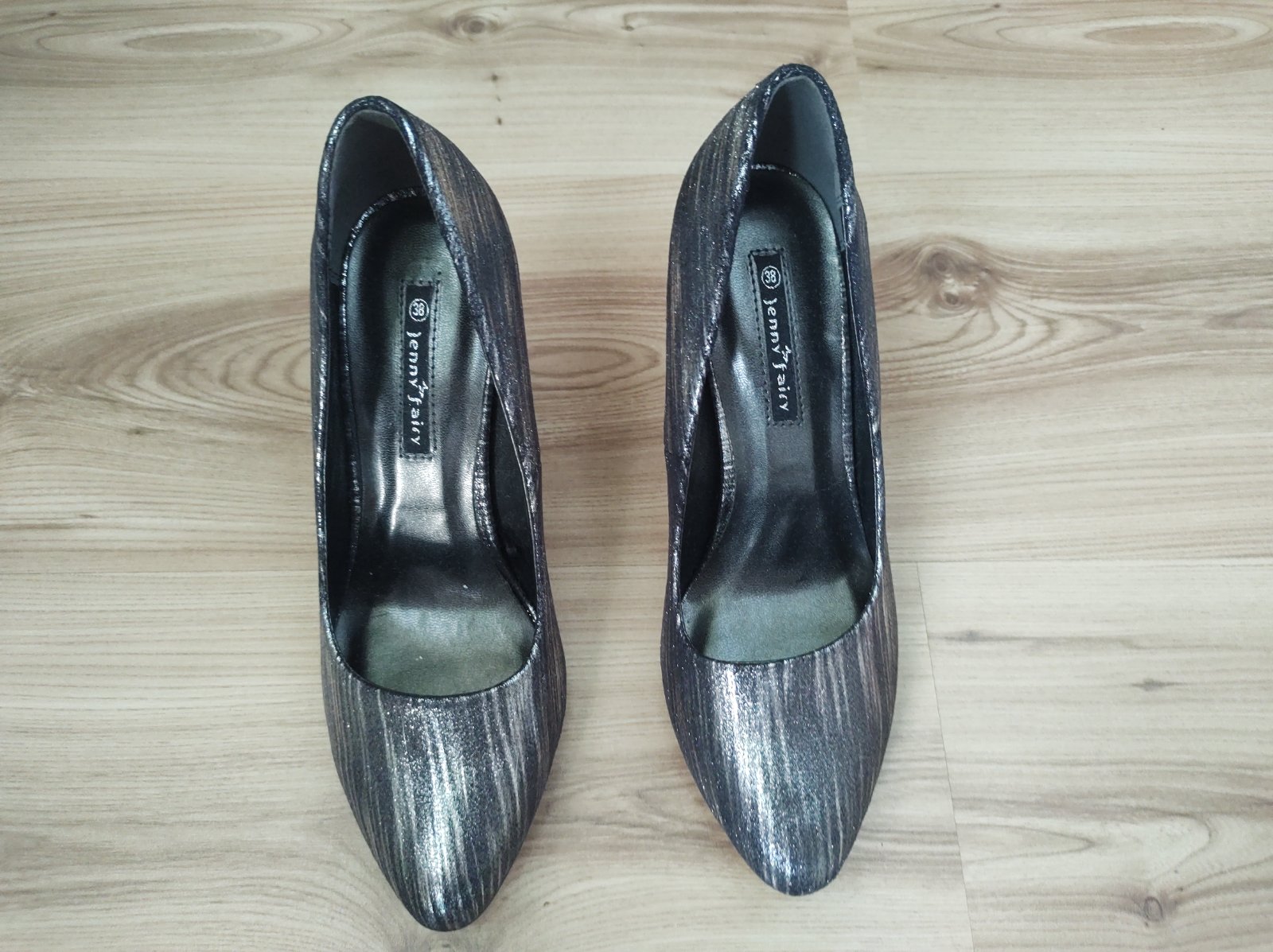 Ponúkam na predaj nenosené lodičky, len v predajni vyskúšané, nenosené z dôvodu zlomeniny členku..farba je čierno- strieborné pásiky. Opätok je vysoký asi 9,5 až 10 cm. Vnútro stielky 24,5 cm. Značka Jenny Fairy kúpené v CCC.