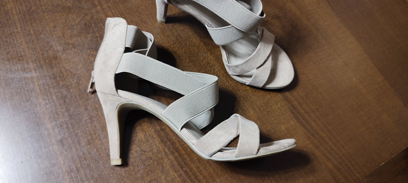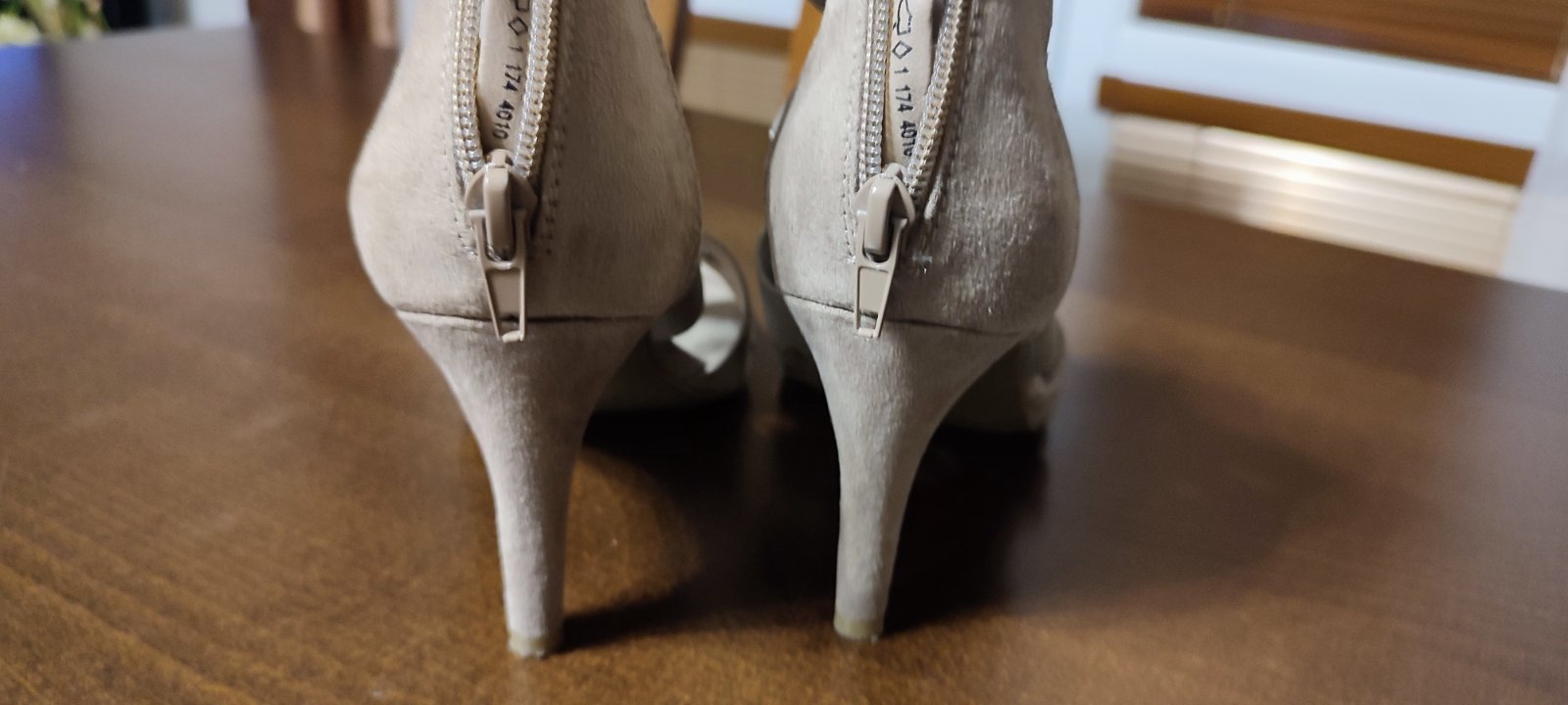Béžové sandále. Párkrát obuté. Zapínanie v zadu na päte, zips. Okolo nartu pružná guma. Bežné známky nosenia.