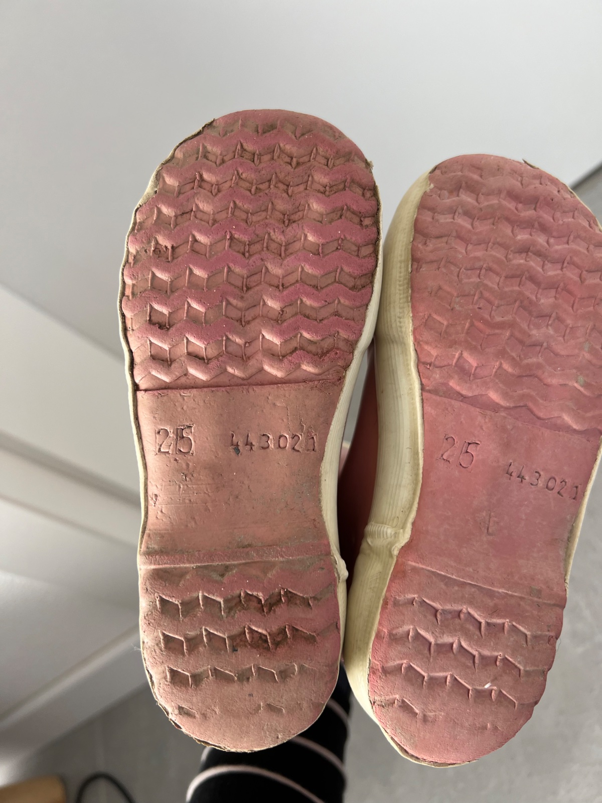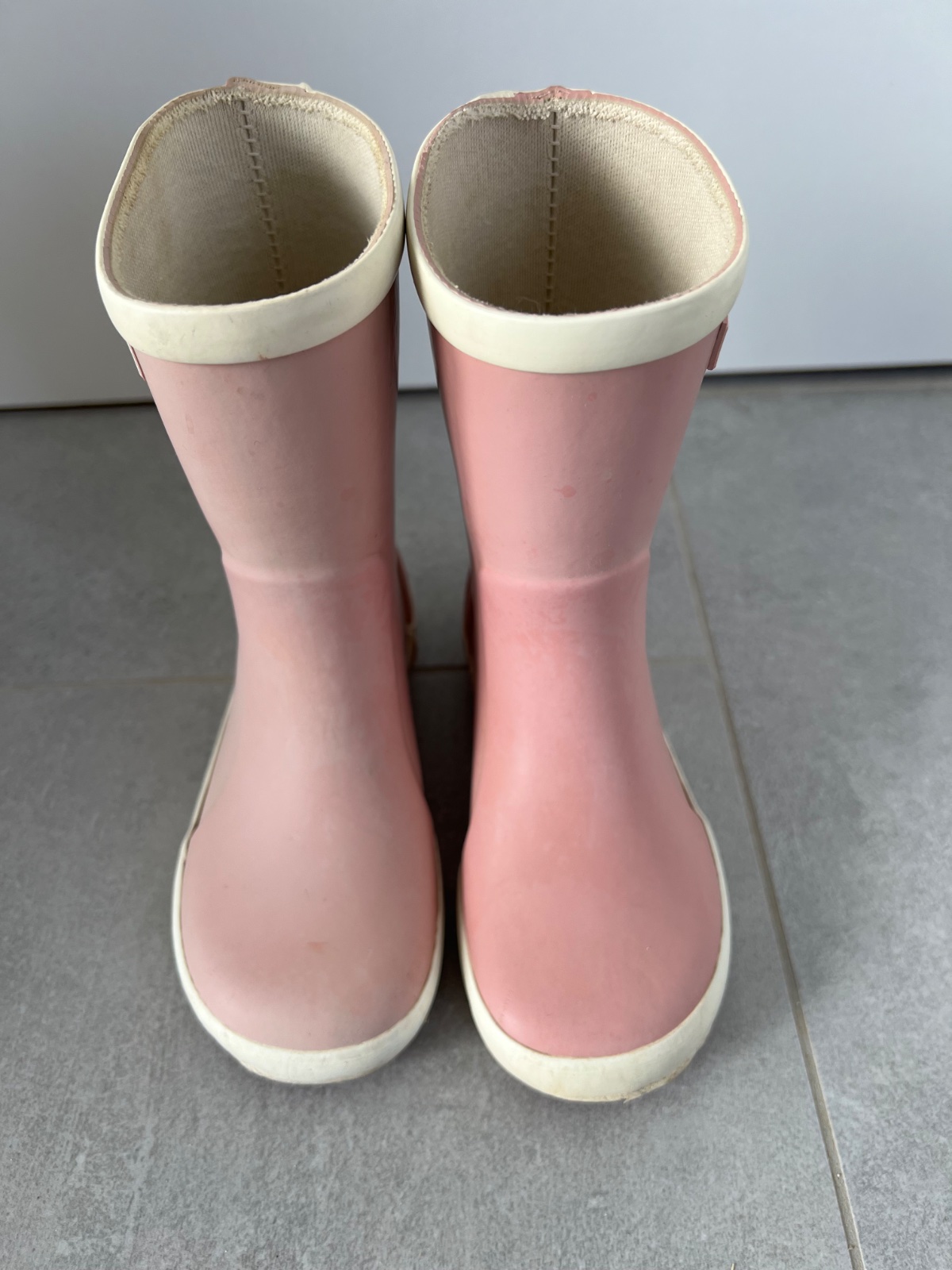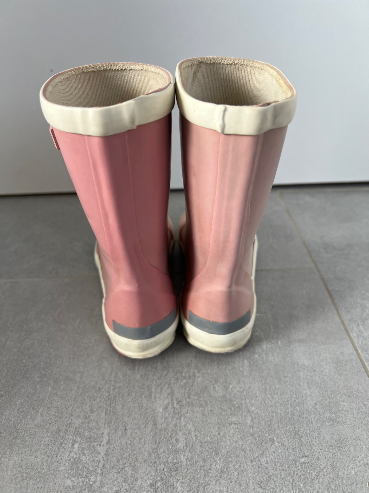 Používané gumáky, stále funkčné, majú len chybičky krásy, na ľavej nôžke sú špinavé od modrej gumy z rukavíc, neide to dole, ale funkcii to nebráni. Nemajú ani stielky. Používali sme bez nich. Dĺžk...