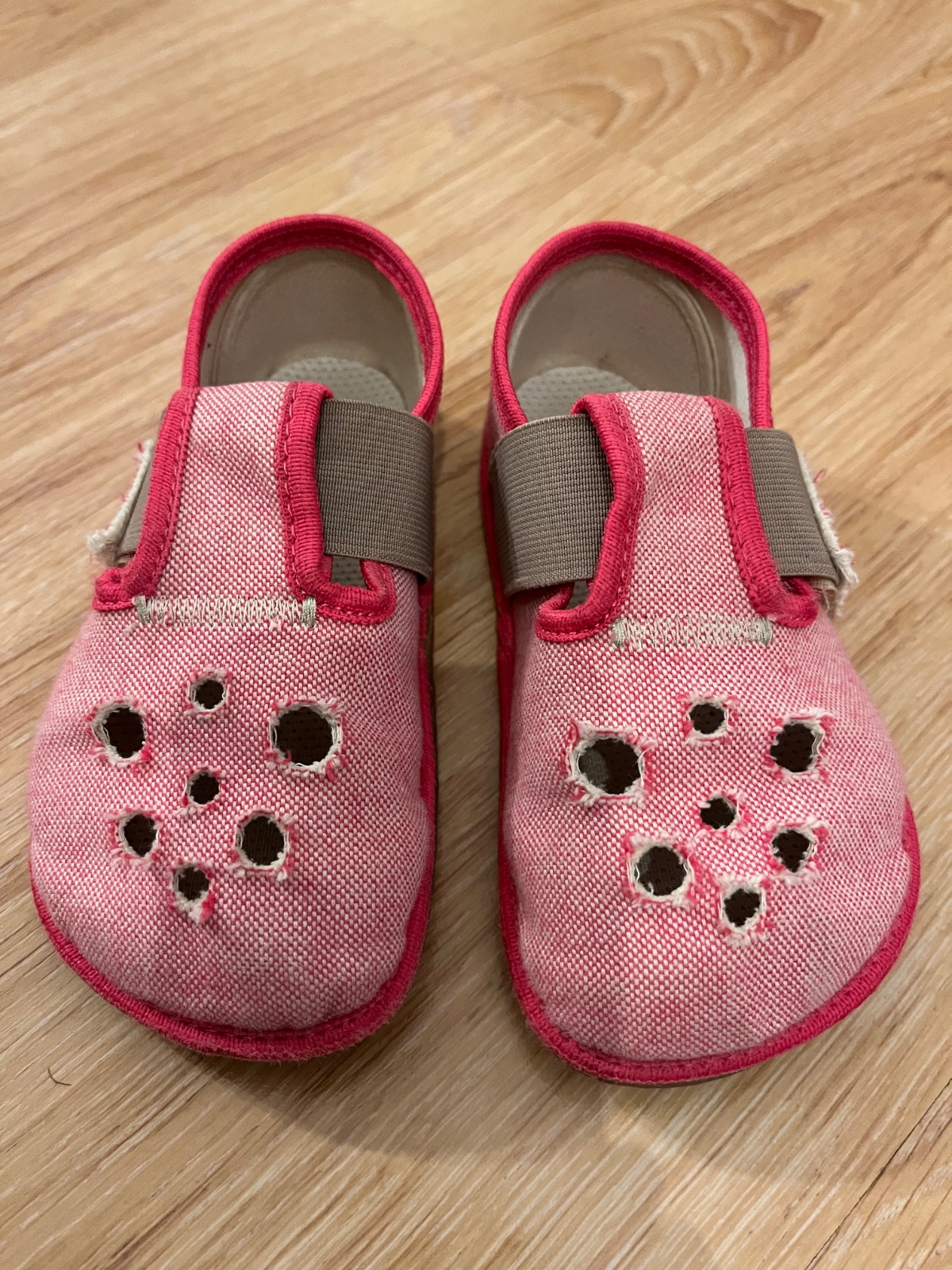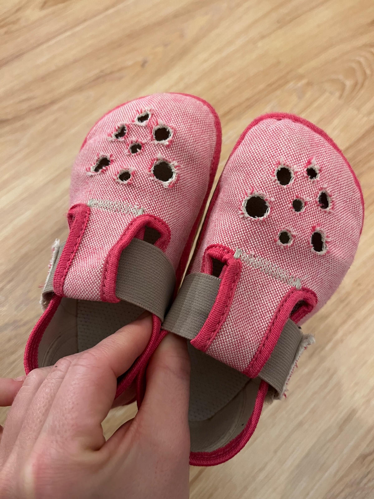 Barefoot papučky, nosené do škôlky, ošúchania, malé predratia (ale nie dierky), na donosenie ešte fajn.
