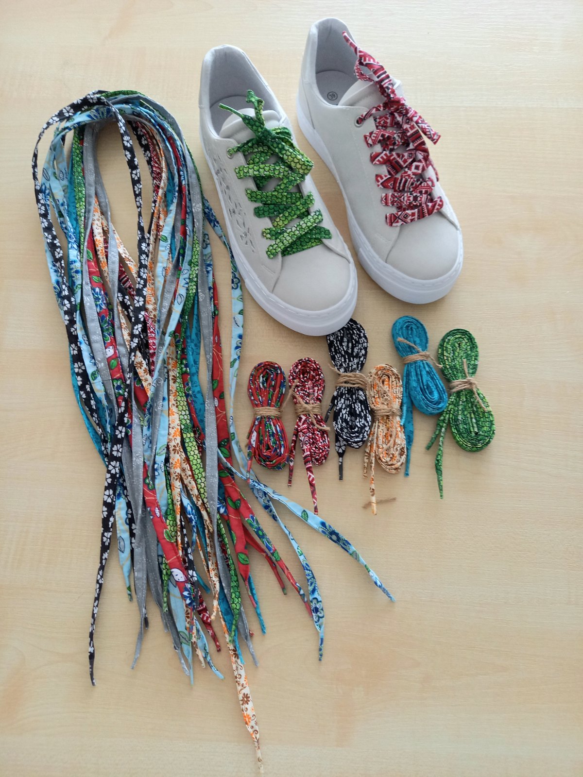 SkladomŠnúrky do topánok z mojejvtvorby. Ušité sú z bavlnených látok.