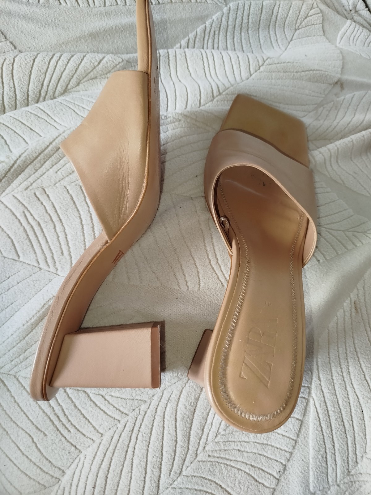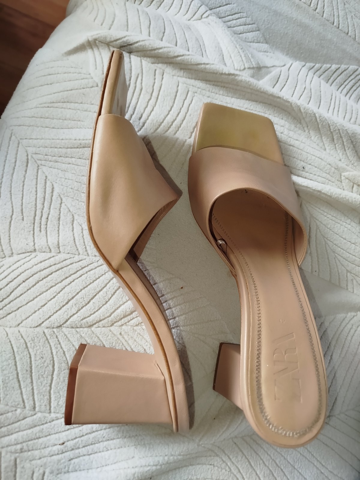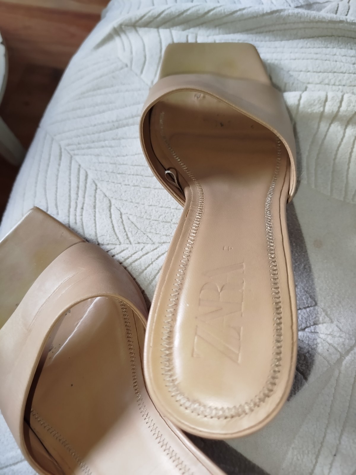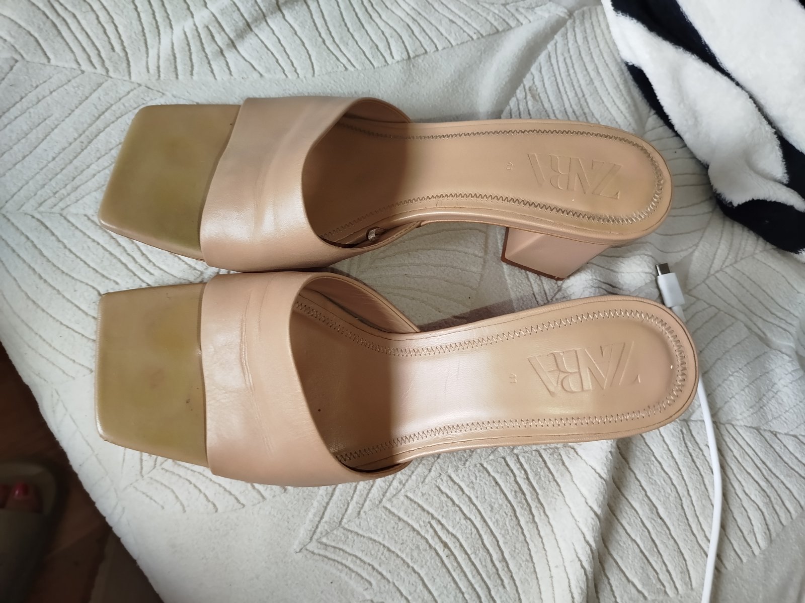 Kožené vsuvky Zara málo nosené bez vážneho poškodenia vnútorná dĺžka 26.5cm opatok 7cm vpredu bol predel medzi palcom a druhým prstom odstrihla som pri nosení nič nevidieť ani nevadí...na posledej fotke vidieť ako to vyzeralo originál.