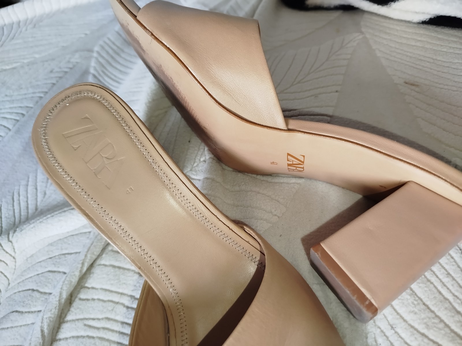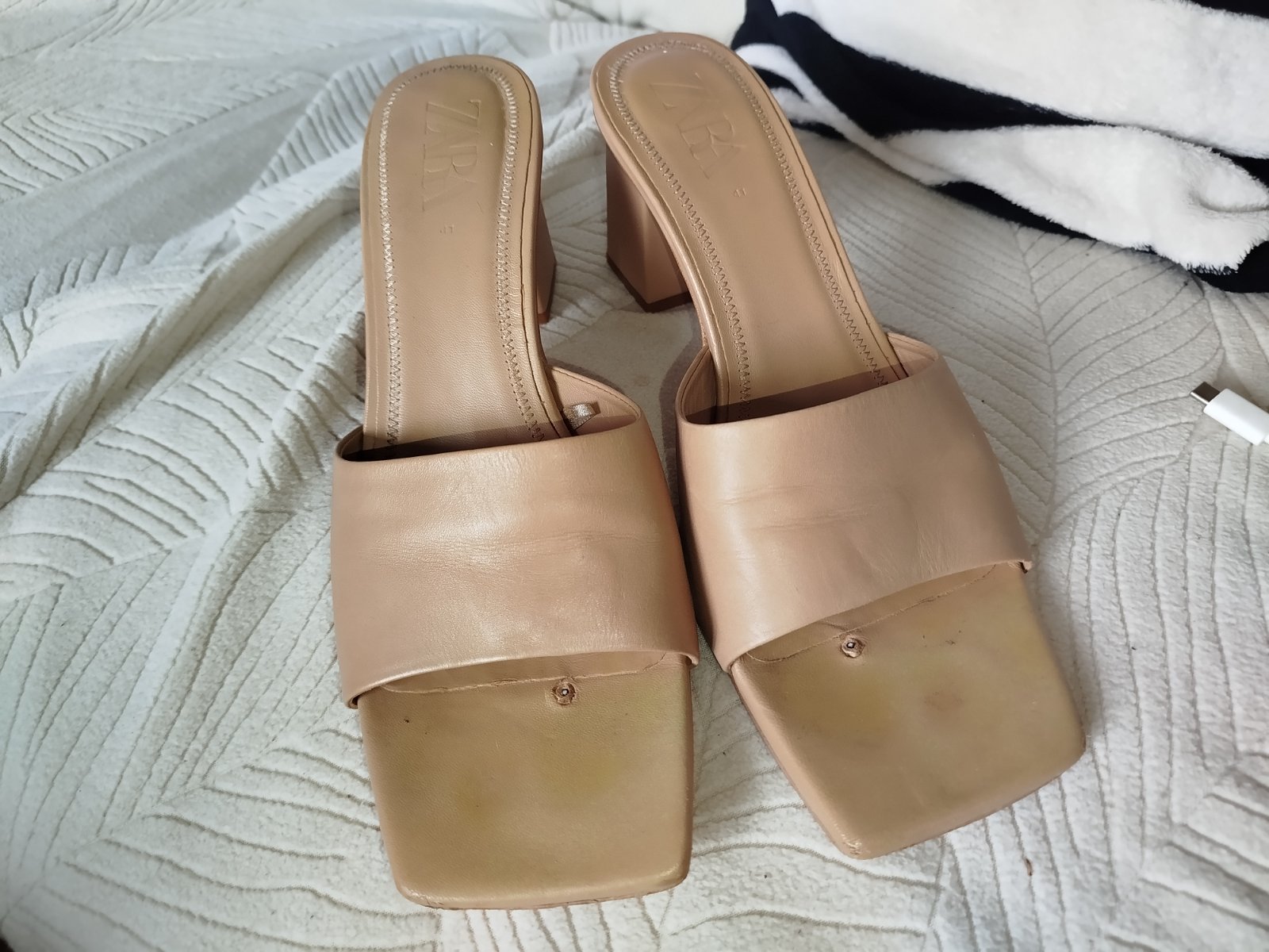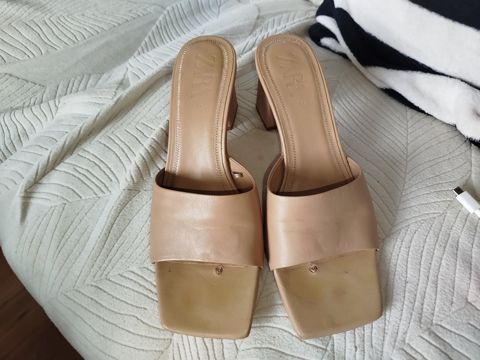Kožené vsuvky Zara málo nosené bez vážneho poškodenia vnútorná dĺžka 26.5cm opatok 7cm vpredu bol predel medzi palcom a druhým prstom odstrihla som pri nosení nič nevidieť ani nevadí...na posledej fotke vidieť ako to vyzeralo originál.