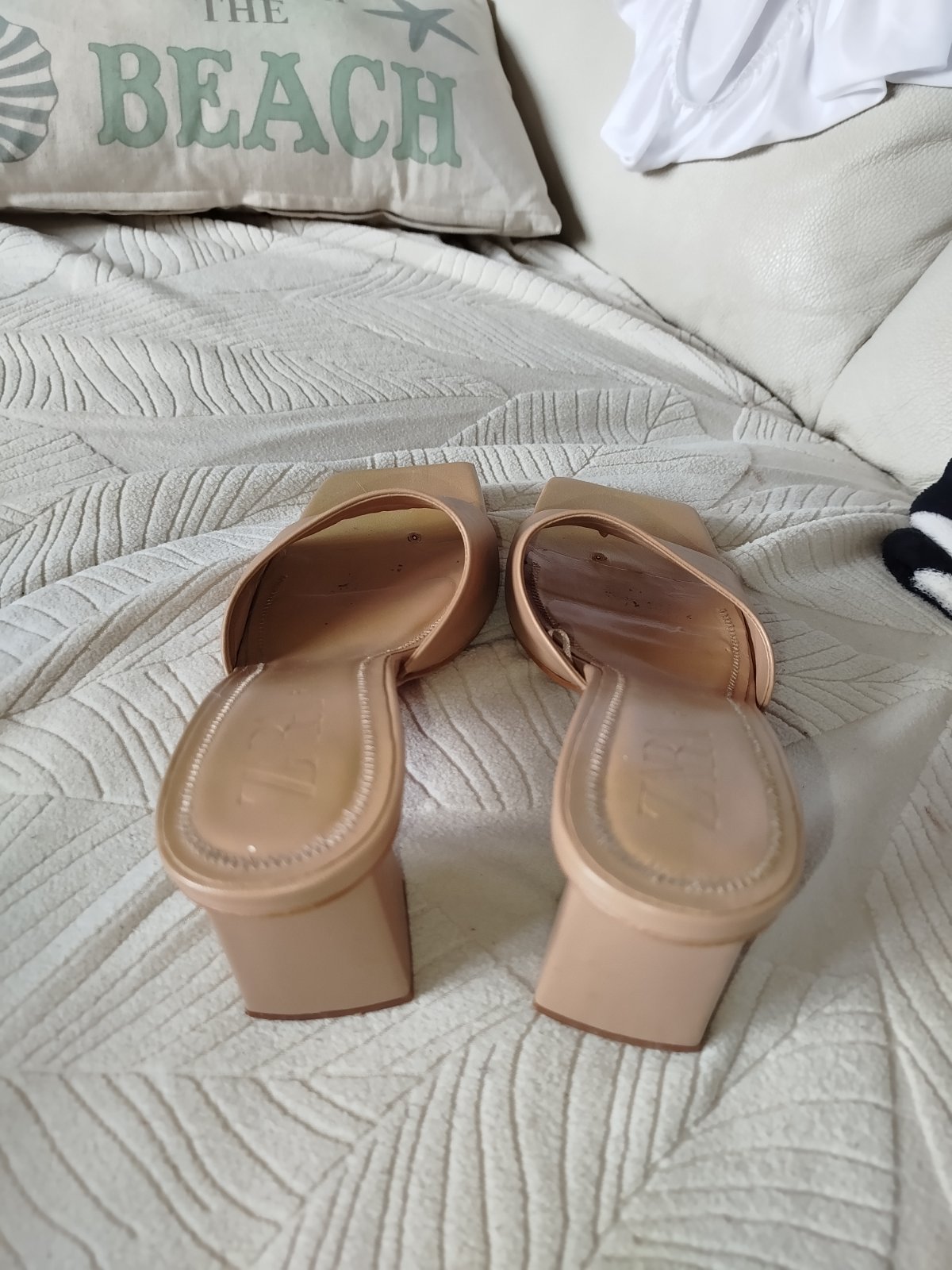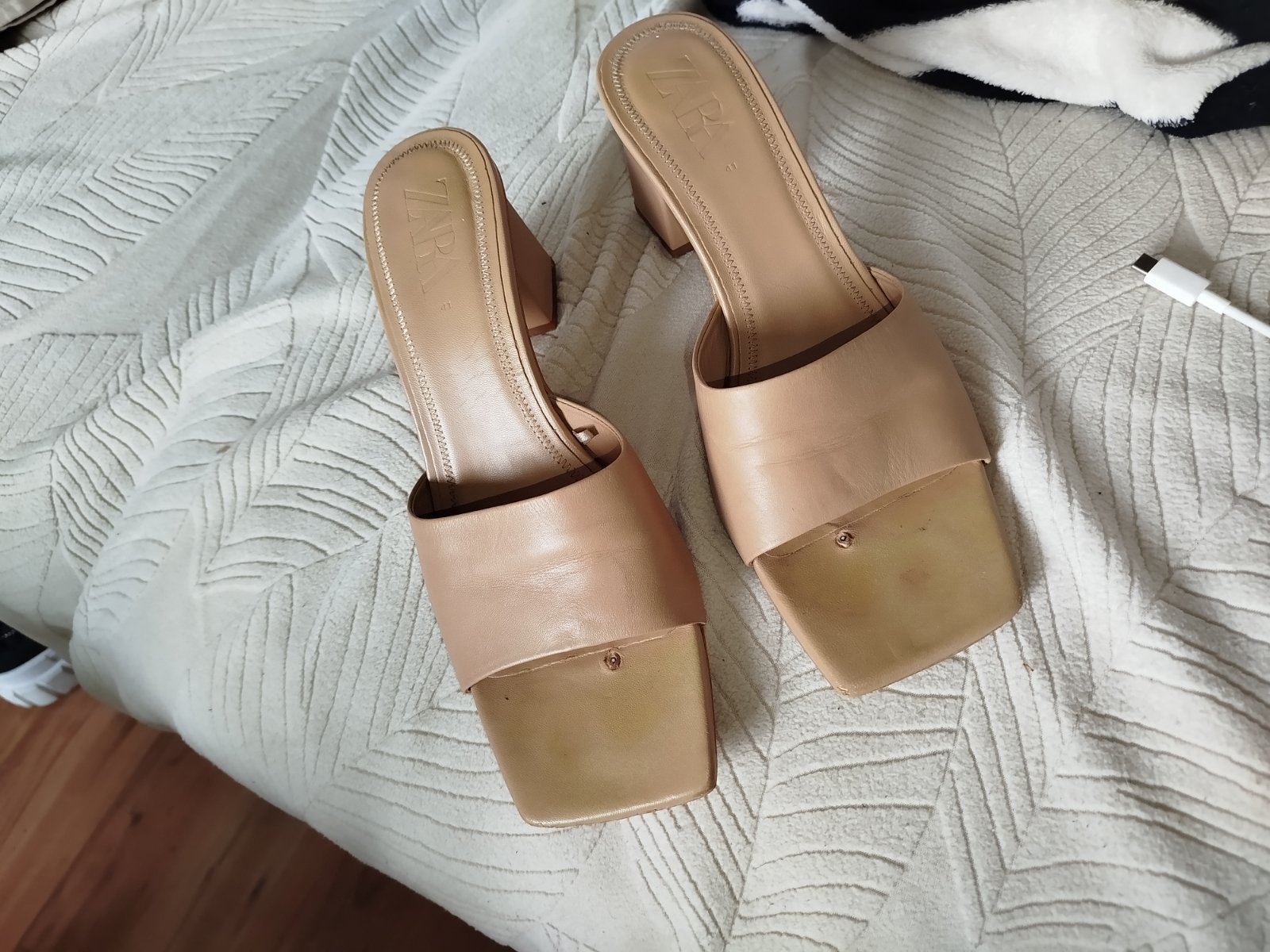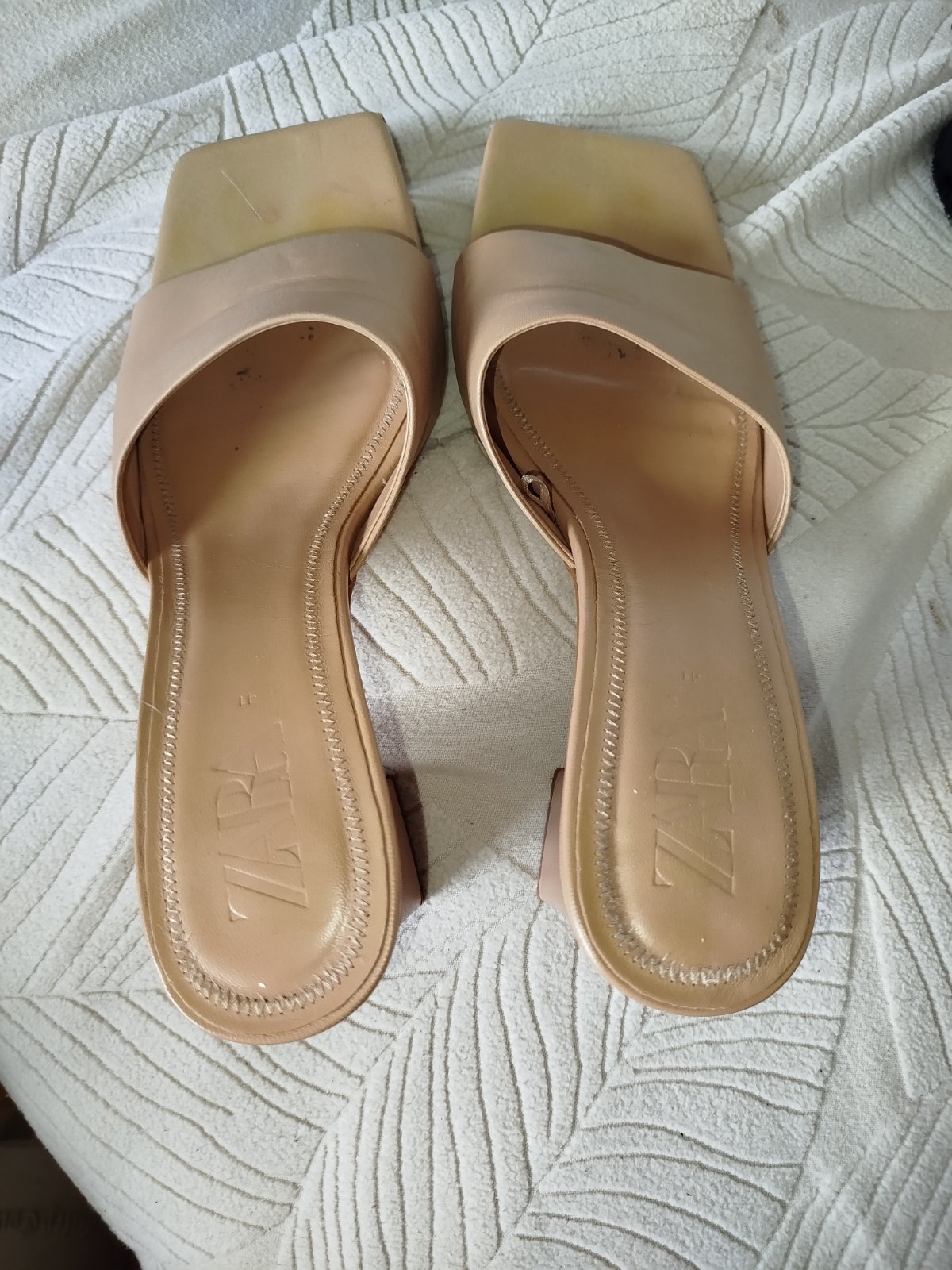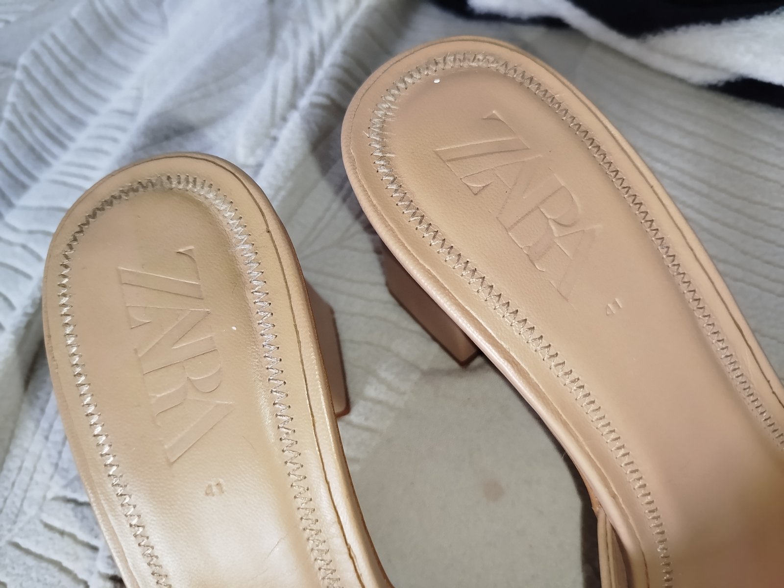 Kožené vsuvky Zara málo nosené bez vážneho poškodenia vnútorná dĺžka 26.5cm opatok 7cm vpredu bol predel medzi palcom a druhým prstom odstrihla som pri nosení nič nevidieť ani nevadí...na posledej fotke vidieť ako to vyzeralo originál.