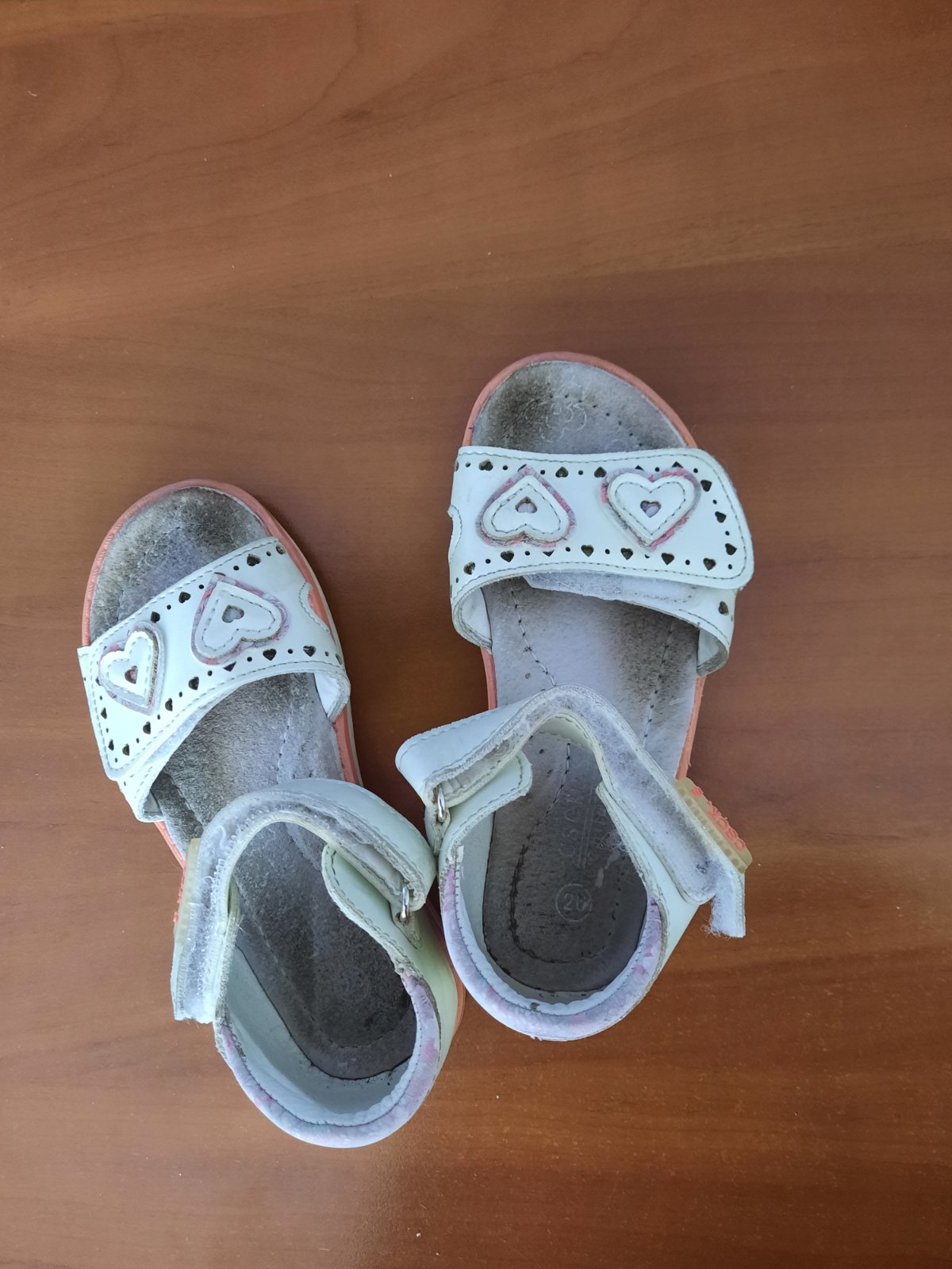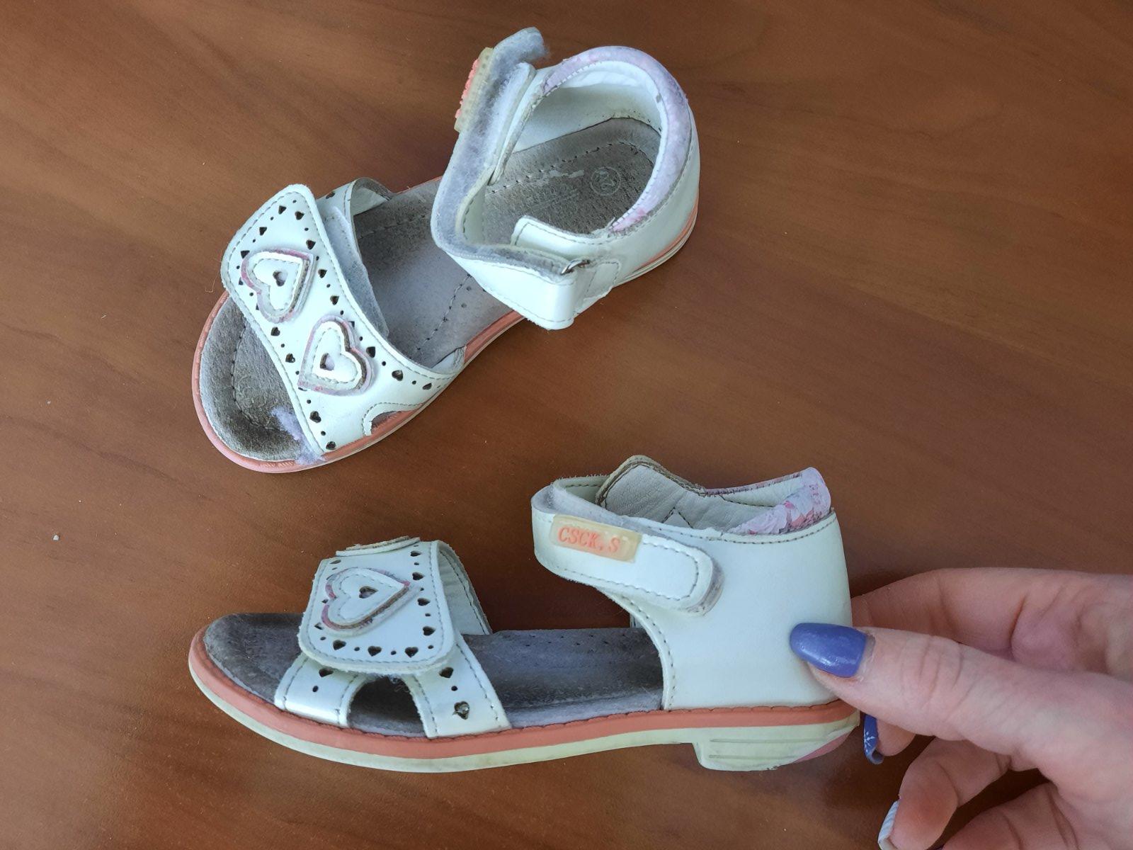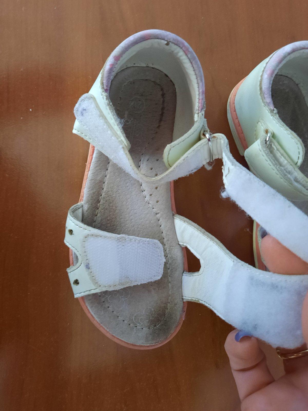 Pekné dievčenské kožené sandále so zapínaním na suchý zips. Super držia nohu. Podrážka je trošku z boku vyšúchaná. Vnútro je mierne ušpinené, ale dá sa vyčistiť. Ešte ich prečistím :-)