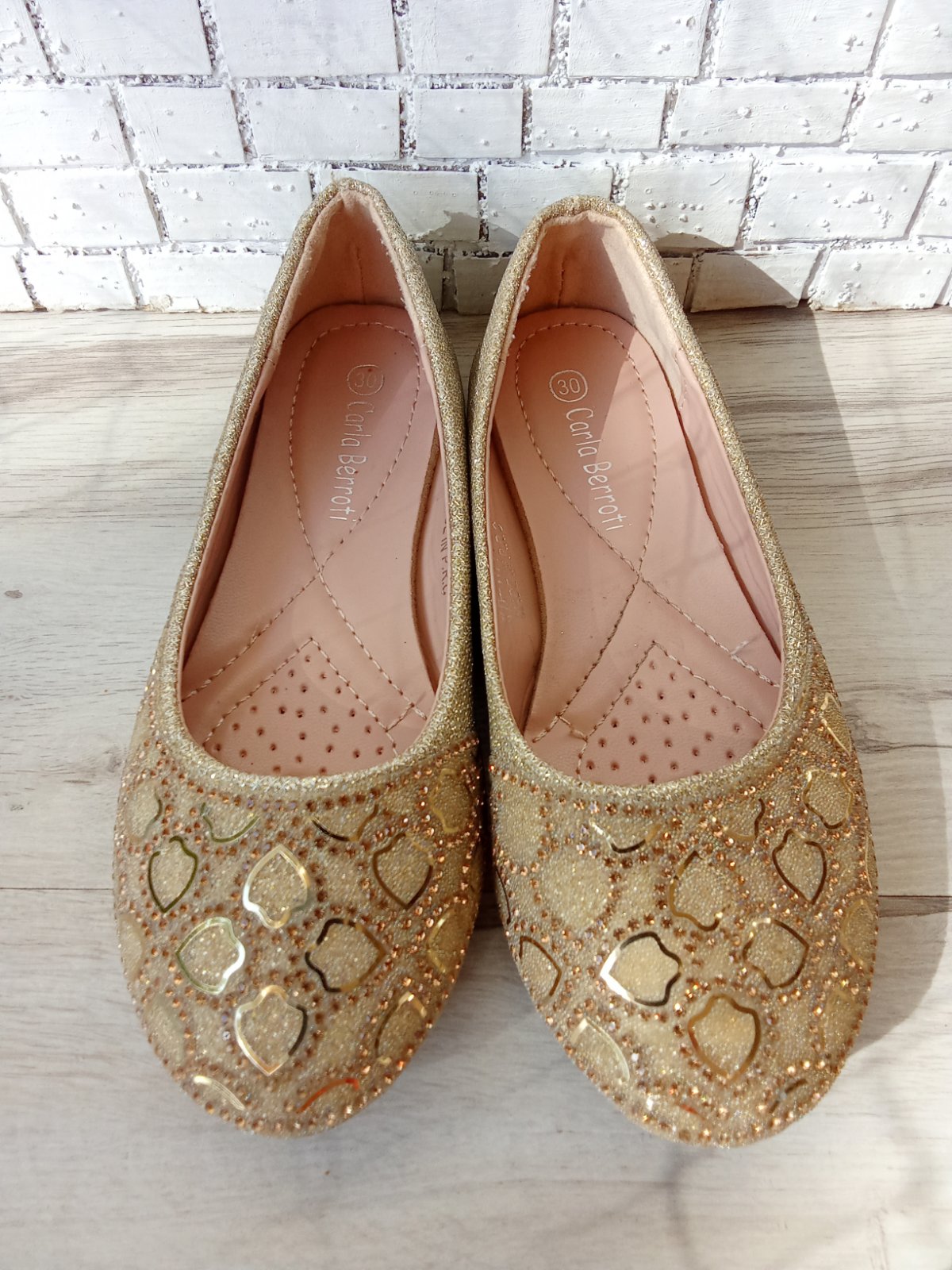 Predám dievčenské zlato-trblietavé baleríny, krátky čas nosené. Bez poškodenia. Značka Carla Berroti.