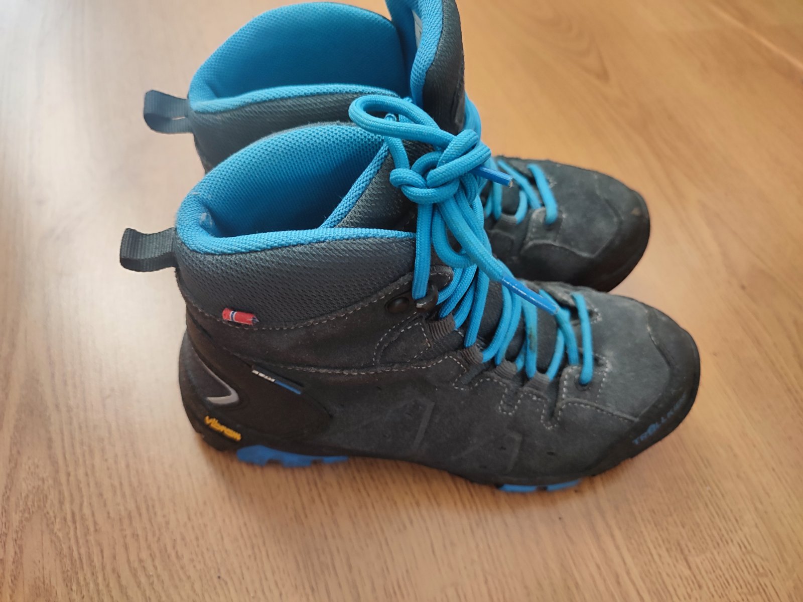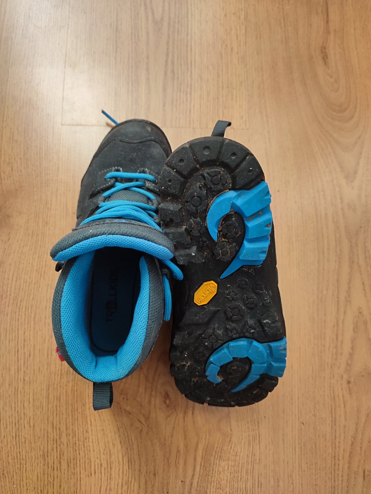 Detské turistické Vibramy, značka Trollkids, veľkosť 33 (VD 20,5), zaväzovanie na šnúrky. Obuv je kožená, podrážka Vibram, ideálne na horskú turistiku.