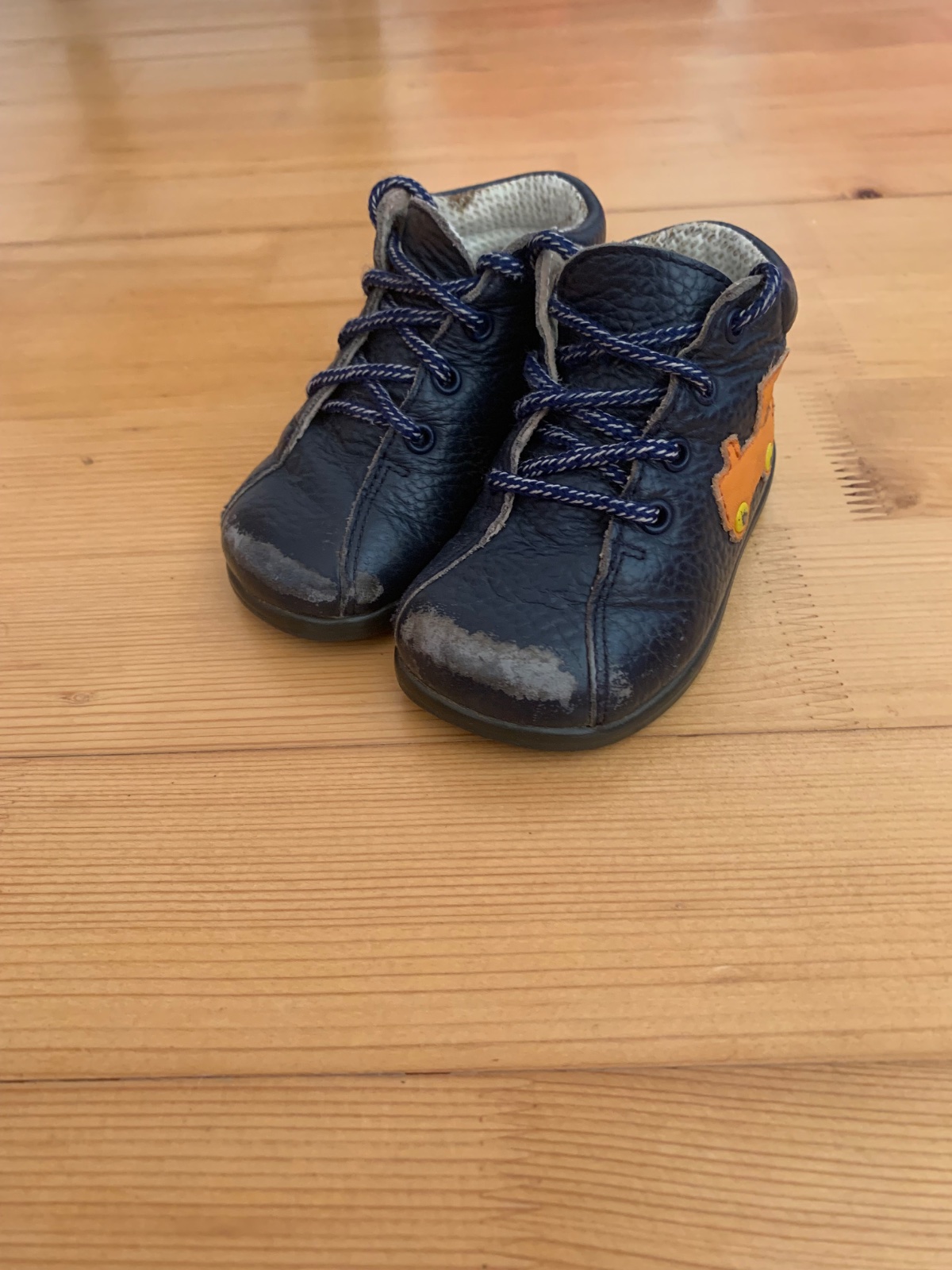 Nevychodené pevnejšie topánky pre začínajúcich chodcov. Sú len trochu ošúchané, keďže chodec bol naozaj začínajúci... Ale inak nosené naozaj málo 1 dieťaťom na striedačku s inými. Vnútorná dĺžka 13...