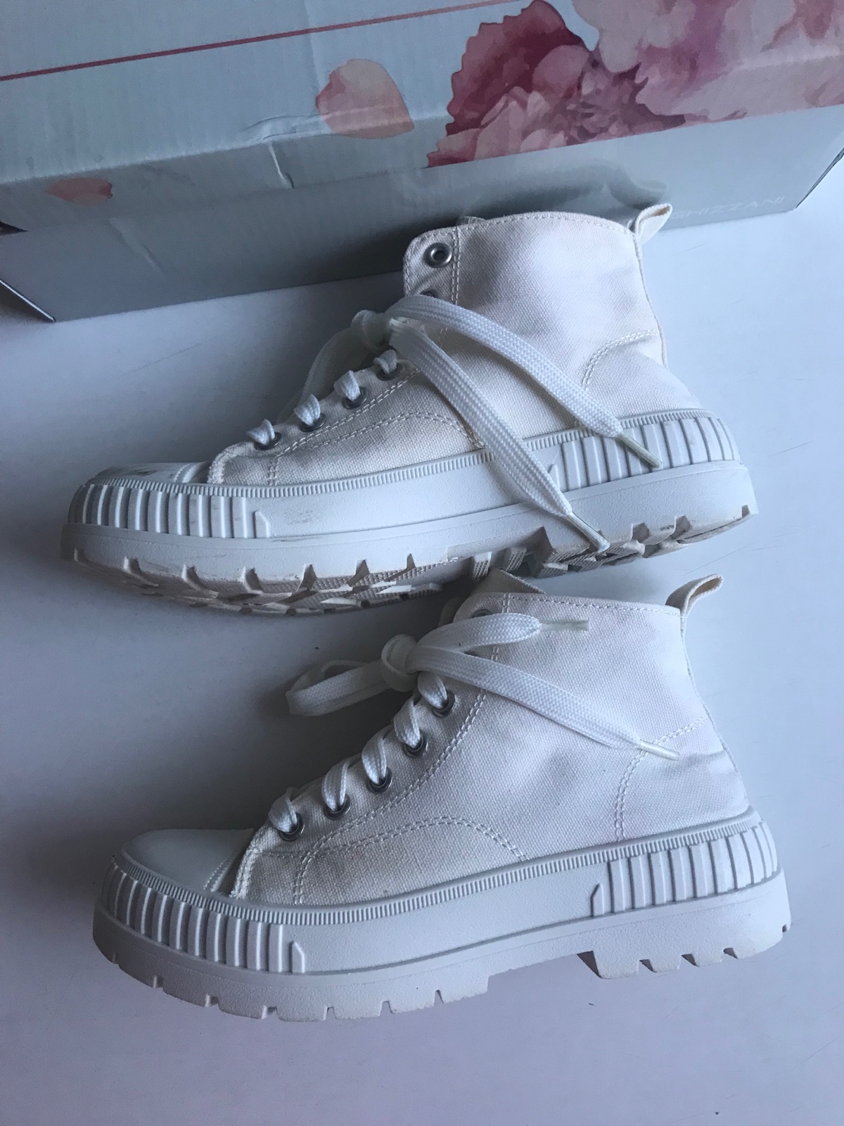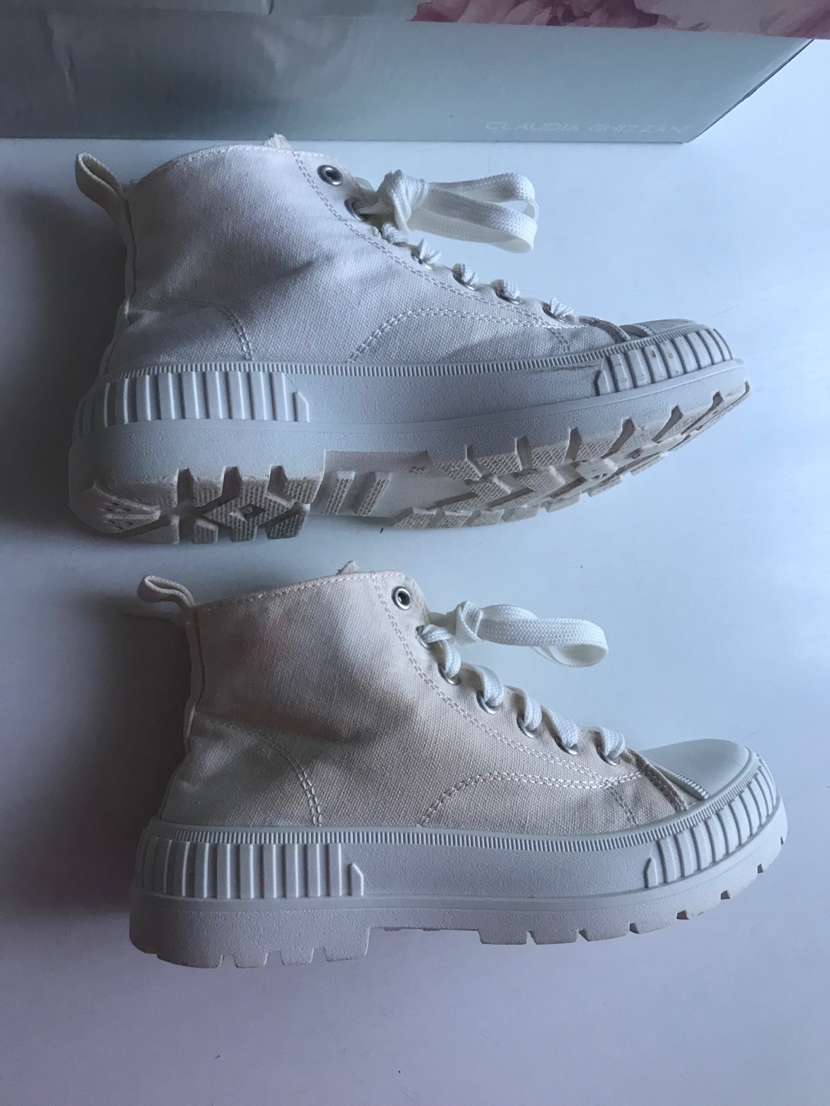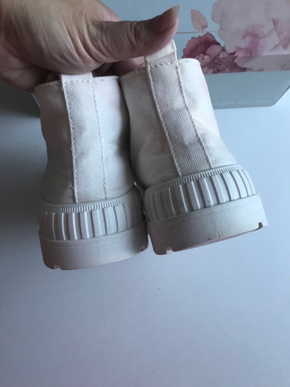 Tenisky v dobrom nosenom stave - všetko je na foto. Šnúrky sú originál, dcéra mala navlečené svoje obľúbené. Farba je prírodná biela, nie snehobiela. Pri fotení som našla svetloružový fľak, neviem od čoho - inak sú v pohodičke, ešte urobia parádu. Vnútorná dĺžka nadoraz - 22,9 cm. Kupované v Deichmann, priložím aj blok. Odporúčam👍👍👍