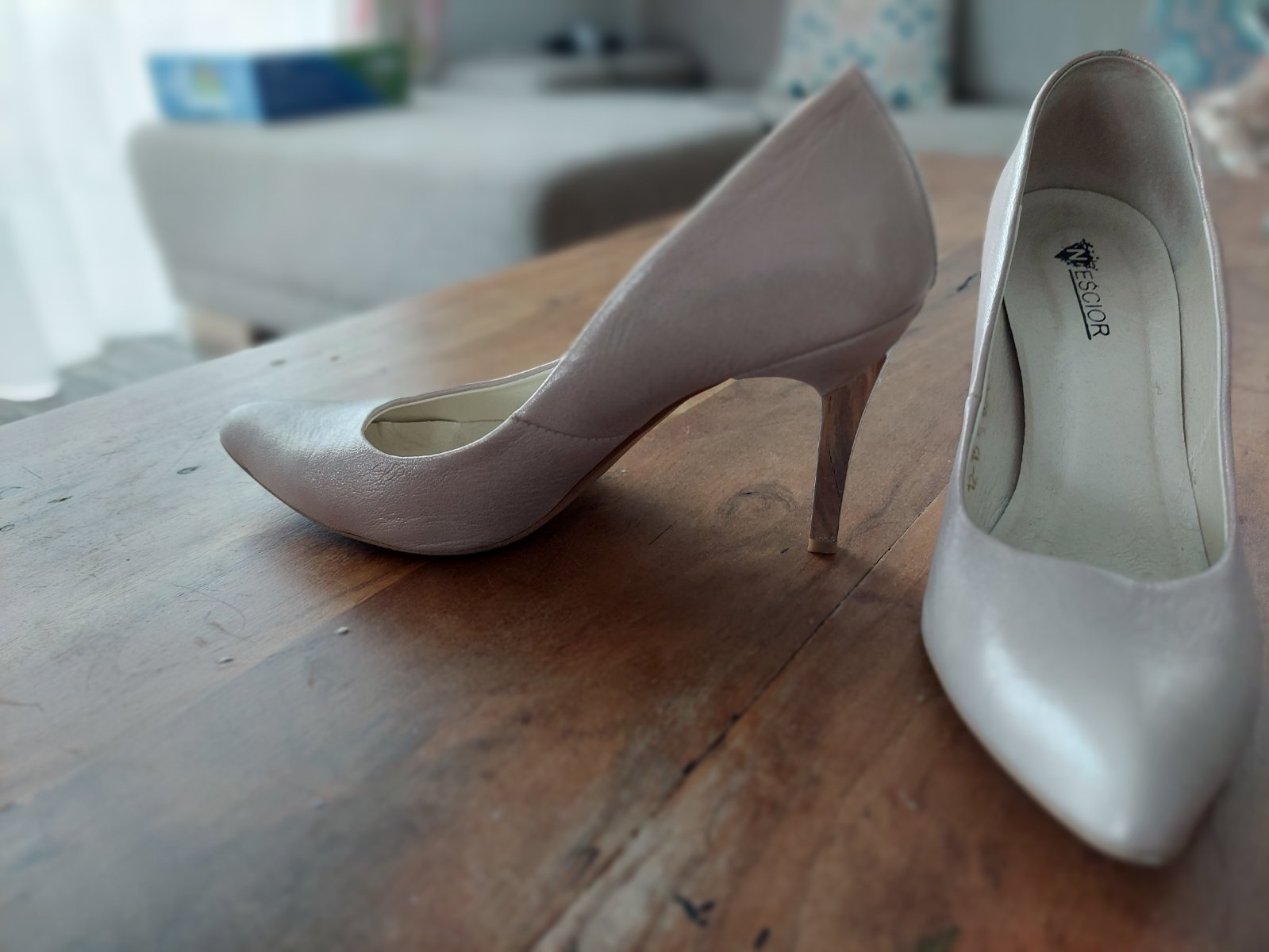 Krásne , kožene, obute 2x. akoby perlový povrch, pudrove, do trblietava, luxusné.
