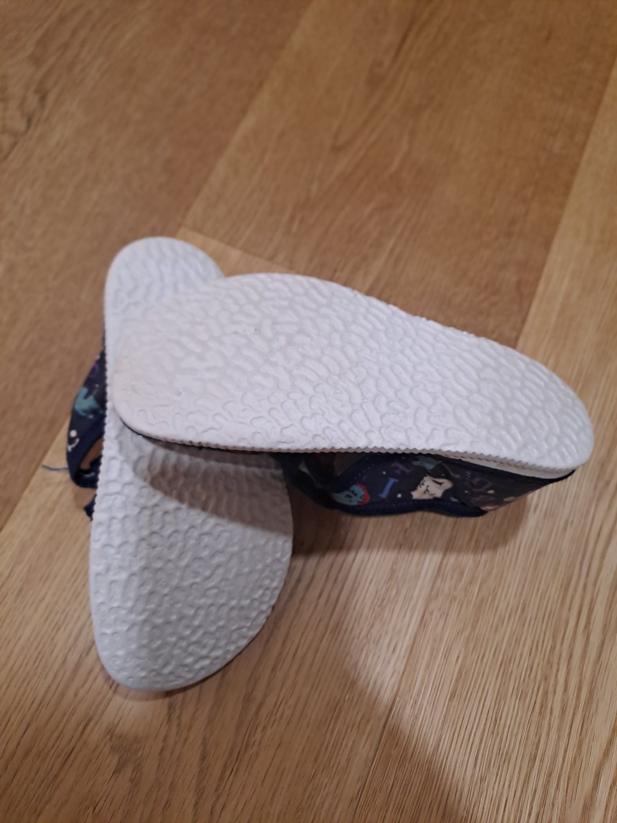 Papucky RAK tmavomodrej farby s pismenkami nosene len syncekom, neschodene, lepaky funkcne, 2 x prane v pracke, farba je miestami vyprana a predok okopany, vid foto. Na doma alebo k babke este posl...