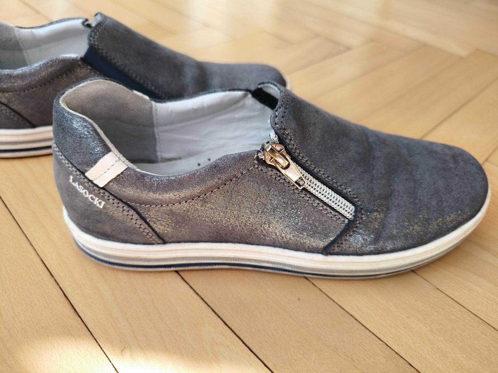 Pekne kvalitné strieborné topánky,pár krát obuté,avšak ako nové,nepoškodené.