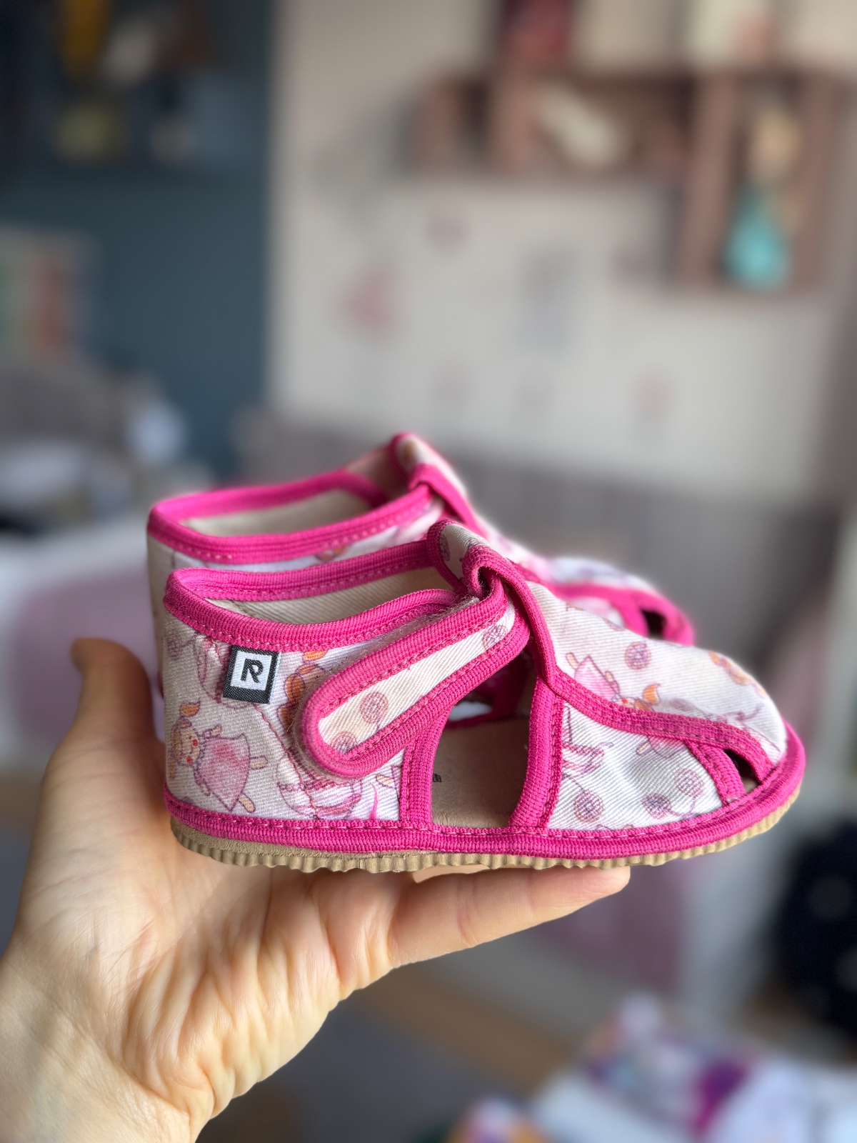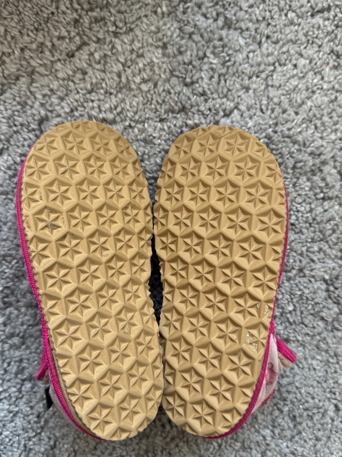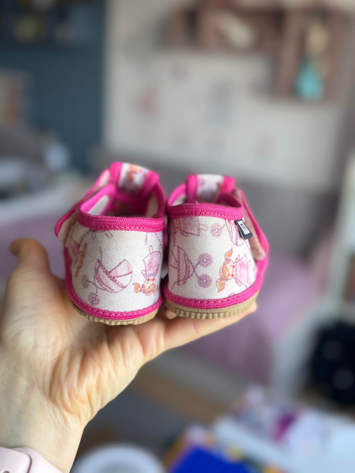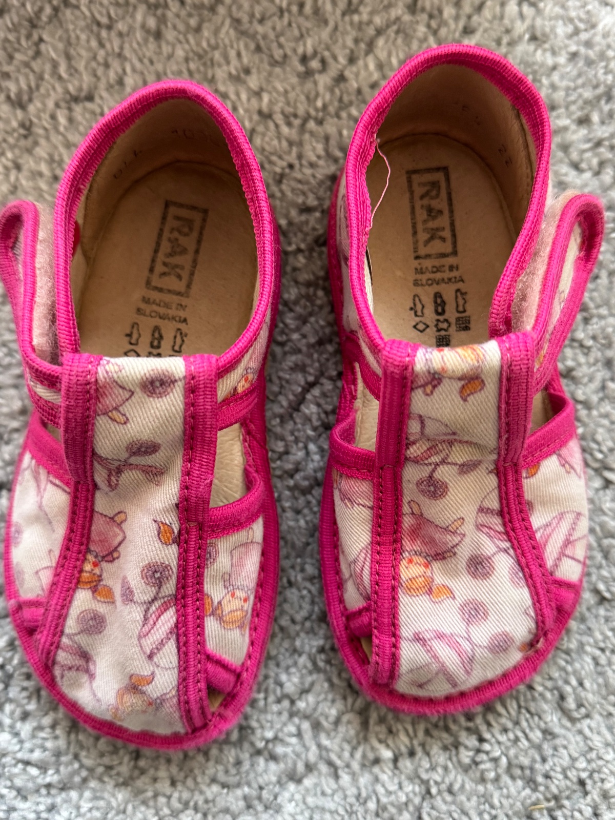 Pekný nosený stav, kúsok cverničky sa pára, viď na foto, možno to však prišiť. Sucháče ešte držia ale časom ich bude treba vymeniť, šikovná mamina zvládne. Všetko zohľadnené v cene. Papučky sú z inovatívnej rady, majú dostatok predného priestoru pre pršteky a sú ohybné, s pružnou gumenou podošvou z prírodného kaučuku, s protišmykovým efektom. Sú fakt super. VD: 14,9 cm, VŠ: 6,3 cm