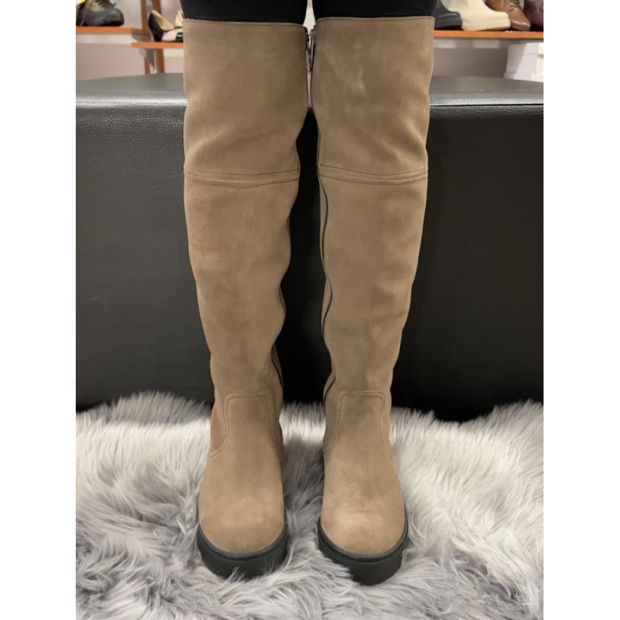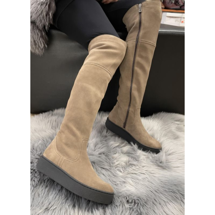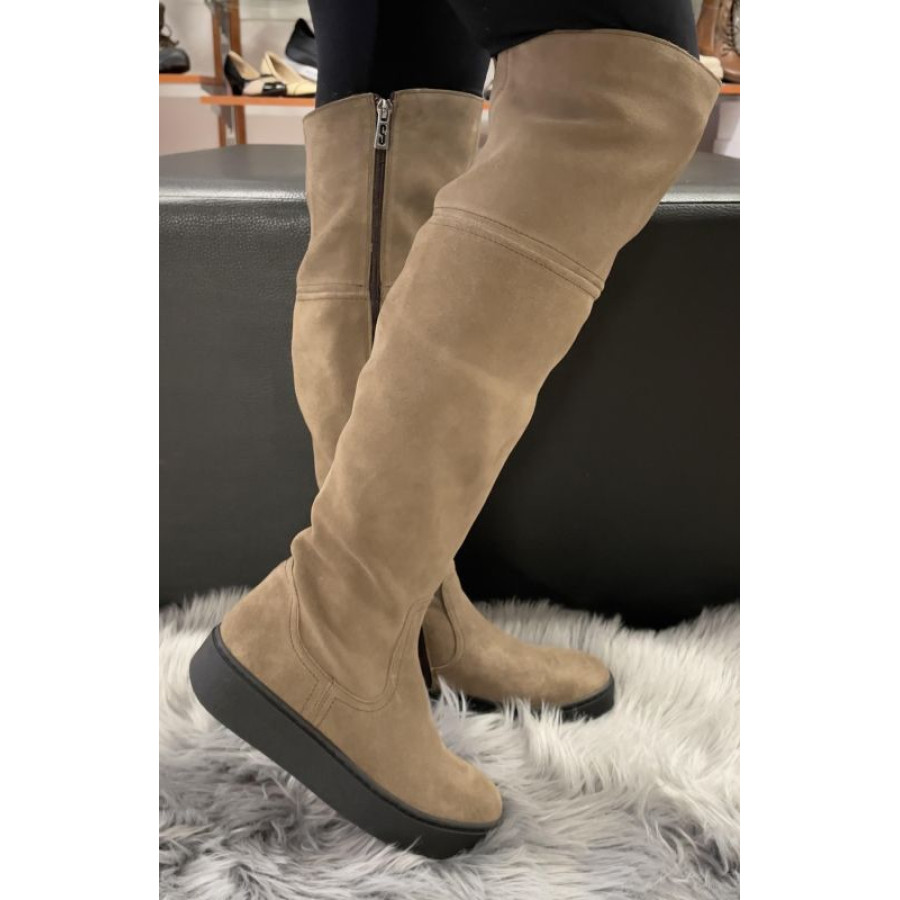 Pohodlné a štýlové velúrové čižmy s dĺžkou nad kolená od značky Simen, v ktorých sa budete cítiť veľmi pohodlne. Majú jednoduchý dizajn, dokáže však priviesť pozornosť. Dlhá rovná línia čižiem opticky zoštíhľuje nohy. Béžová farba sa skvelo hodí skoro ku každému jesennému a zimnému outfitu, ku kabátu aj kožušine. Ideálny model čižiem na chladné dni, s ktorými môžete hrdo vyjsť do ulíc, na prechádzku či do práce. Čižmy majú vnútornú podšívku, zapínanie na zips a hrubšiu tmavú podrážku.