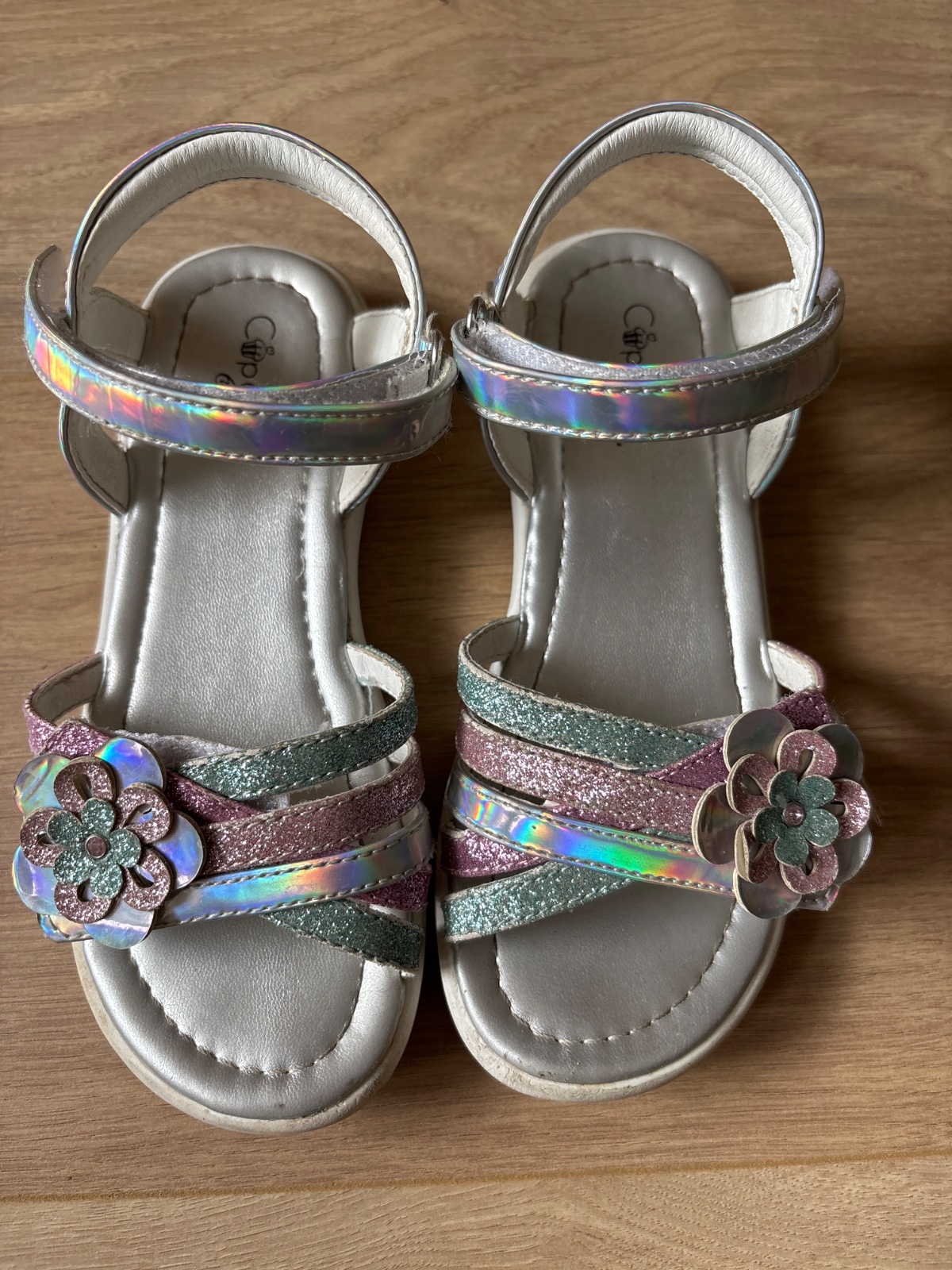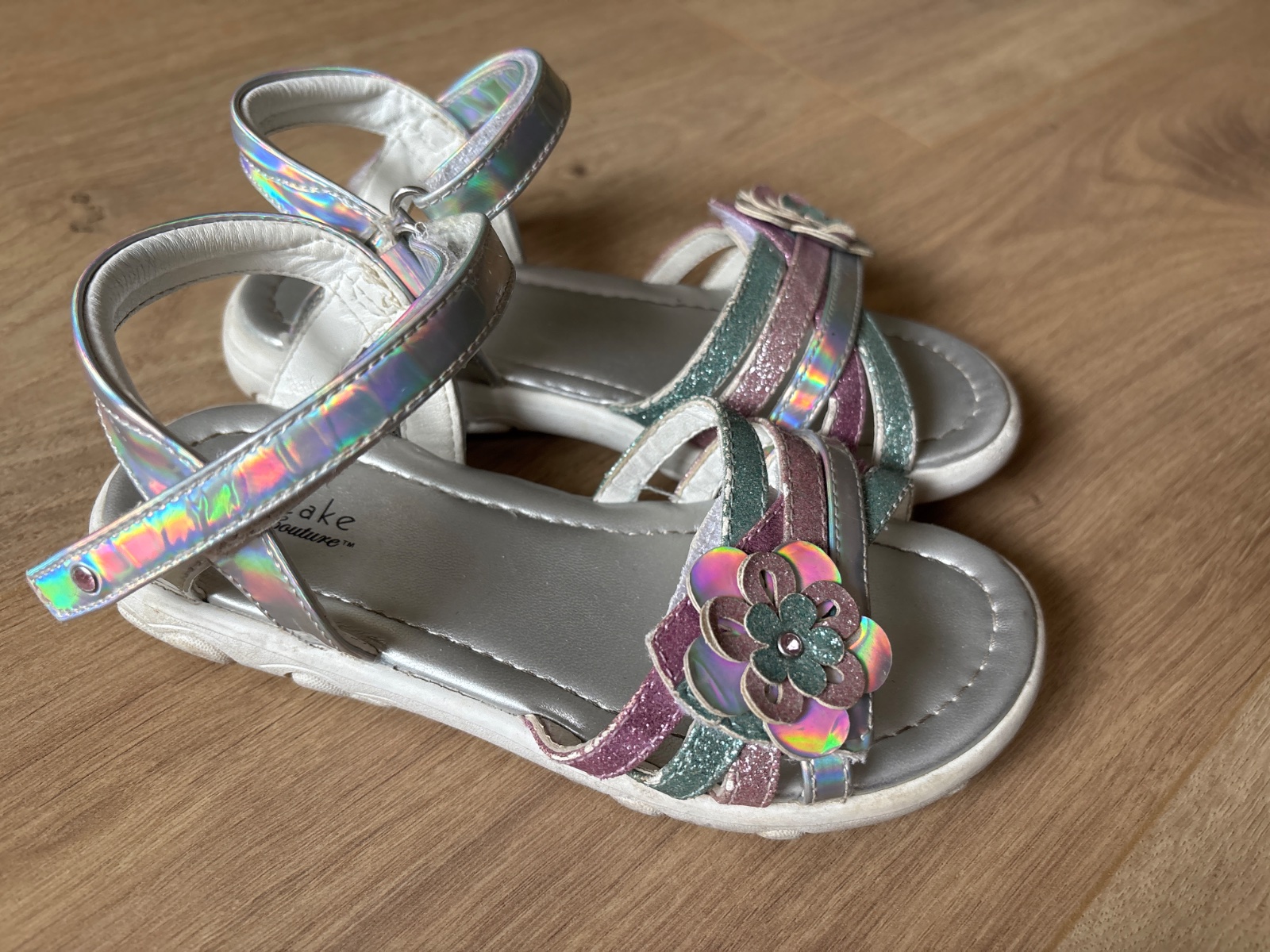 Lesklé,pútavé detské sandále,nosenie len do kostola,nastaviteľné na suchý zips aj vpredu aj vzadu.Suchy zips drží pekne, nie je opotrebovaný. Bez poškodenia.