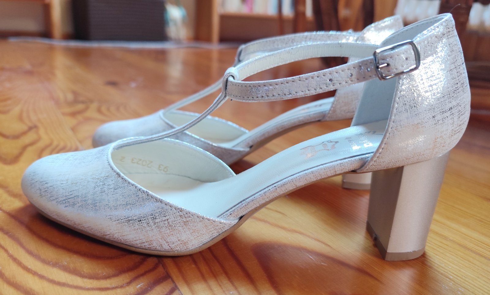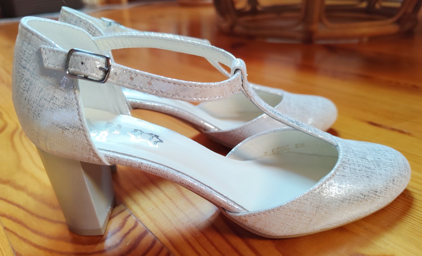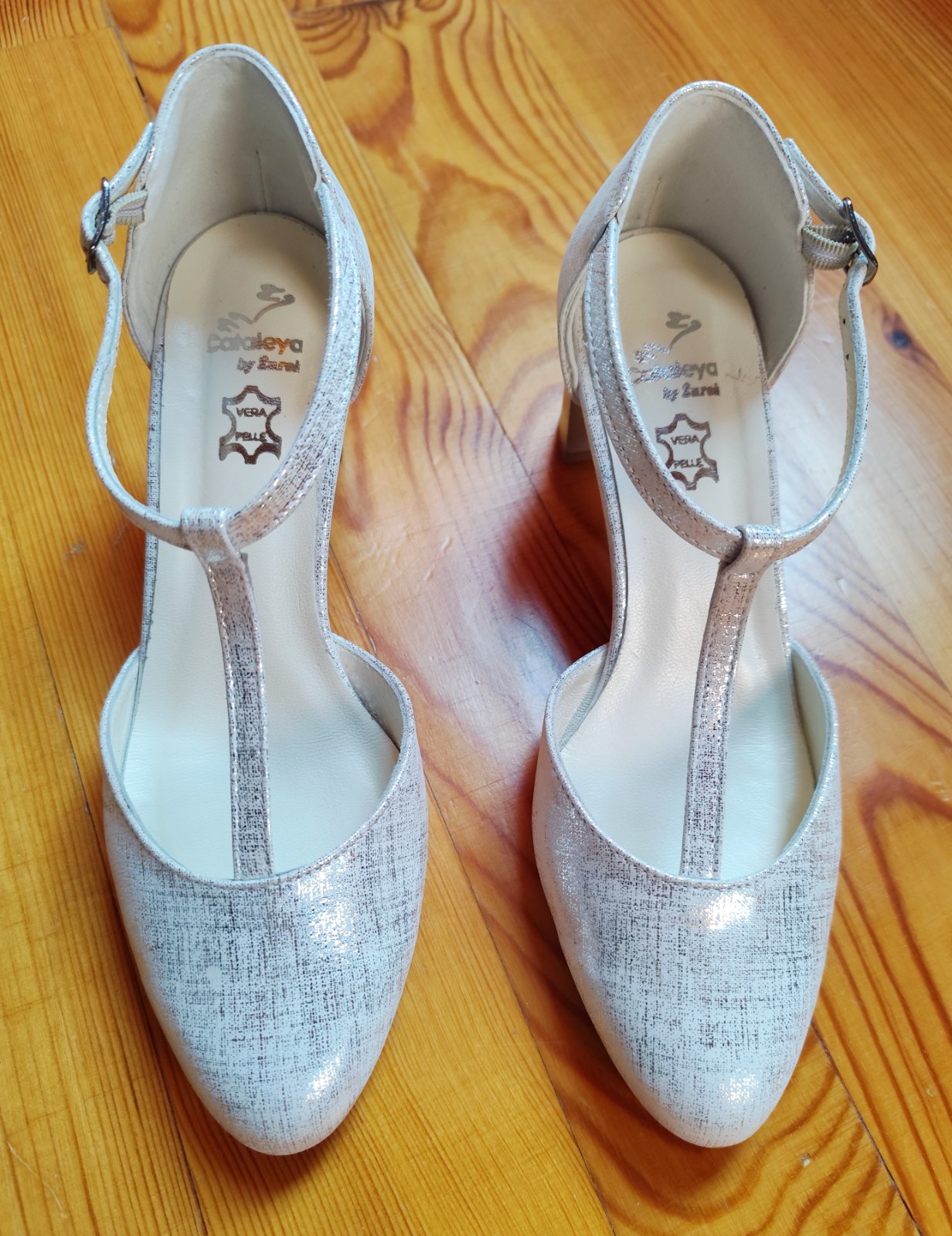 Strieborné dámske spoločenské / vychádzkové / tanečné topánky. Raz použité, vo výbornom stave, bez poškodenia. Predávam v pôvodnej škatuli, spolu s náhradnými pätníkmi (viď. fotografie).