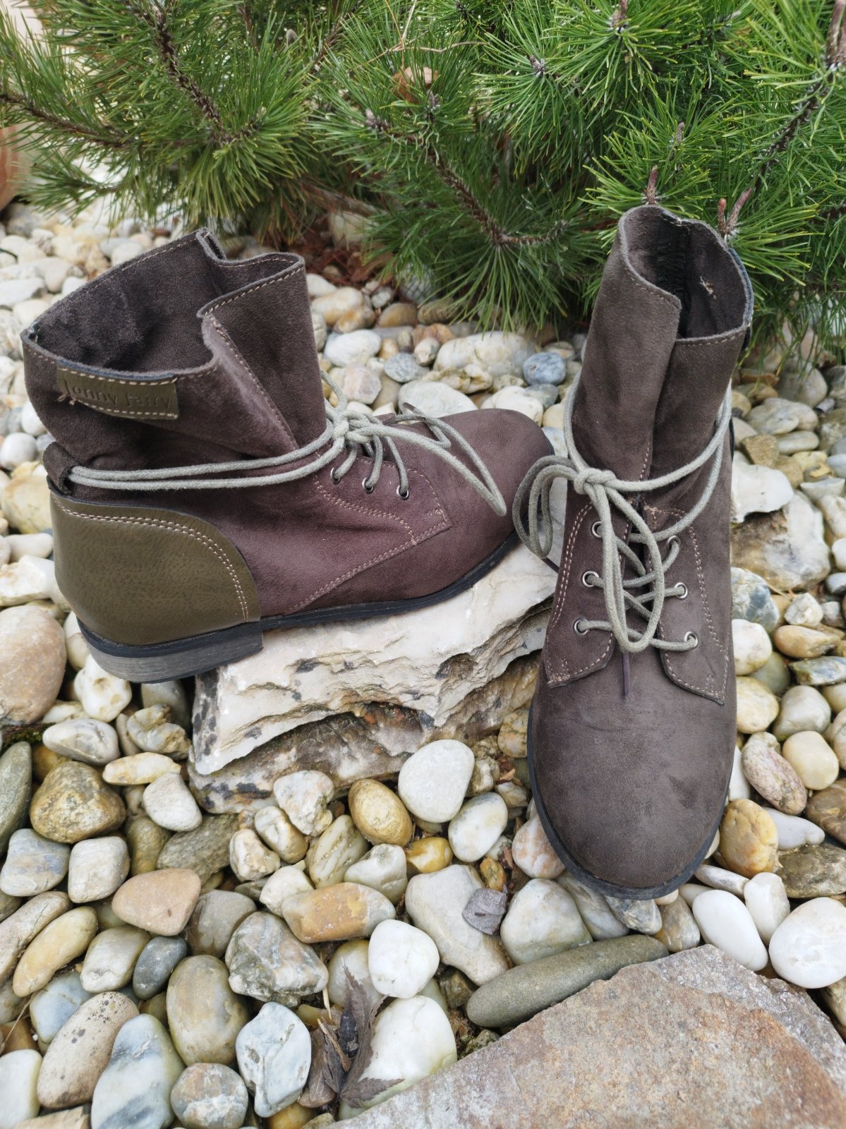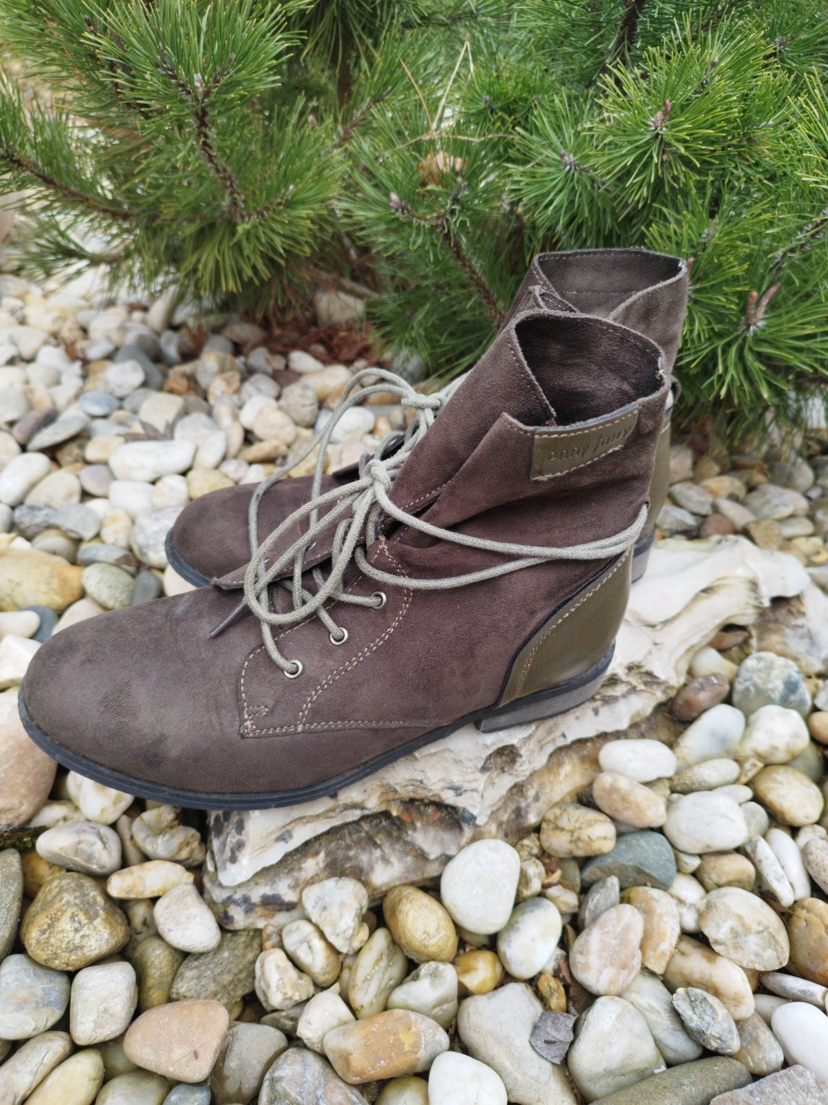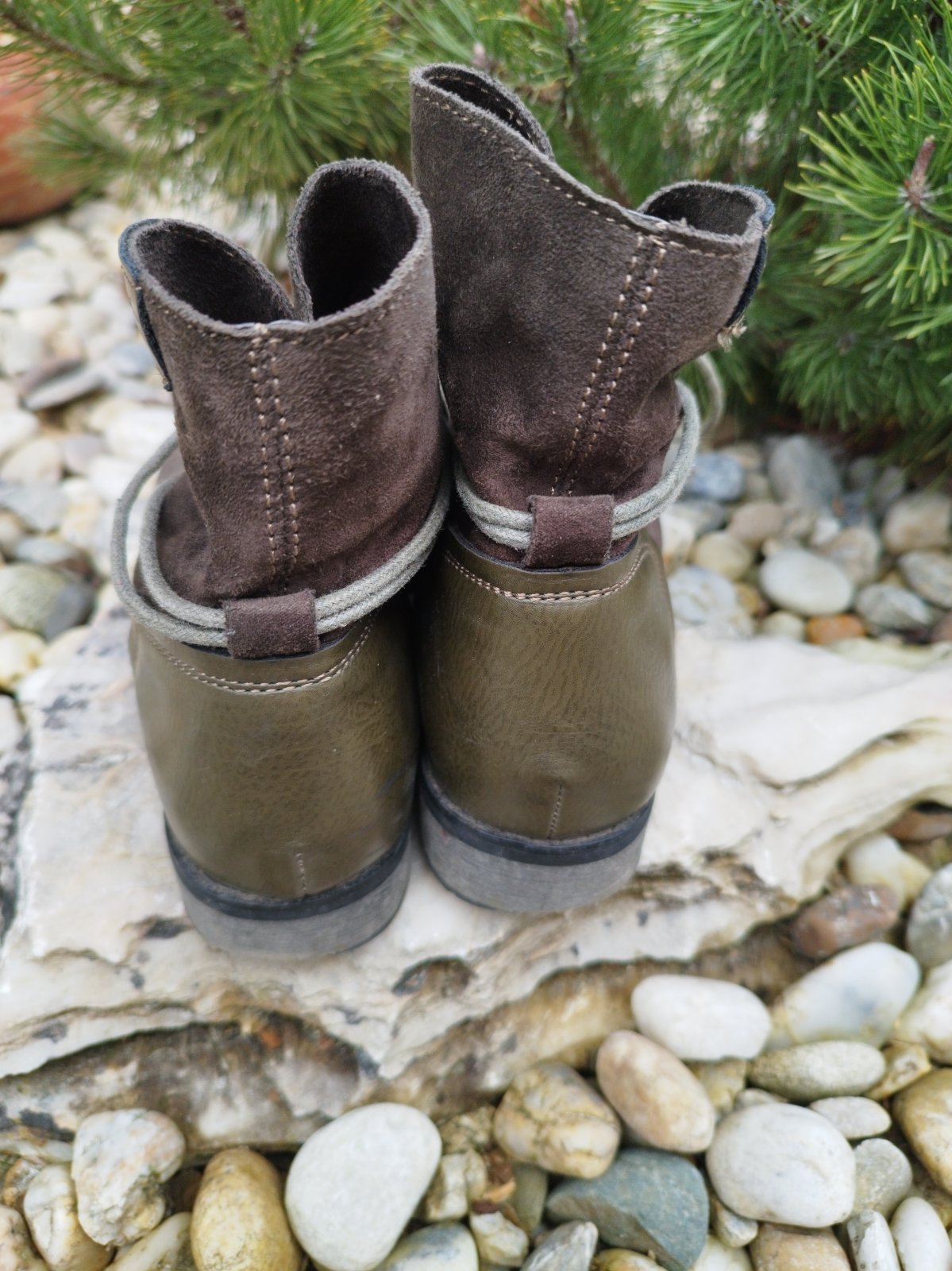 Krásne členkové prechodné topánky, farba kombinovaná khaki/tmavohnedá. Podpätky sú už trošku obnosené, treba ich vymeniť. Inak sú topánky v super stave.